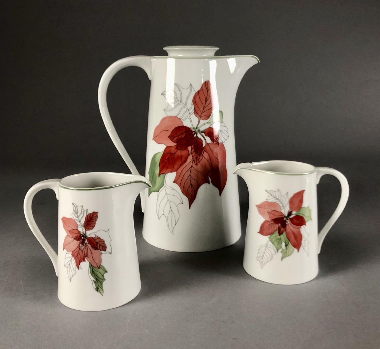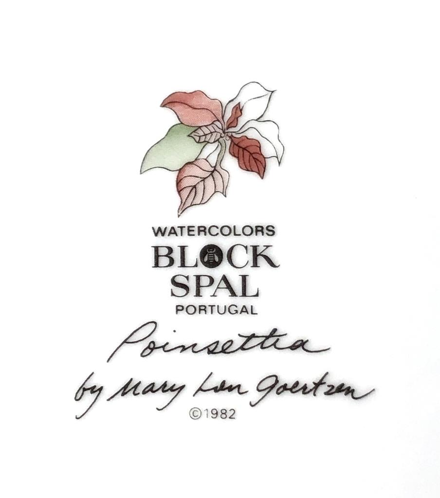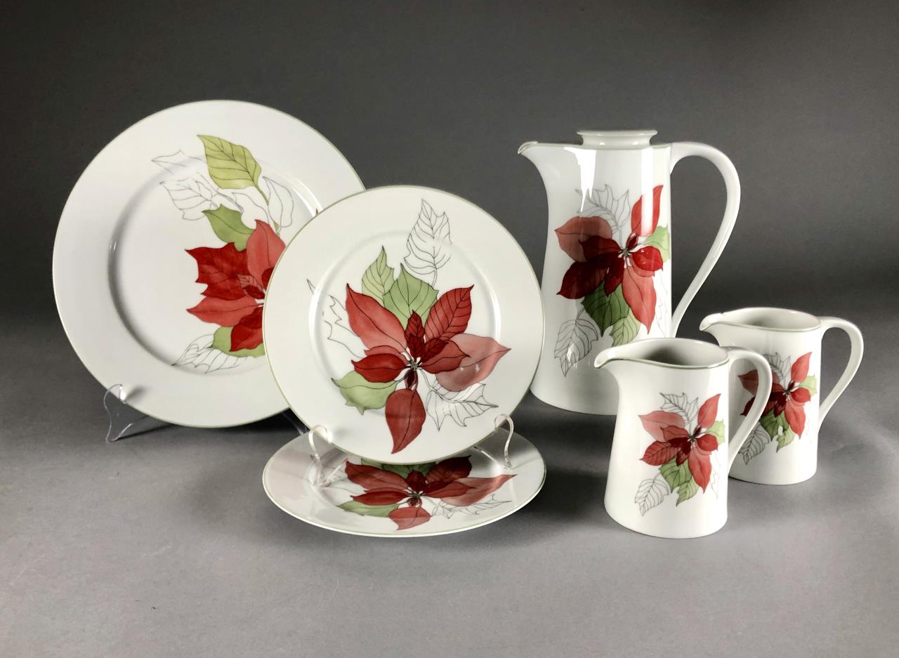 Six pieces of Mid Century Modern, Block China (Portugal), in the “Red Poinsettia” pattern (introduced in 1984 and discontinued in 1998), from the Watercolors series, by Mary Lou Goertzen (American, 1929 – 2020), includes: (1) 10-1/2″ (10-5/8″) dinner plate; (2) 8″ salad plates; (1) 9-3/8″ coffee pot with lid; and (2) 4-1/8″ creamers. CONDITION: Some pieces show signs of use and wear such as knife scratches and loss of pattern in some areas. There is a chip on the rim of one of the creamers, please see the last photo. SHIPPING: In-House Shipping Available. Please read our Shipping Policies and Terms and Conditions