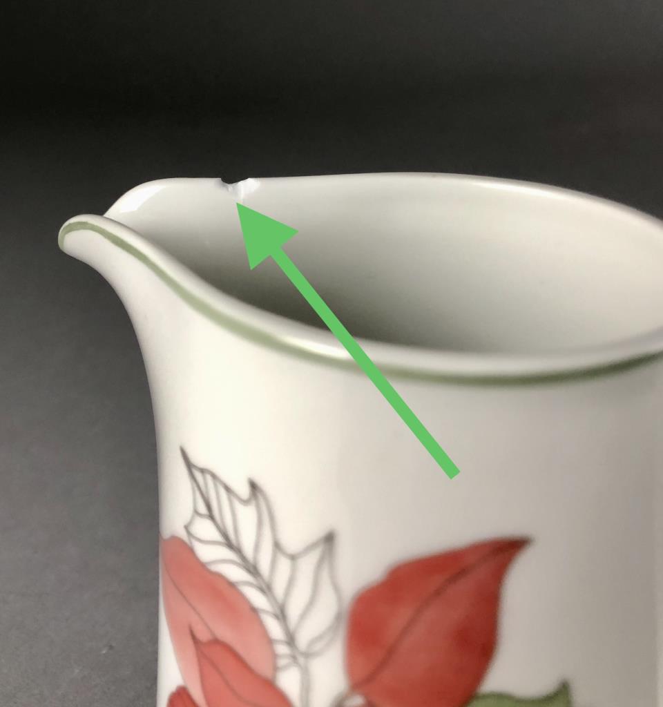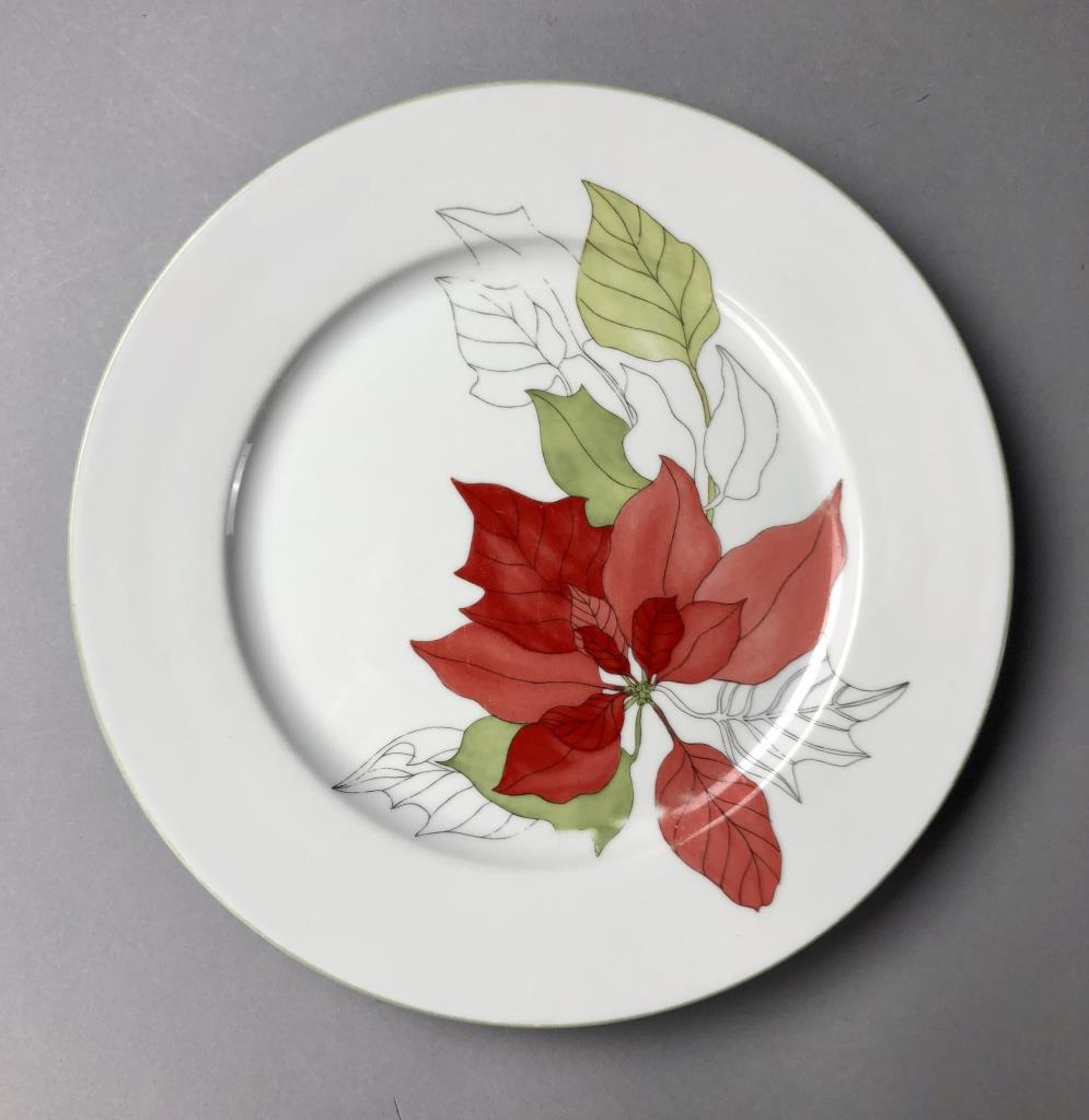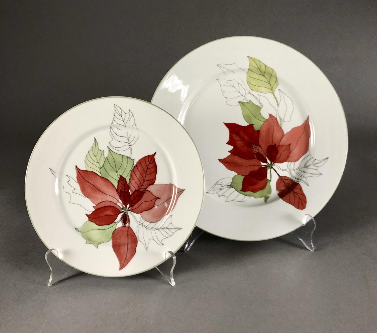 Six pieces of Mid Century Modern, Block China (Portugal), in the “Red Poinsettia” pattern (introduced in 1984 and discontinued in 1998), from the Watercolors series, by Mary Lou Goertzen (American, 1929 – 2020), includes: (1) 10-1/2″ (10-5/8″) dinner plate; (2) 8″ salad plates; (1) 9-3/8″ coffee pot with lid; and (2) 4-1/8″ creamers. CONDITION: Some pieces show signs of use and wear such as knife scratches and loss of pattern in some areas. There is a chip on the rim of one of the creamers, please see the last photo. SHIPPING: In-House Shipping Available. Please read our Shipping Policies and Terms and Conditions