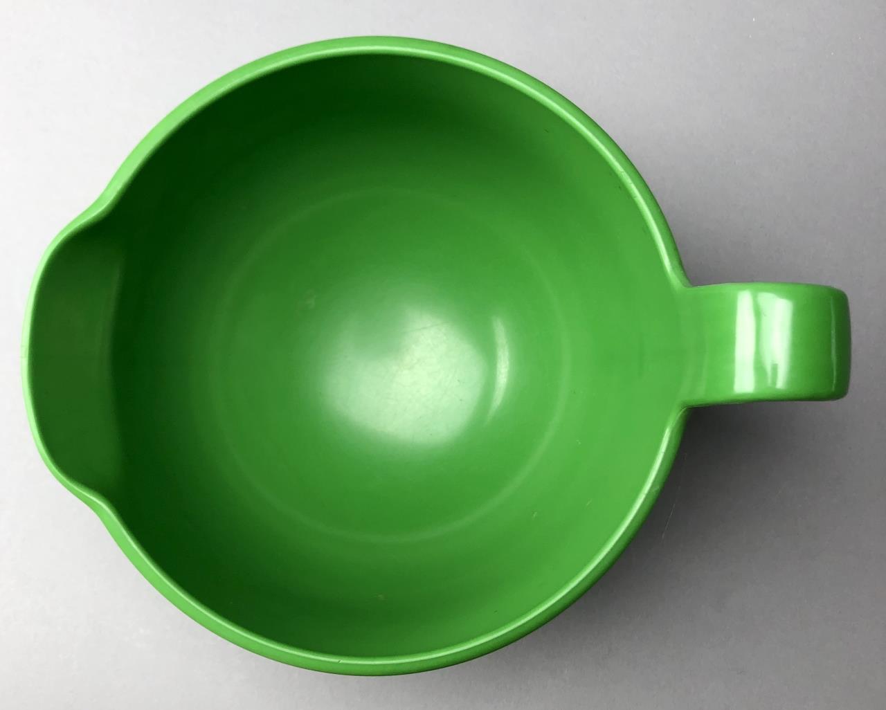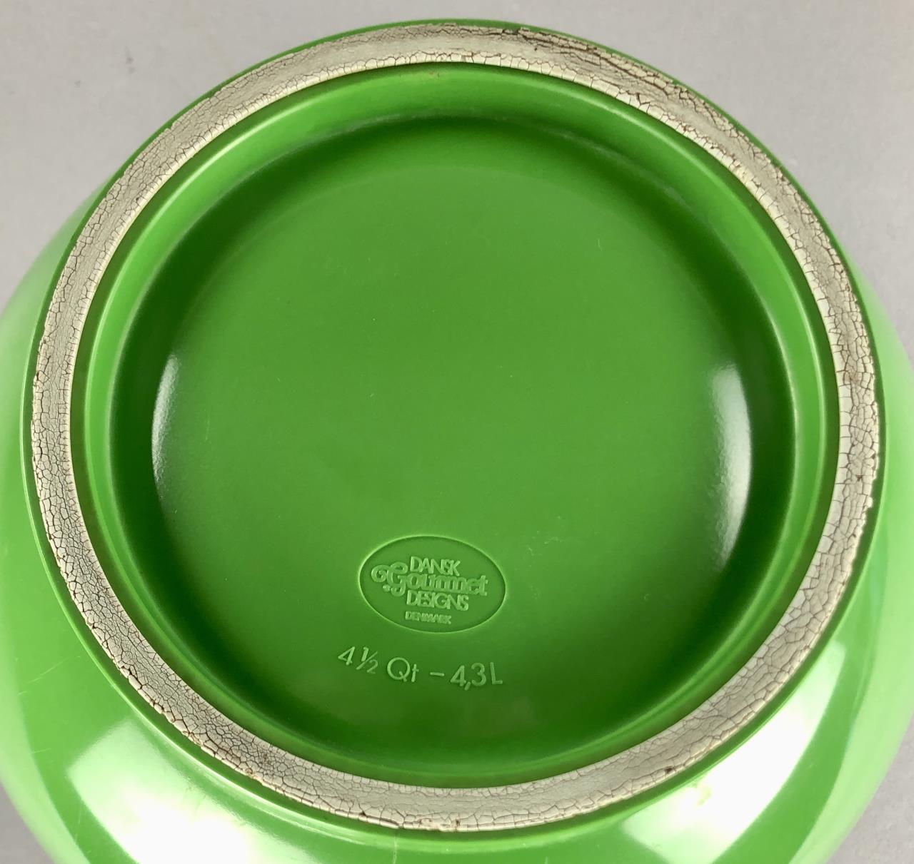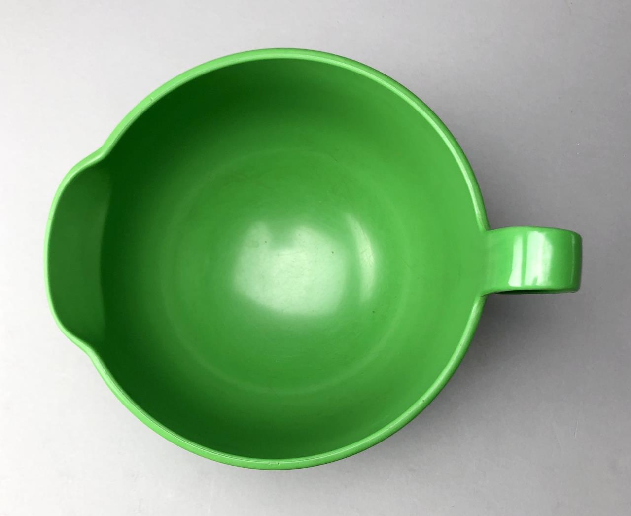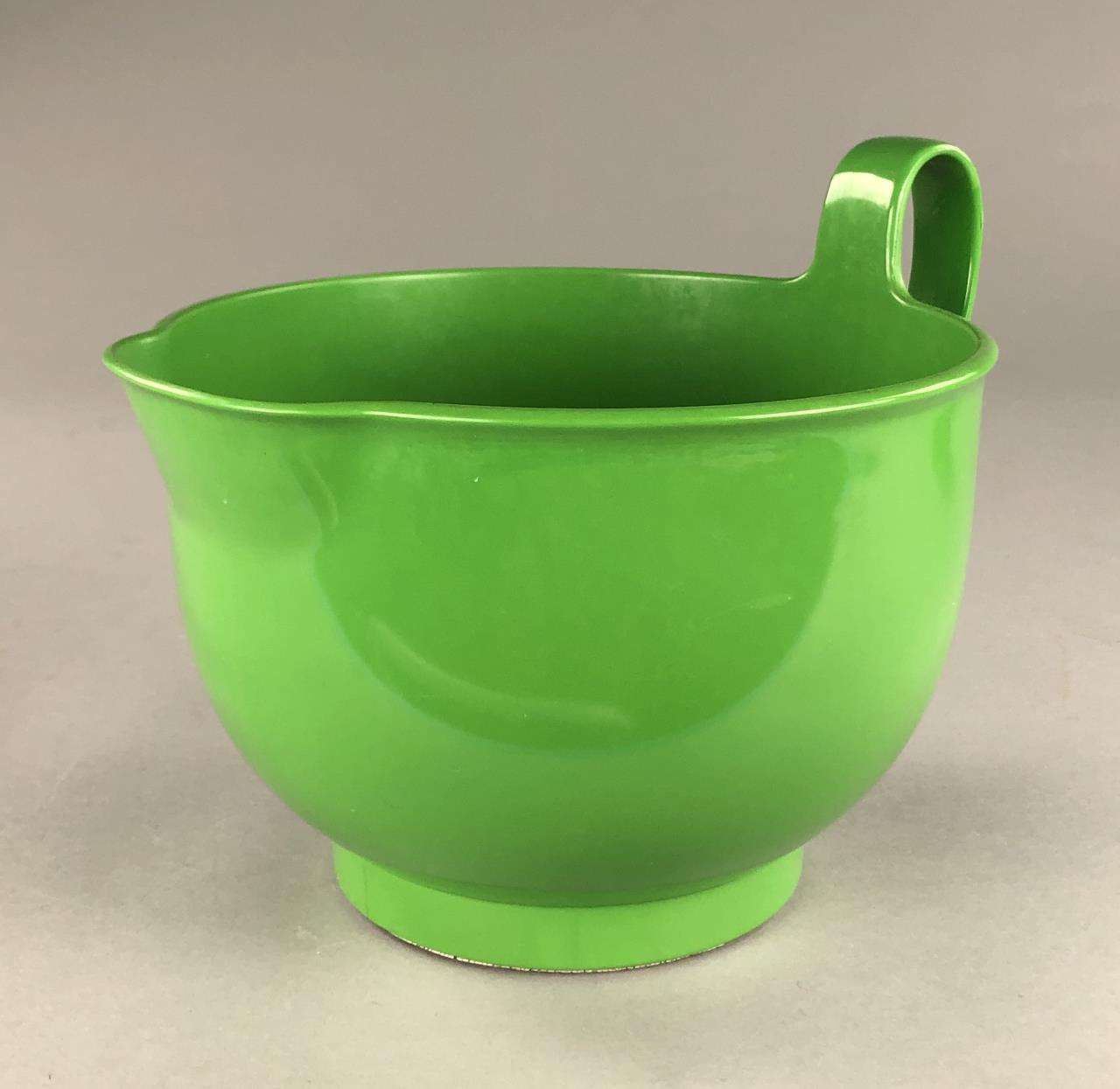 Two Dansk Gourmet Designs, green Melamine mixing bowls, or batter bowls with handles and spouts, 4-1/2 quart and 2-1/2″ quart, marked on bottoms, made in Denmark, circa 1960s, the larger one is approximately 8″ H. CONDITION: SHIPPING: In-House Shipping Available. Please read our Shipping Policies and Terms and Conditions