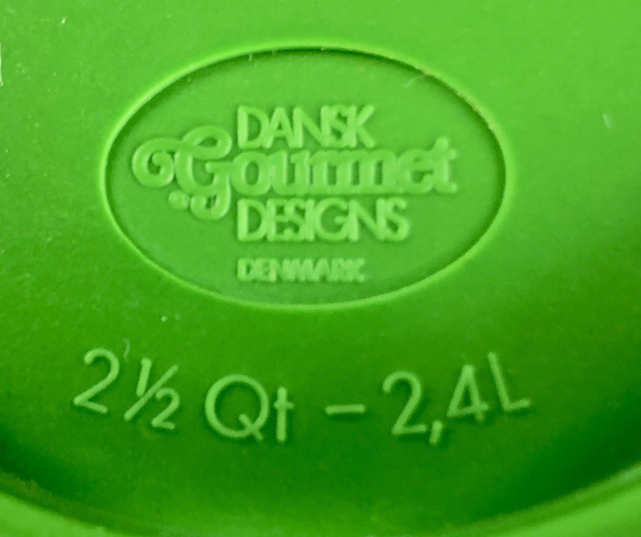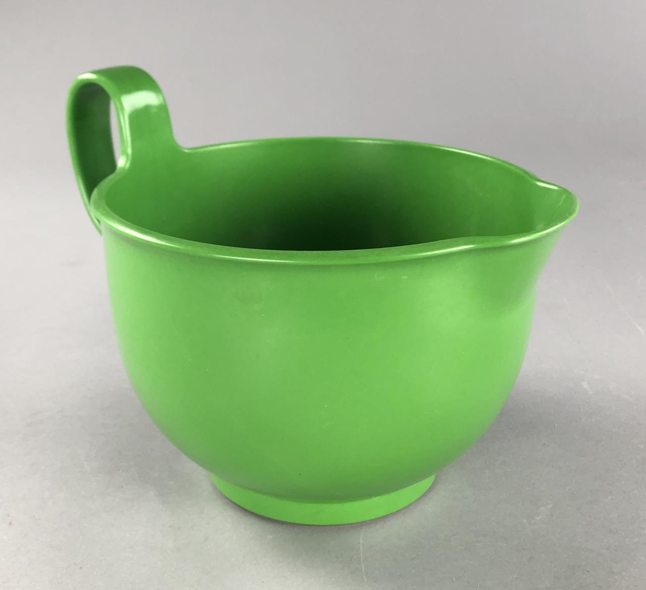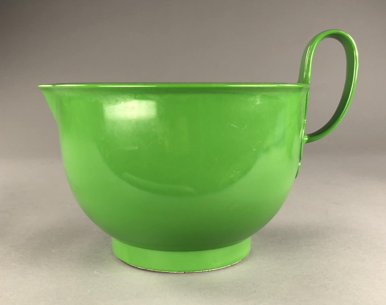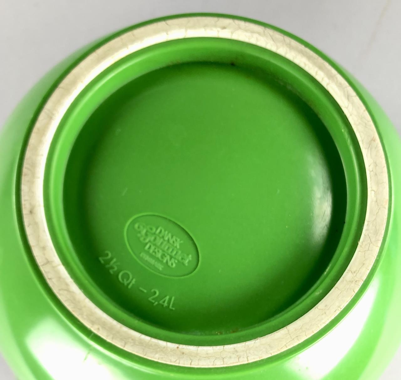 Two Dansk Gourmet Designs, green Melamine mixing bowls, or batter bowls with handles and spouts, 4-1/2 quart and 2-1/2″ quart, marked on bottoms, made in Denmark, circa 1960s, the larger one is approximately 8″ H. CONDITION: SHIPPING: In-House Shipping Available. Please read our Shipping Policies and Terms and Conditions