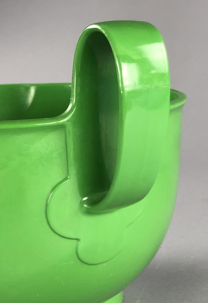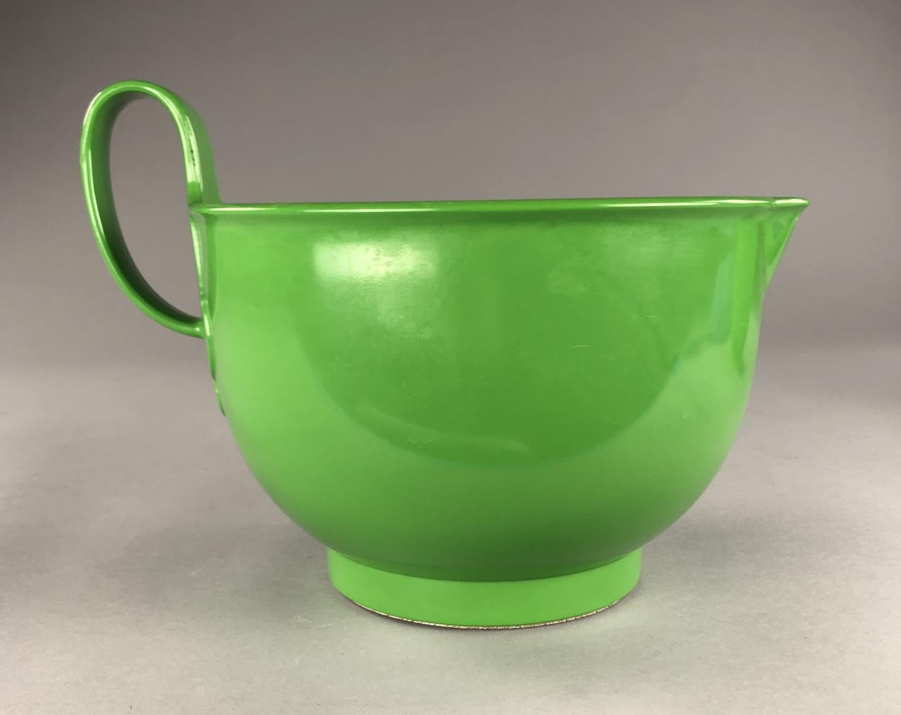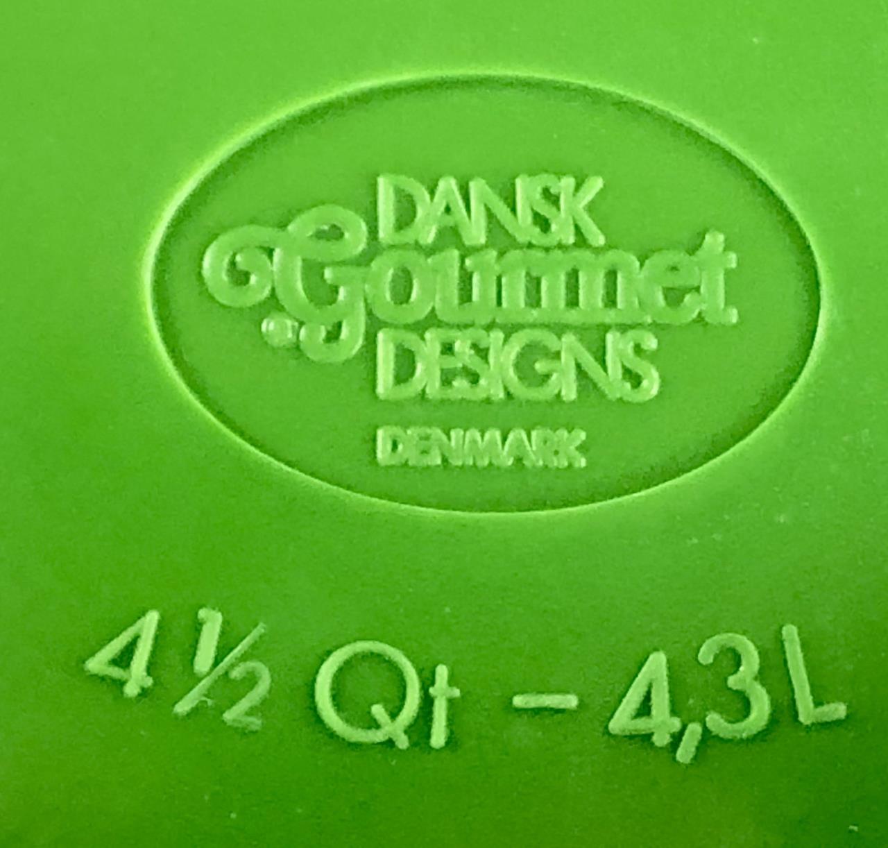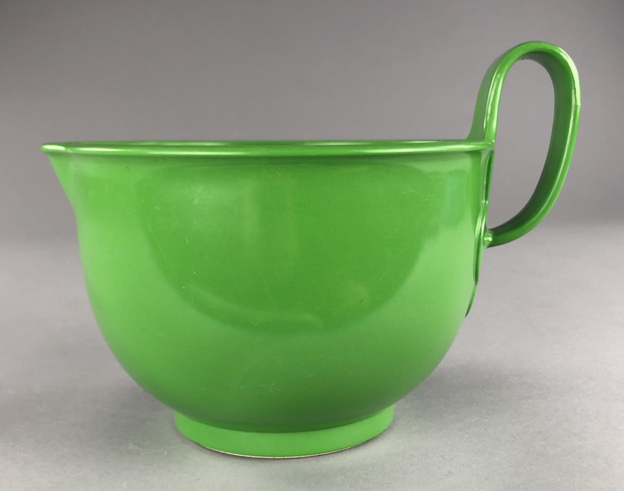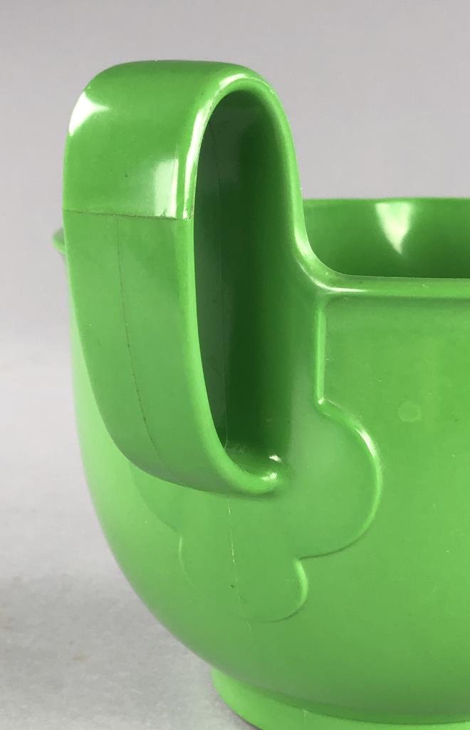 Two Dansk Gourmet Designs, green Melamine mixing bowls, or batter bowls with handles and spouts, 4-1/2 quart and 2-1/2″ quart, marked on bottoms, made in Denmark, circa 1960s, the larger one is approximately 8″ H. CONDITION: SHIPPING: In-House Shipping Available. Please read our Shipping Policies and Terms and Conditions