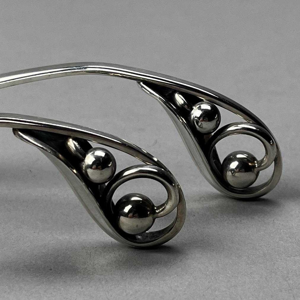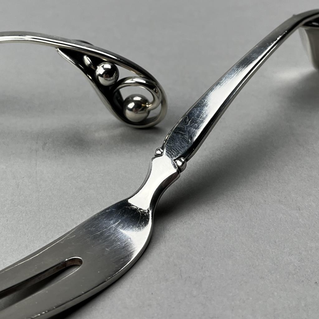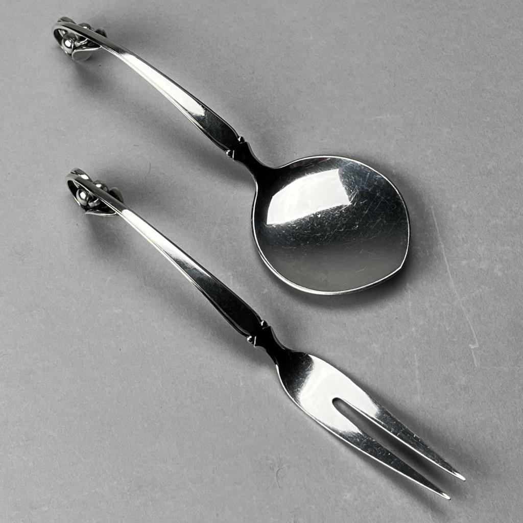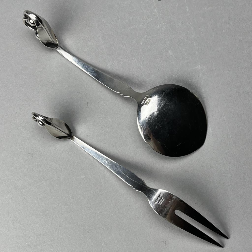 Broderne W. & S. Sorensen of Horsens (Horsens Solvvarefabrik) sterling silver Danish Modern flat serving spoon and serving fork with leaf and berry motif on handles, similar to Georg Jensen’s Blossom pattern, both pieces marked on reverse, the larger piece is 8-1/8″ L and the total weight of the two pieces is 145 grams. CONDITION: SHIPPING: In-House Shipping Available. Please read our Shipping Policies and Terms and Conditions
