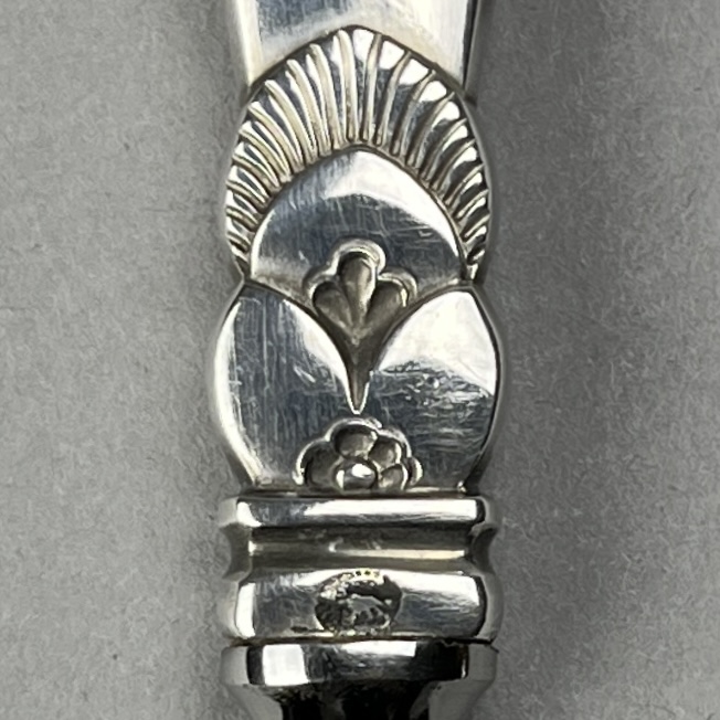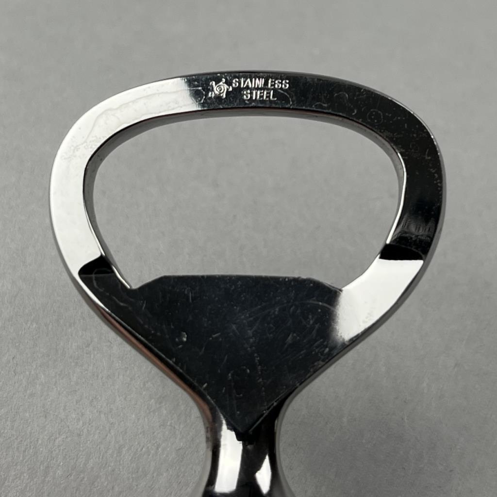 Georg Jensen sterling silver and stainless steel bottle opener, in the “Cactus” pattern, designed by Gundorph Albertus (Danish, 1887 – 1969) and introduced in 1930, 4-3/4″ L, 32 grams. CONDITION: Small spot of corrosion, please see last photo. SHIPPING: In-House Shipping Available. Please read our Shipping Policies and Terms and Conditions