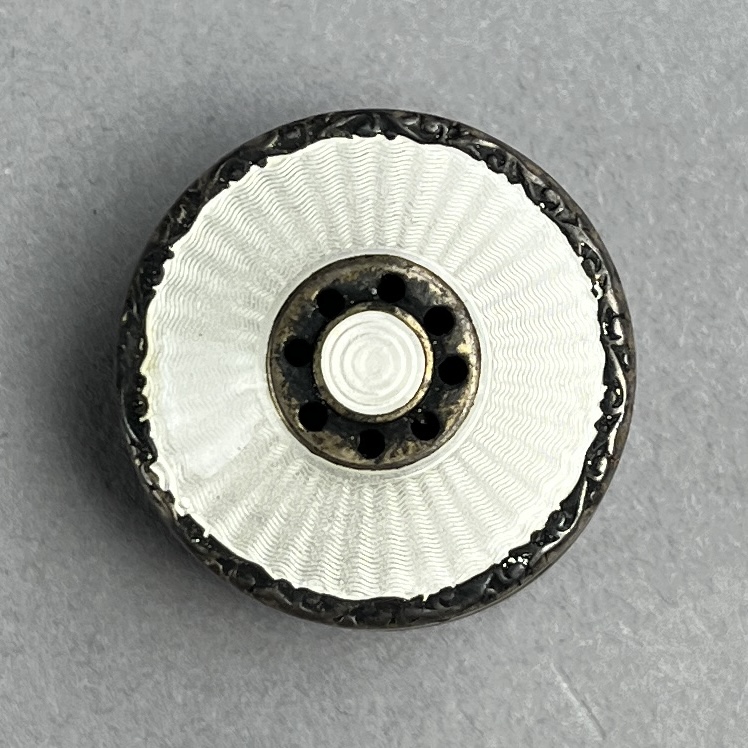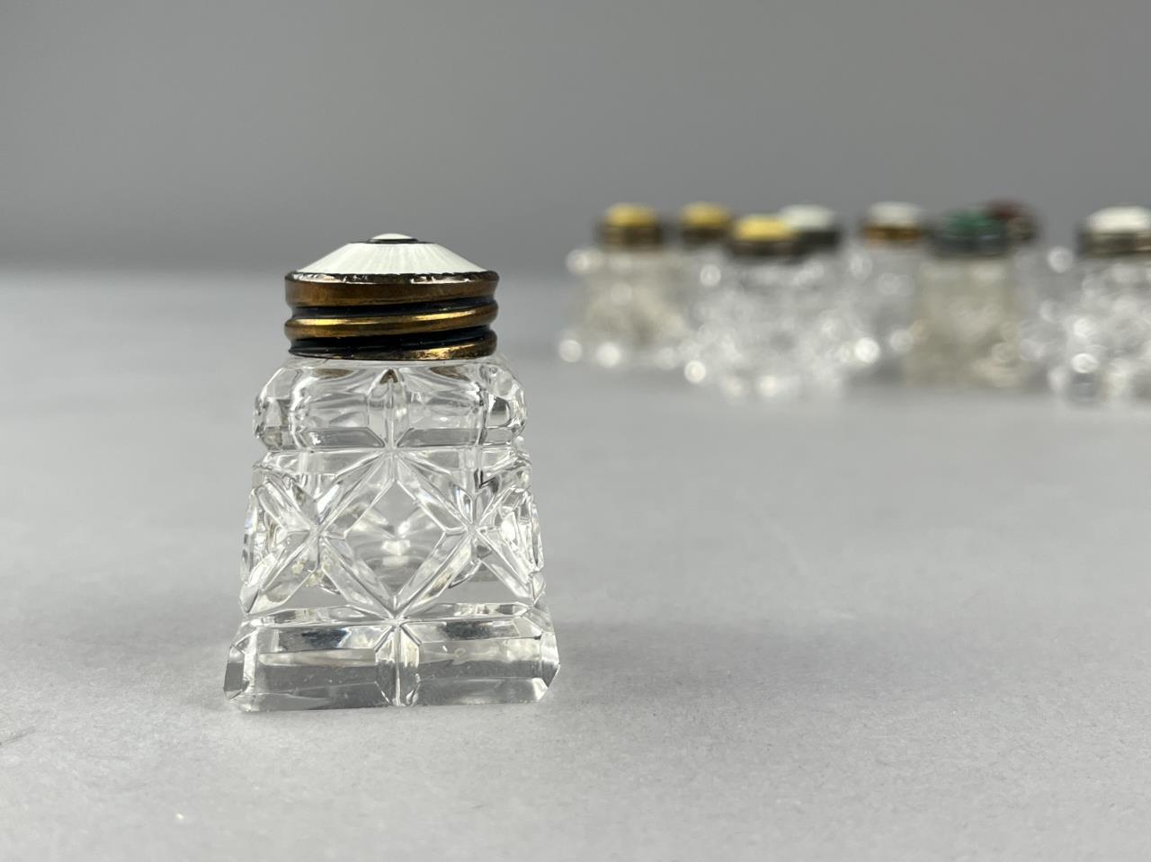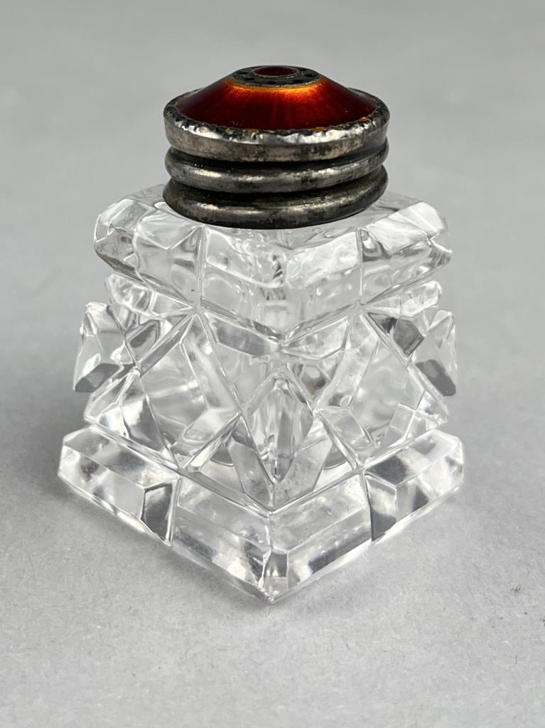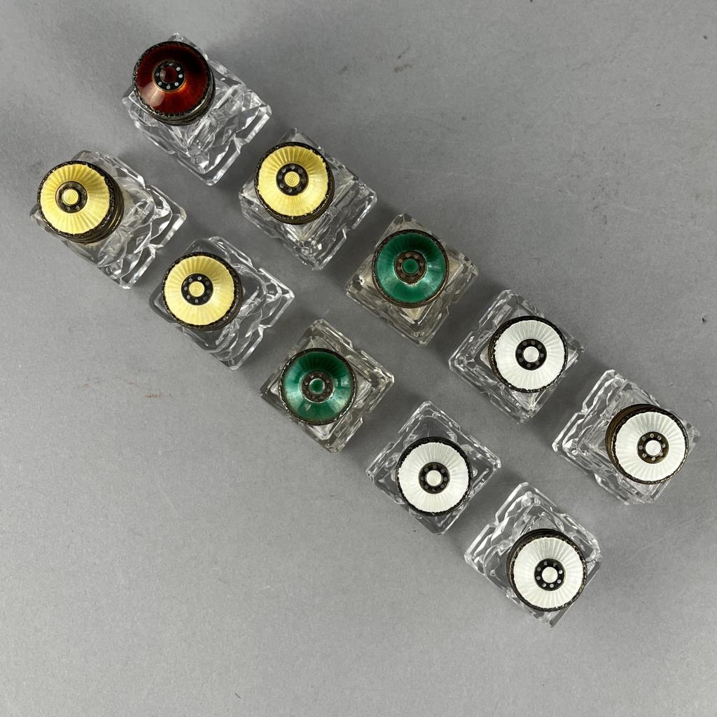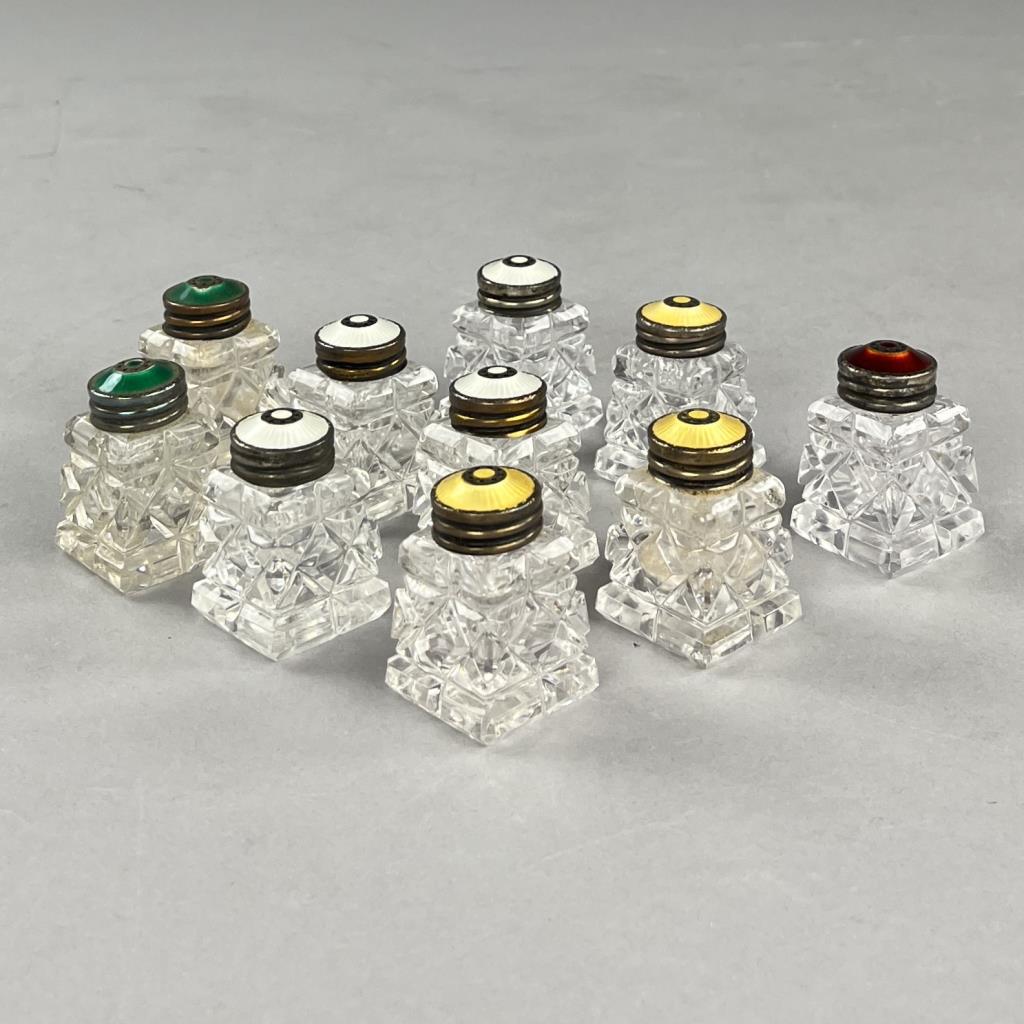 Hroar Prydz (Norwegian, 1859-1937), pressed and cut glass salt and pepper shakers, with sterling silver tops with multicolored guilloche enamel, the rims stamped “Sterling (Prydz’s crown mark) Norway,” circa early 20th Century, five sets for a total of 10 pieces, each measuring approximately 1-3/4″ x 1-1/4″ – 1-1/4″. Silver not weighable. CONDITION: SHIPPING: In-House Shipping Available. Please read our Shipping Policies and Terms and Conditions