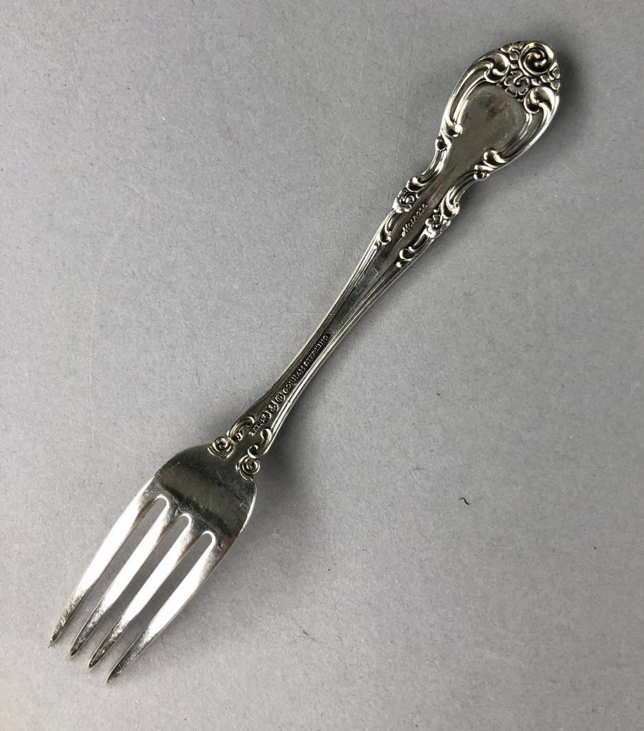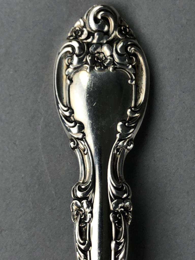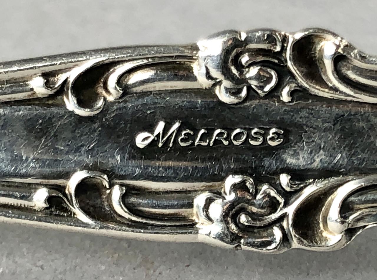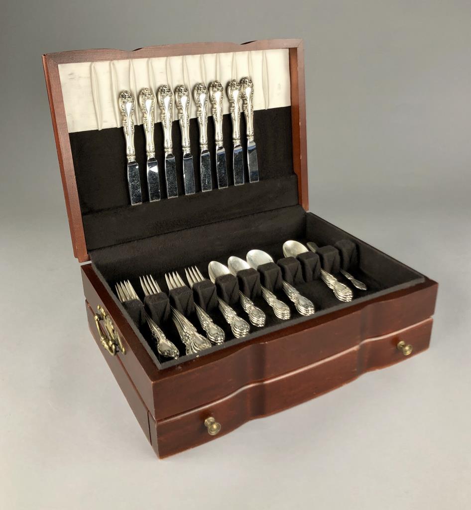 Gorham (American) sterling silver flatware set, service for eight, in the “Melrose” pattern, which was introduced in 1948. The set includes: (8) 7-1/8″ dinner forks; (8) 6-1/2″ salad/dessert forks; (8) 8-3/4″ dinner knives with stainless steel blades; (8) 5-7/8″ teaspoons; (8) 6-1/4″ cream soup spoons; and (1) 5-11/16″ butter knife (total 41 pieces). Also, included is wood storage case with a hinged lid top and a drawer on the bottom. Total silver weight, excluding hollow handled knives, is 1499 grams. CONDITION: All pieces are unpolished and some may be tarnished, or have light surface scratches, or small areas of corrosion, commensurate with age and normal use. Some scratching and wear to the top of the wood storage case. SHIPPING: In-House Shipping Available. Please read our Shipping Policies and Terms and Conditions