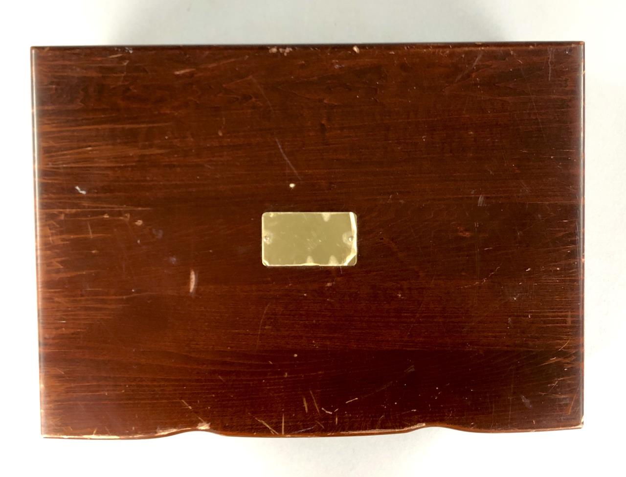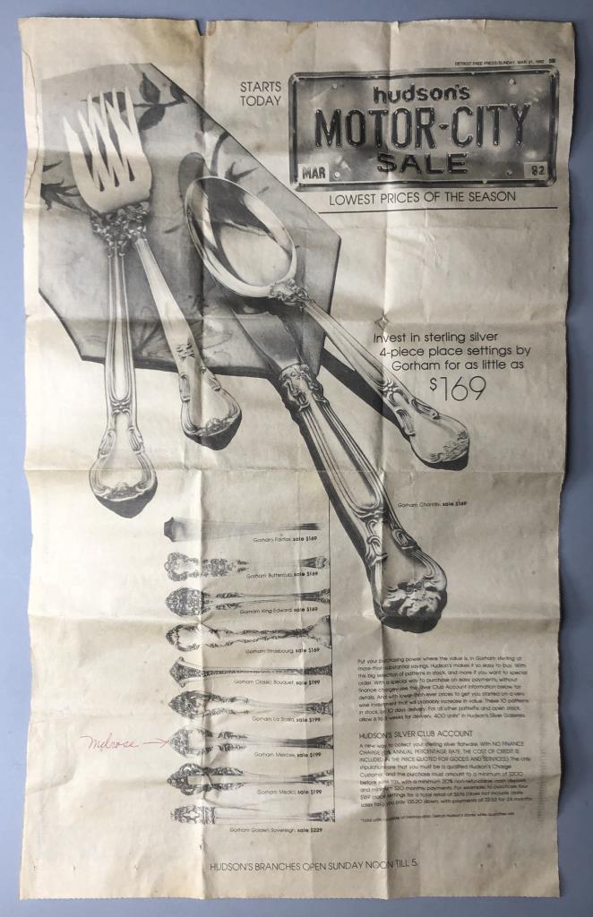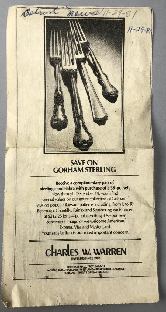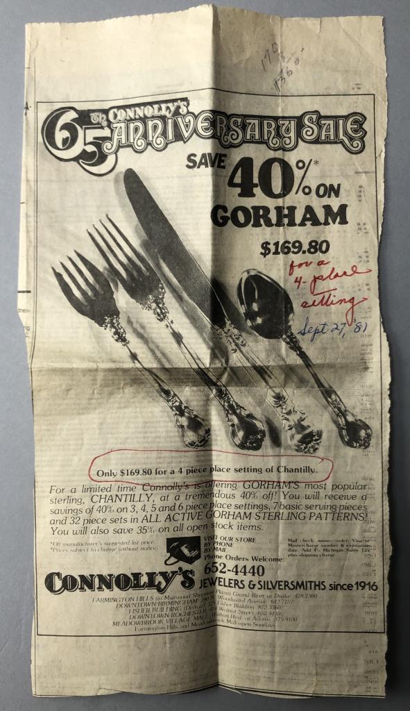 Gorham (American) sterling silver flatware set, service for eight, in the “Melrose” pattern, which was introduced in 1948. The set includes: (8) 7-1/8″ dinner forks; (8) 6-1/2″ salad/dessert forks; (8) 8-3/4″ dinner knives with stainless steel blades; (8) 5-7/8″ teaspoons; (8) 6-1/4″ cream soup spoons; and (1) 5-11/16″ butter knife (total 41 pieces). Also, included is wood storage case with a hinged lid top and a drawer on the bottom. Total silver weight, excluding hollow handled knives, is 1499 grams. CONDITION: All pieces are unpolished and some may be tarnished, or have light surface scratches, or small areas of corrosion, commensurate with age and normal use. Some scratching and wear to the top of the wood storage case. SHIPPING: In-House Shipping Available. Please read our Shipping Policies and Terms and Conditions