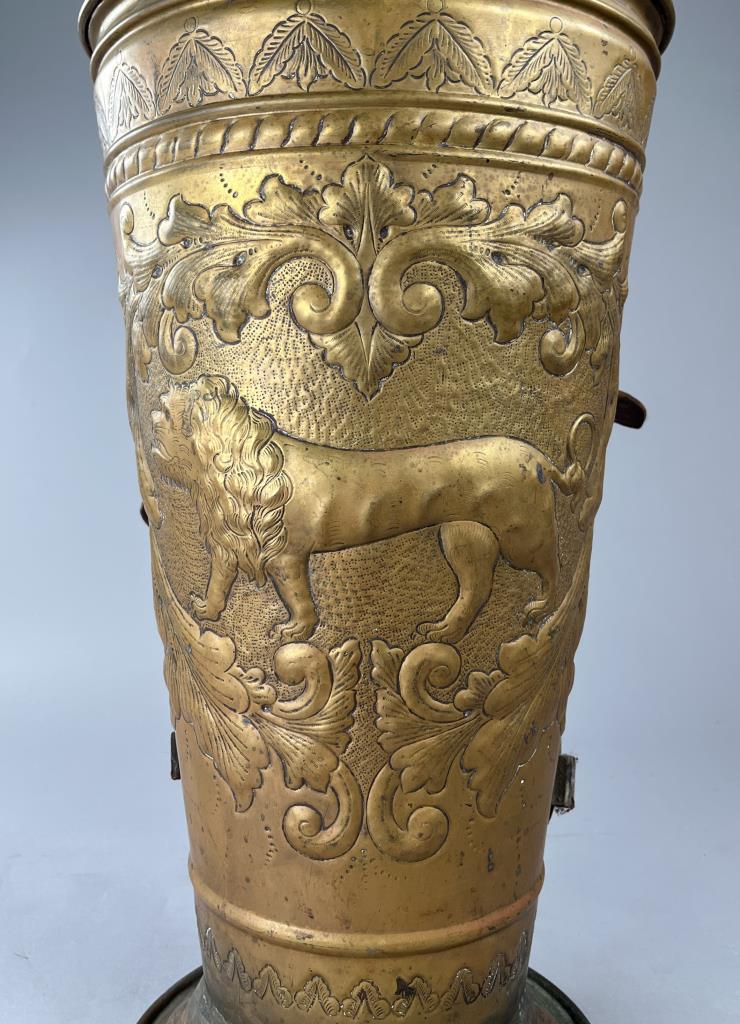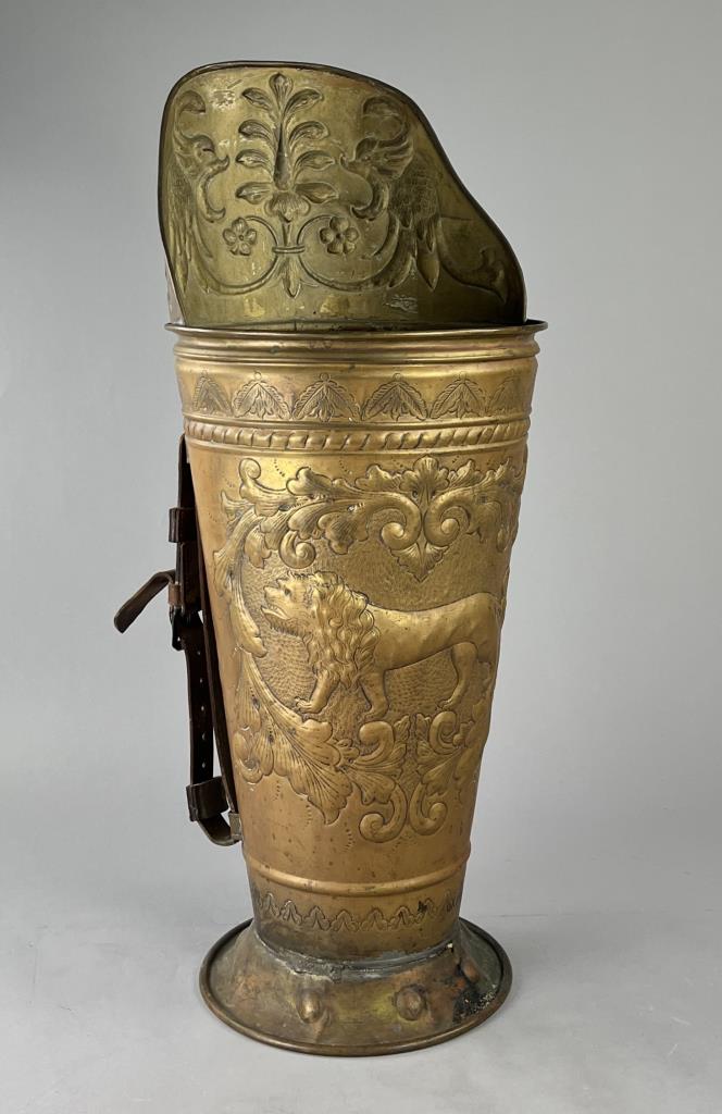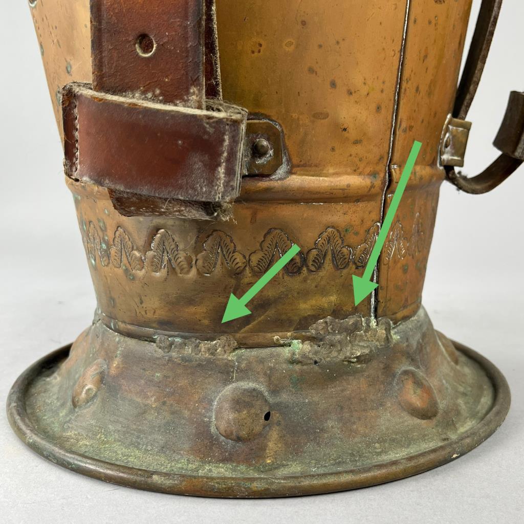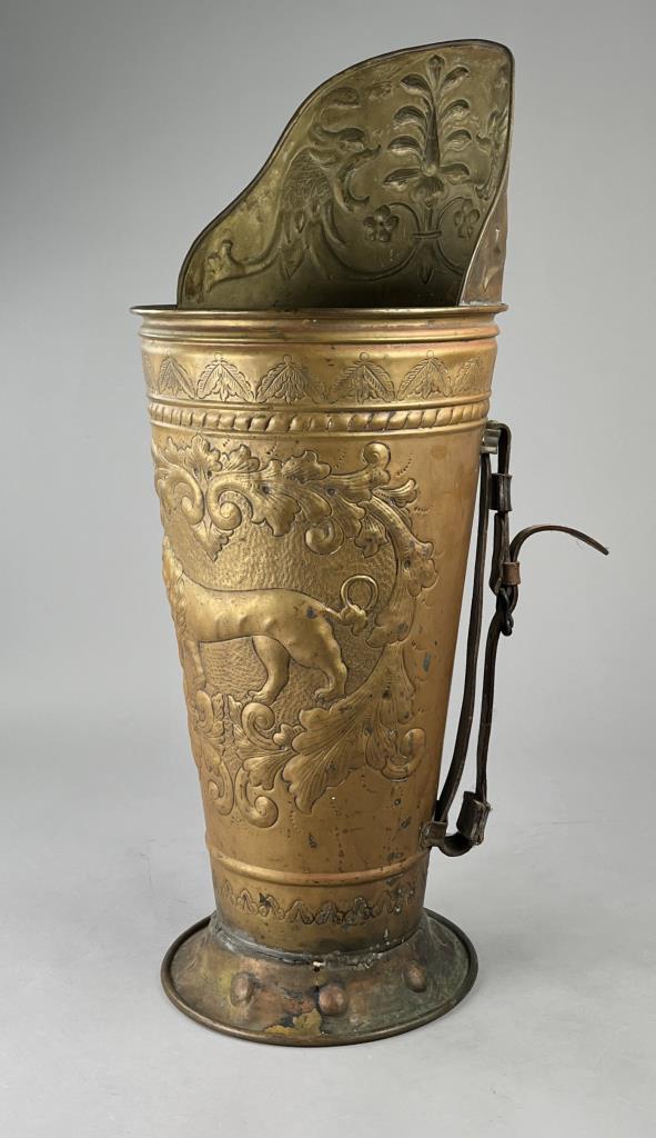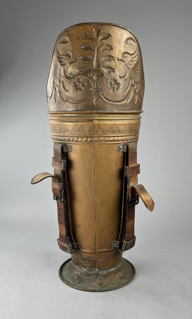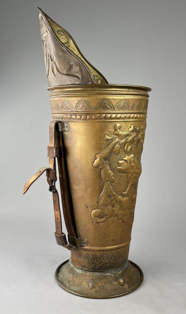 Antique hand repoussed and embossed, copper and brass, grape hod or carrier, with two intact leather carrying stripes on the back side, marked “Made in England”, late 19th / early 20th Century, 32-1/2″ (H). CONDITION: Possible older repair near base. SHIPPING: Local pick-up or third party shipping only for this lot. Please see the Shipping Policy for information on suggested shippers. We recommend the Pak Mail Store of Battle Creek to assist you. Please contact the shipper of your choice for shipping estimates on this lot. Refer to the Shipping section in our full Terms and Conditions for all information on shipping.
