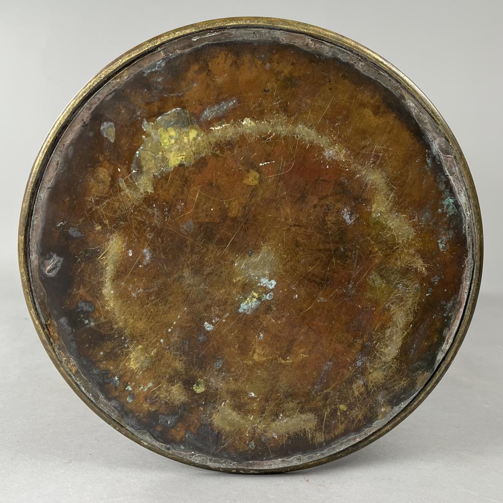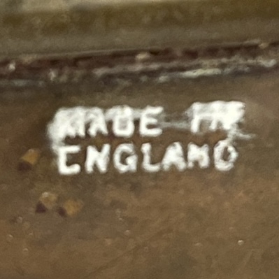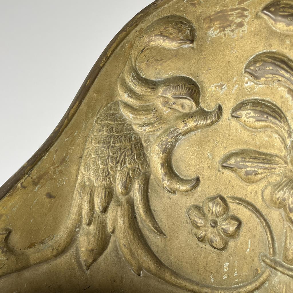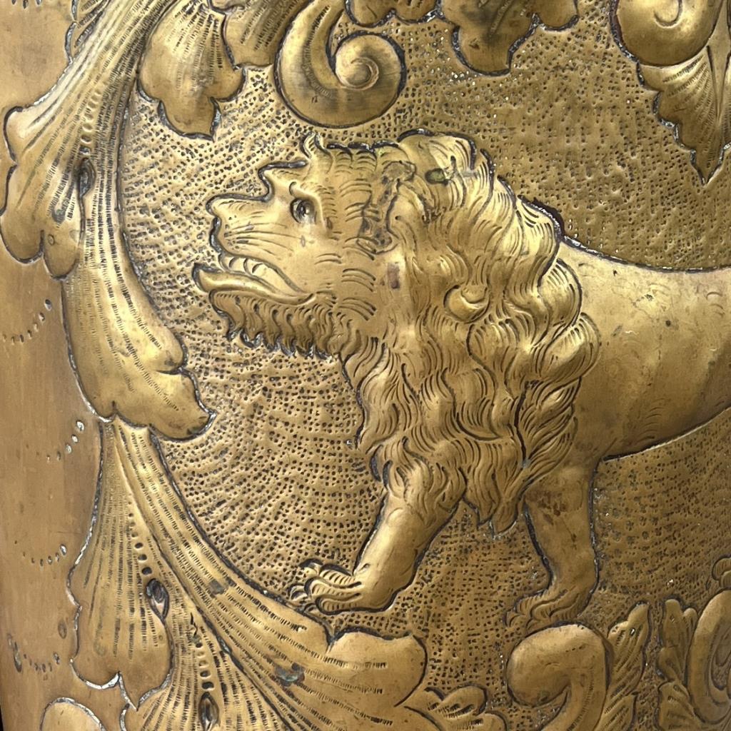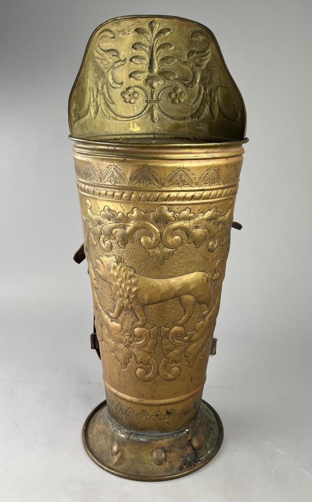 Antique hand repoussed and embossed, copper and brass, grape hod or carrier, with two intact leather carrying stripes on the back side, marked “Made in England”, late 19th / early 20th Century, 32-1/2″ (H). CONDITION: Possible older repair near base. SHIPPING: Local pick-up or third party shipping only for this lot. Please see the Shipping Policy for information on suggested shippers. We recommend the Pak Mail Store of Battle Creek to assist you. Please contact the shipper of your choice for shipping estimates on this lot. Refer to the Shipping section in our full Terms and Conditions for all information on shipping.