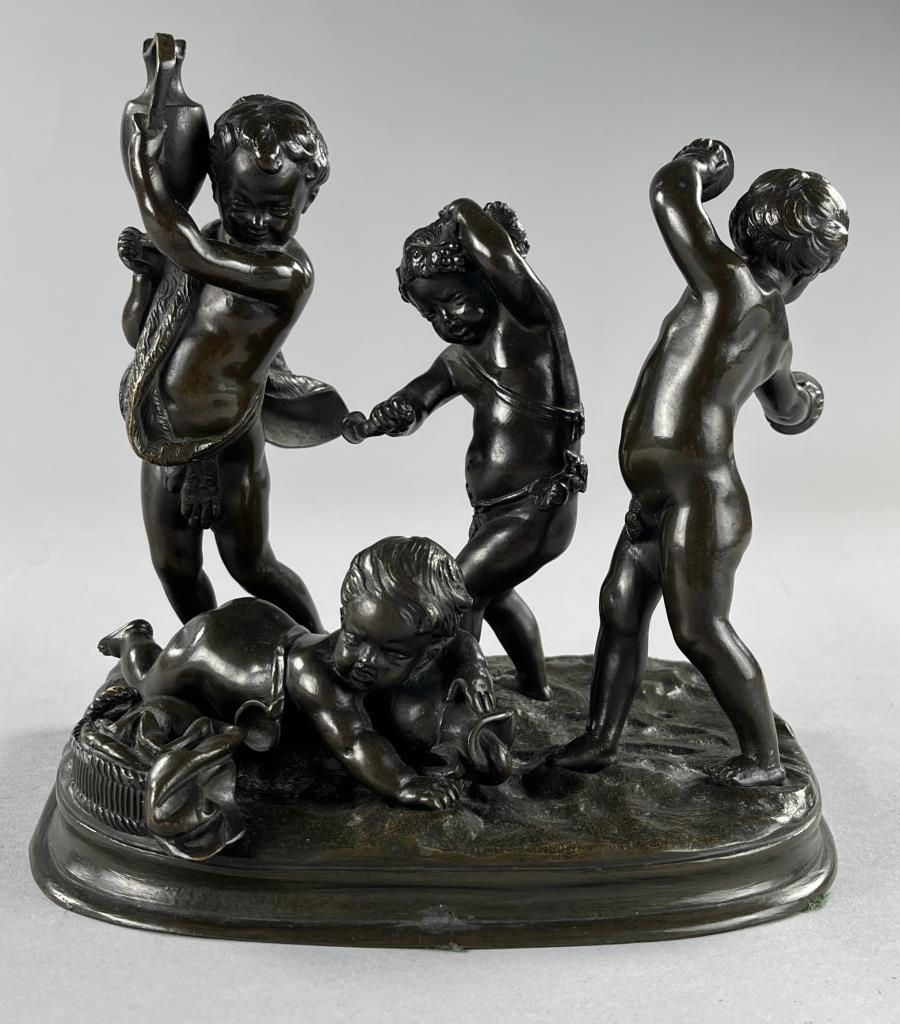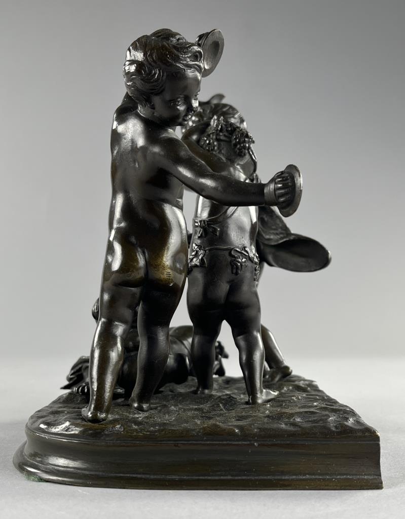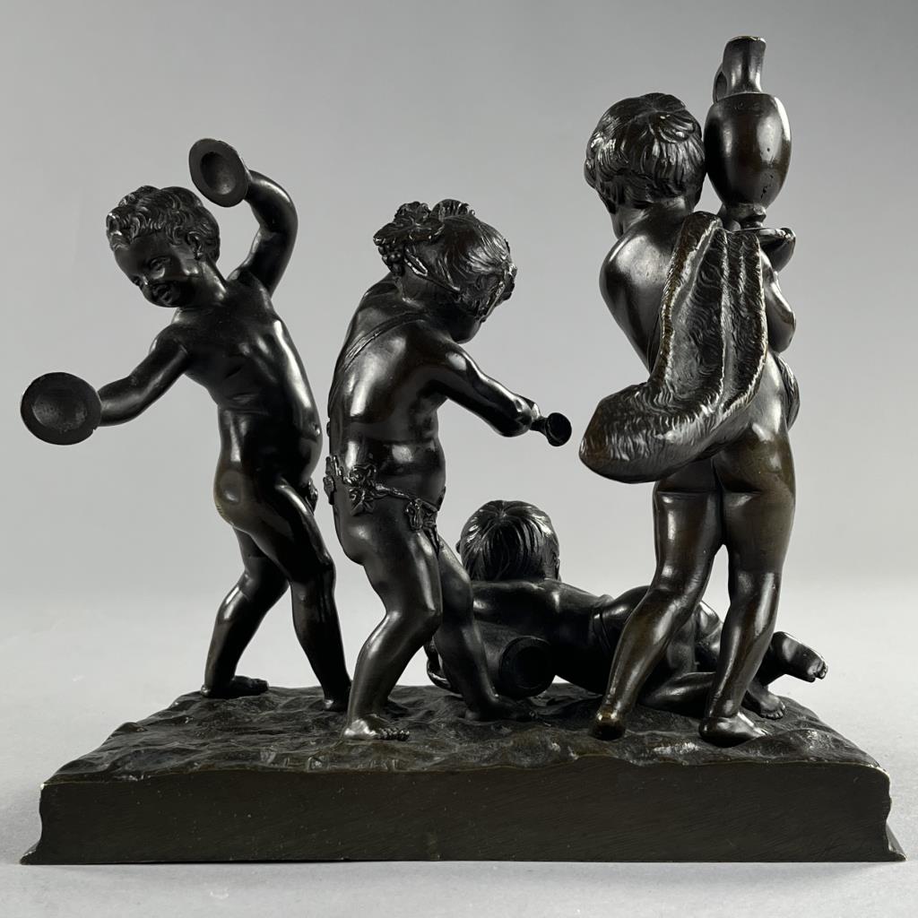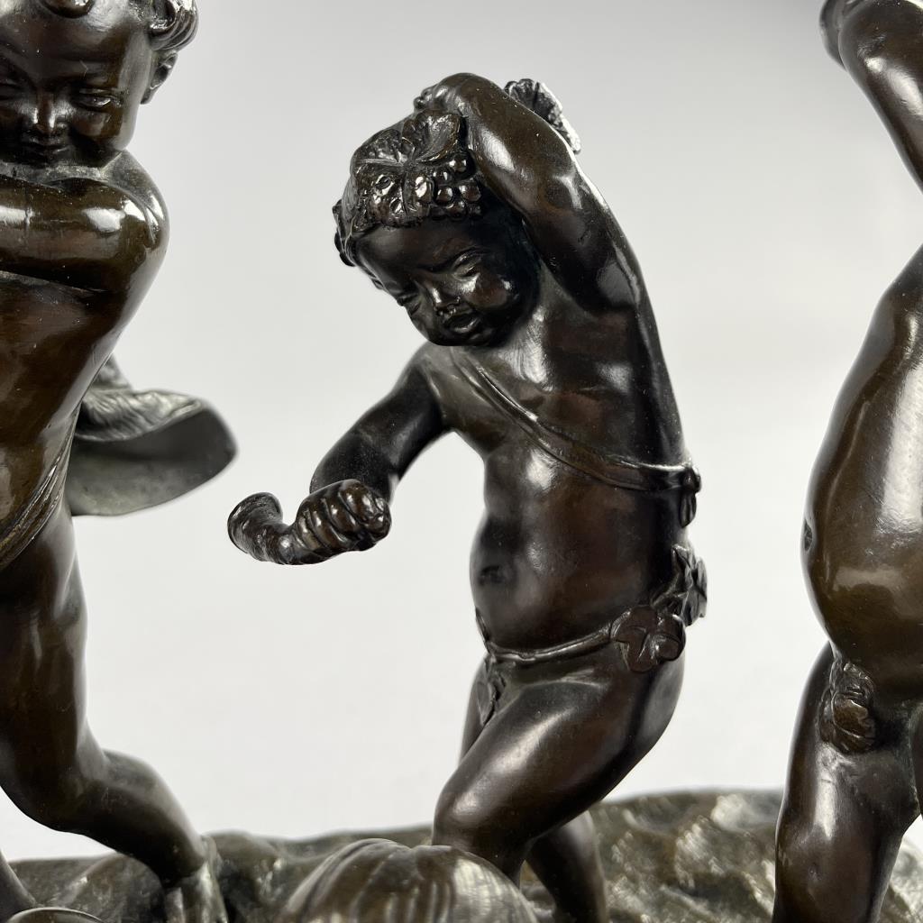 Bronze figural group, depicting putti in a bacchanal celebration, after a work by Claude Michel Clodion (French, 1741 – 1827), marked “Lemire,” most likely late 19th/early 20th Century, 8-3/16″ x 5-15/16″ x 7-3/4″. CONDITION: The goat figure, which should be at the back, has been lost. The one figure holding the jug is loose at the base. SHIPPING: In-House Shipping Available. Please read our Shipping Policies and Terms and Conditions
