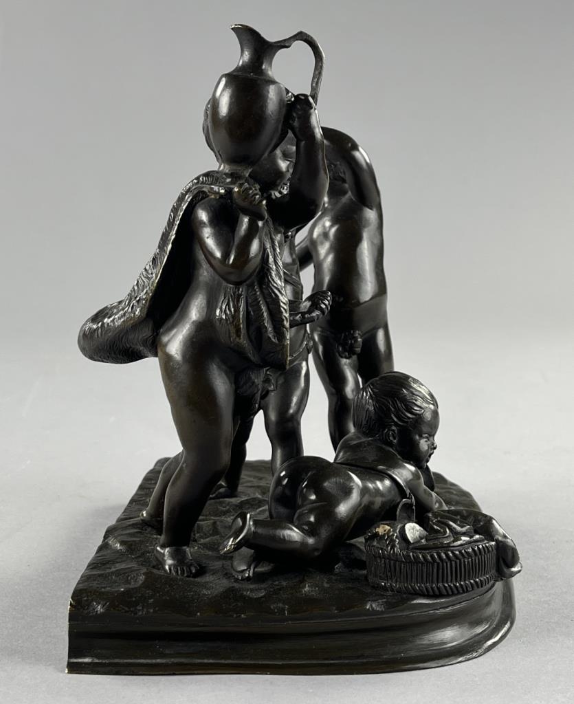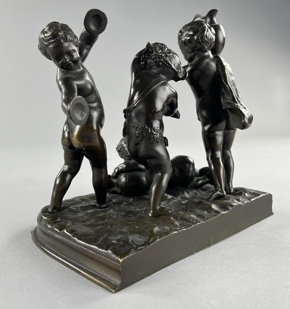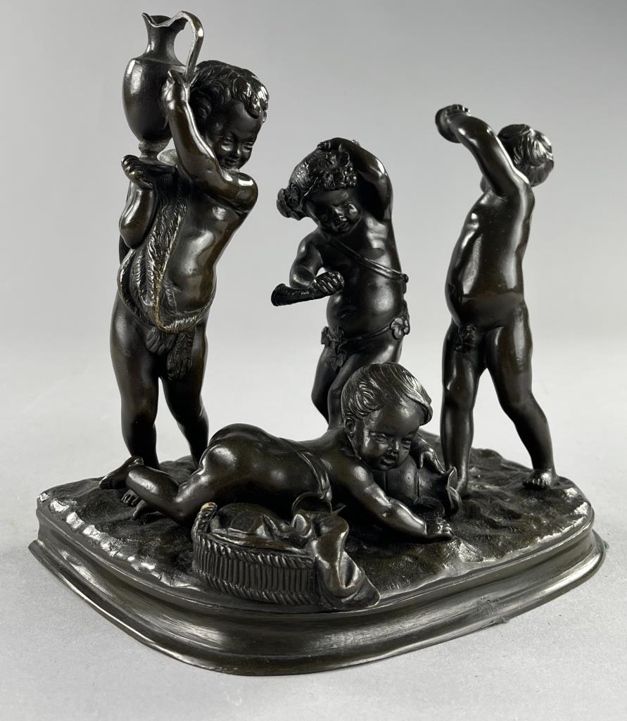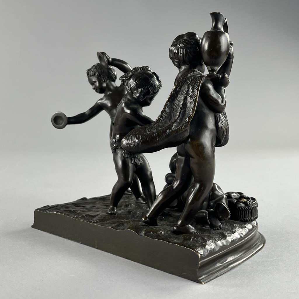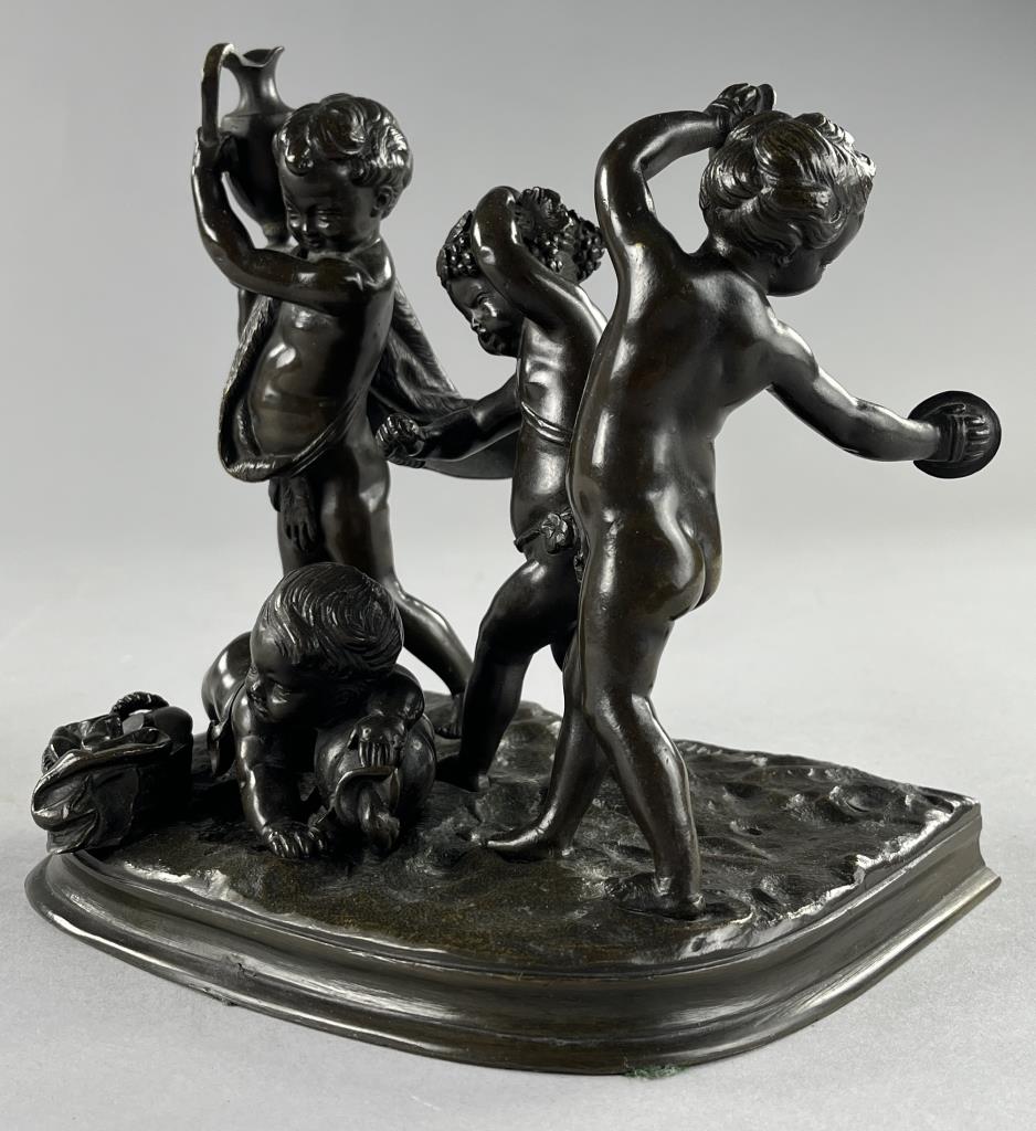 Bronze figural group, depicting putti in a bacchanal celebration, after a work by Claude Michel Clodion (French, 1741 – 1827), marked “Lemire,” most likely late 19th/early 20th Century, 8-3/16″ x 5-15/16″ x 7-3/4″. CONDITION: The goat figure, which should be at the back, has been lost. The one figure holding the jug is loose at the base. SHIPPING: In-House Shipping Available. Please read our Shipping Policies and Terms and Conditions