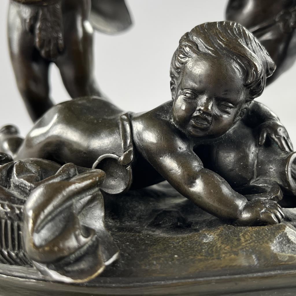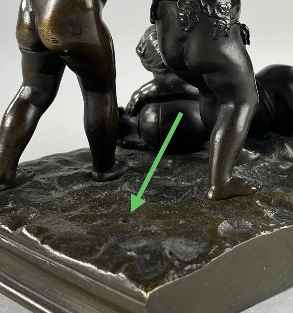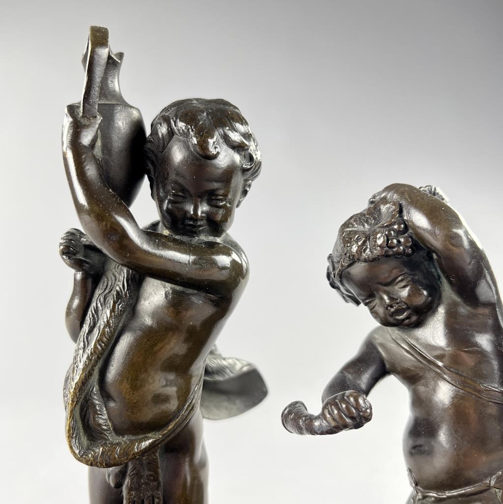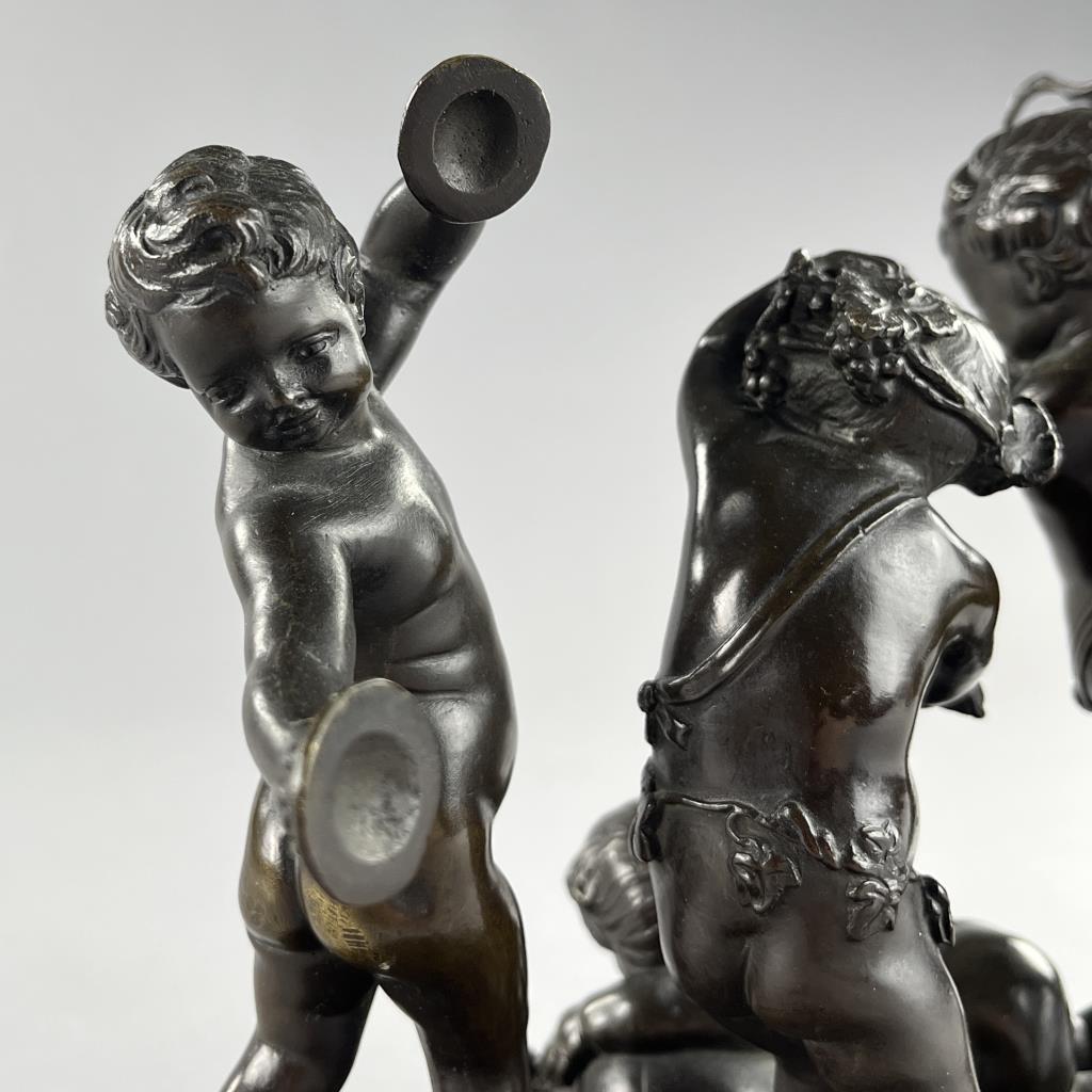 Bronze figural group, depicting putti in a bacchanal celebration, after a work by Claude Michel Clodion (French, 1741 – 1827), marked “Lemire,” most likely late 19th/early 20th Century, 8-3/16″ x 5-15/16″ x 7-3/4″. CONDITION: The goat figure, which should be at the back, has been lost. The one figure holding the jug is loose at the base. SHIPPING: In-House Shipping Available. Please read our Shipping Policies and Terms and Conditions