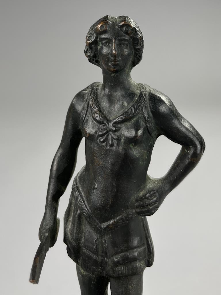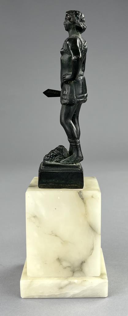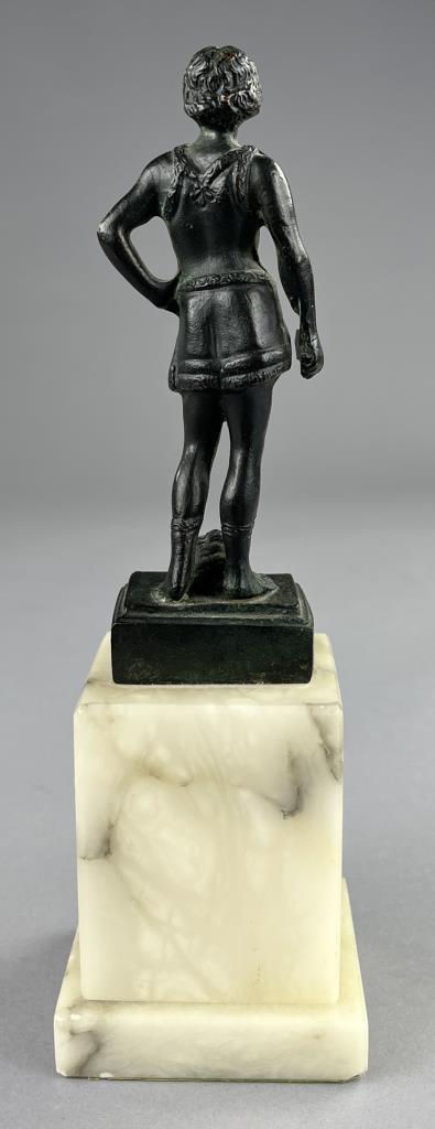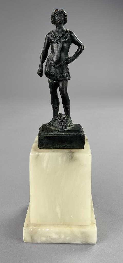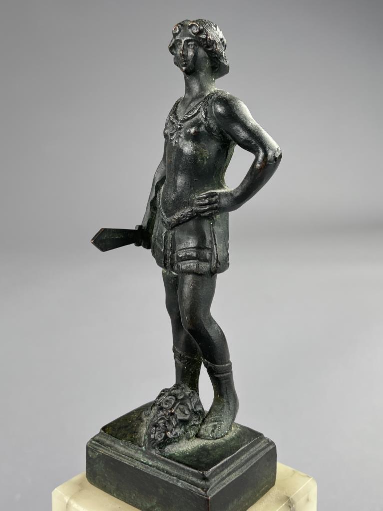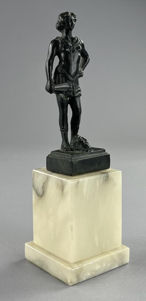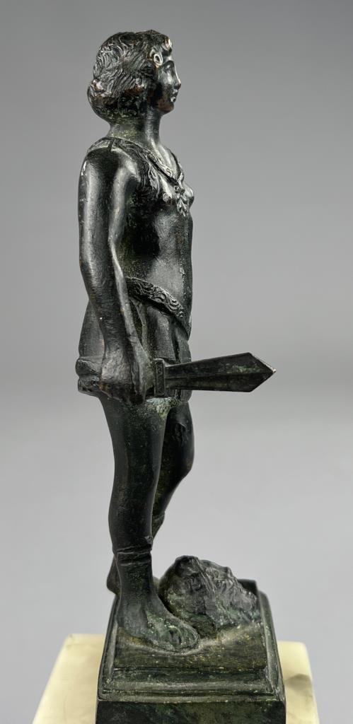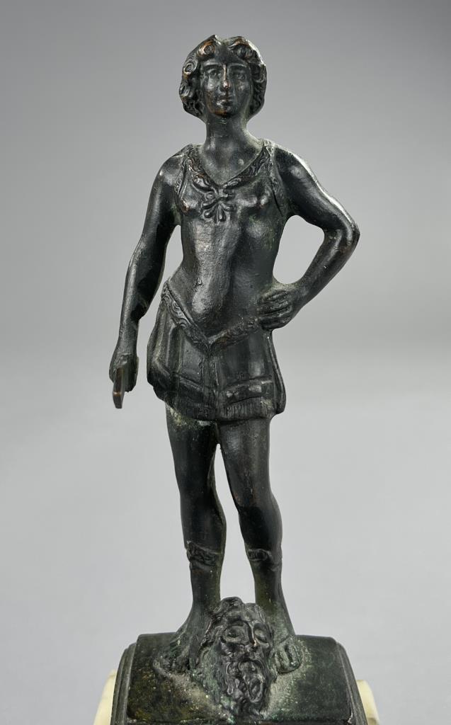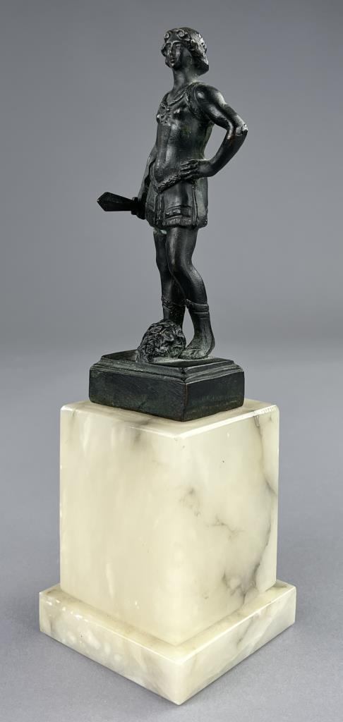 Small bronze figure of David standing victorious over the head of the slain Goliath, after the 15th Century work by Andrea del Verrocchio (Italian, 1435 – 1488), circa mid 20th Century, with marble base 9″ (H). CONDITION: SHIPPING: In-House Shipping Available. Please read our Shipping Policies and Terms and Conditions