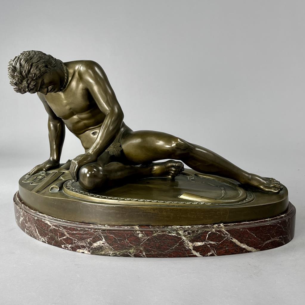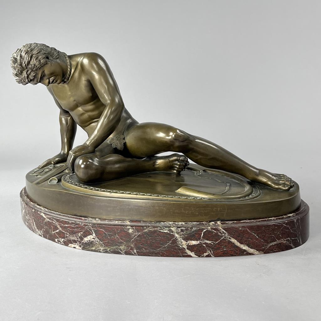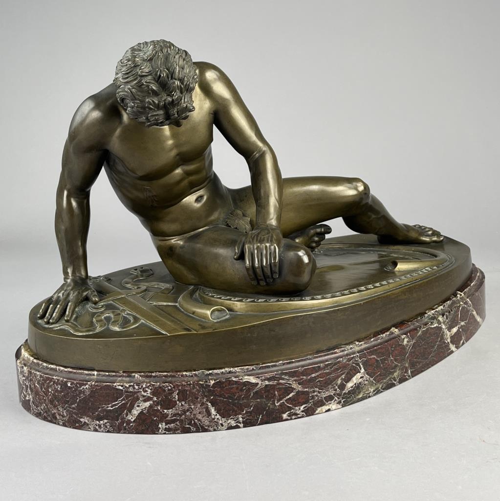 Grand Tour bronze statue of “The Dying Gaul”, 1868, Adolfo Dressler (active in Rome in the mid 19th Century) after a model by the German bronze sculptors and founders, Wilhelm Hopfgarten (1779-1860) and Benjamin Jollage (1780-1837), who worked in Rome during the Napoleonic and Restoration periods, marked on the base of the bronze at the back, “A DRESSLER HOPFGARTEN ROMA 1868″, presented on rouge marble base with bold and prominent veining, approximately 12-1/4″ (L) x 23-1/2″ (W) x 14-1/2” (including base). CONDITION: Local pick-up or third party shipping only for this lot. Please see the Shipping Policy for information on suggested shippers. We recommend the Pak Mail Store of Battle Creek to assist you. Please contact the shipper of your choice for shipping estimates on this lot. Refer to the Shipping section in our full Terms and Conditions for all information on shipping. SHIPPING: In-House Shipping Available. Please read our Shipping Policies and Terms and Conditions