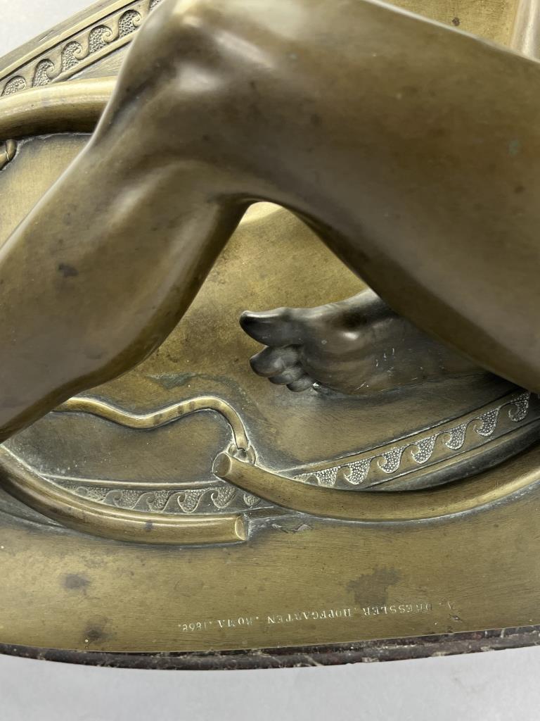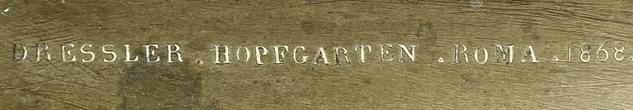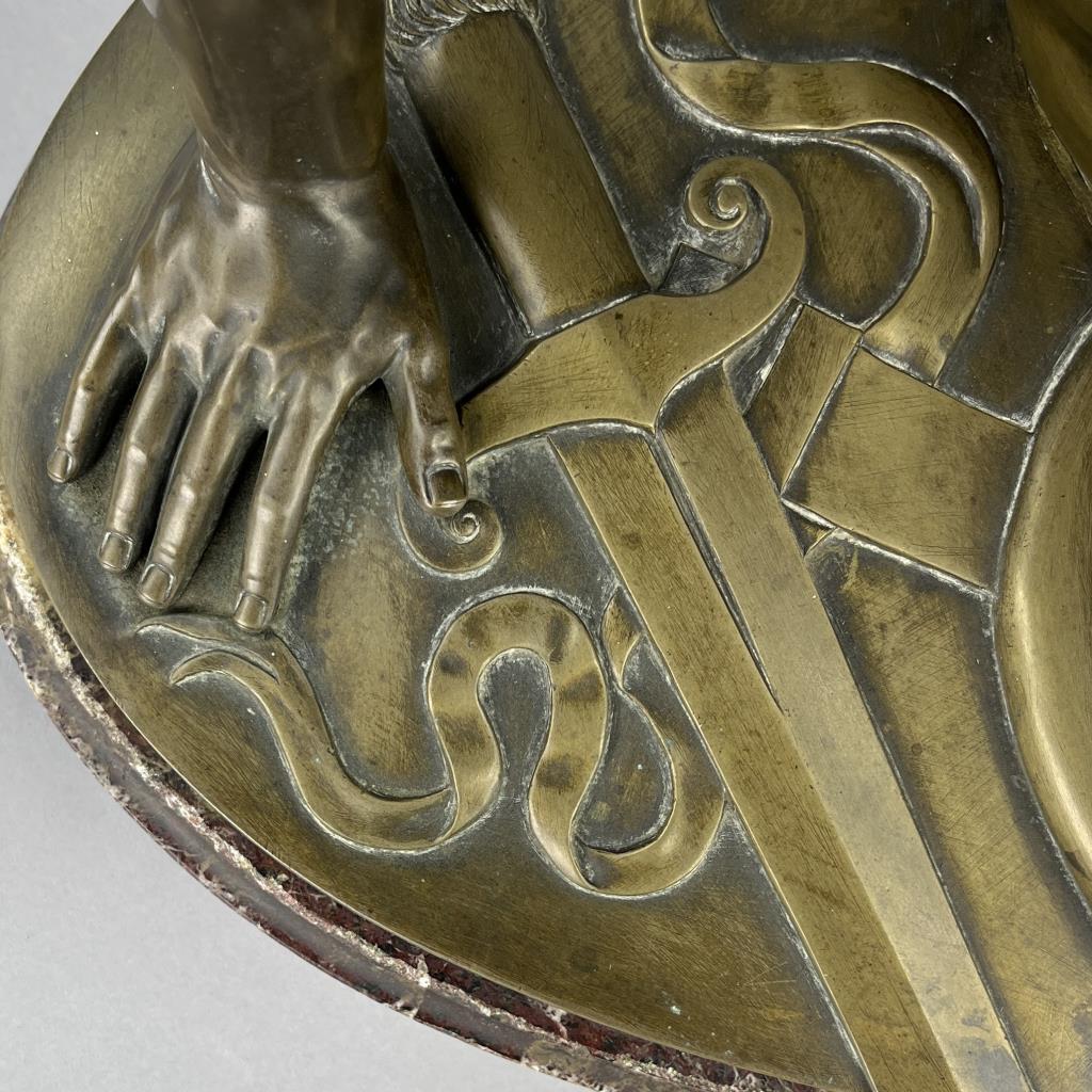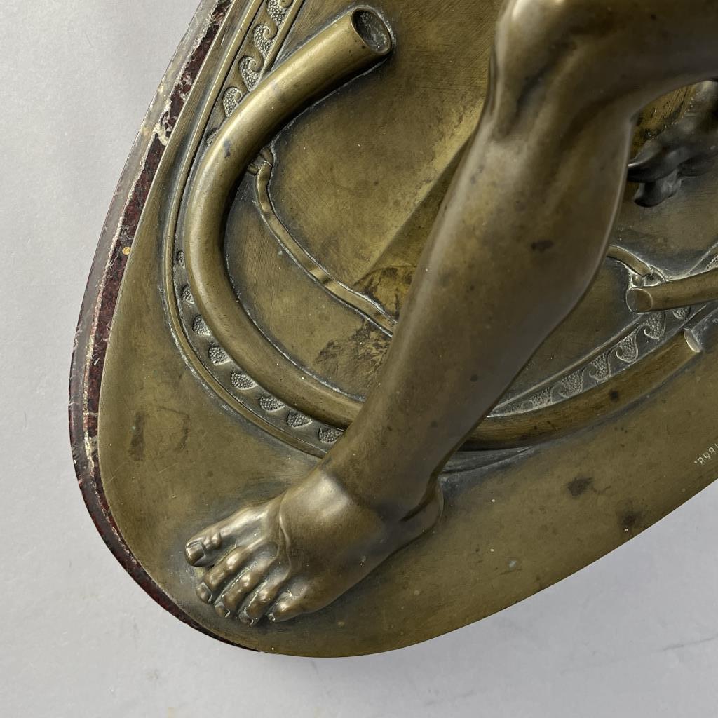 Grand Tour bronze statue of “The Dying Gaul”, 1868, Adolfo Dressler (active in Rome in the mid 19th Century) after a model by the German bronze sculptors and founders, Wilhelm Hopfgarten (1779-1860) and Benjamin Jollage (1780-1837), who worked in Rome during the Napoleonic and Restoration periods, marked on the base of the bronze at the back, “A DRESSLER HOPFGARTEN ROMA 1868″, presented on rouge marble base with bold and prominent veining, approximately 12-1/4″ (L) x 23-1/2″ (W) x 14-1/2” (including base). CONDITION: Local pick-up or third party shipping only for this lot. Please see the Shipping Policy for information on suggested shippers. We recommend the Pak Mail Store of Battle Creek to assist you. Please contact the shipper of your choice for shipping estimates on this lot. Refer to the Shipping section in our full Terms and Conditions for all information on shipping. SHIPPING: In-House Shipping Available. Please read our Shipping Policies and Terms and Conditions