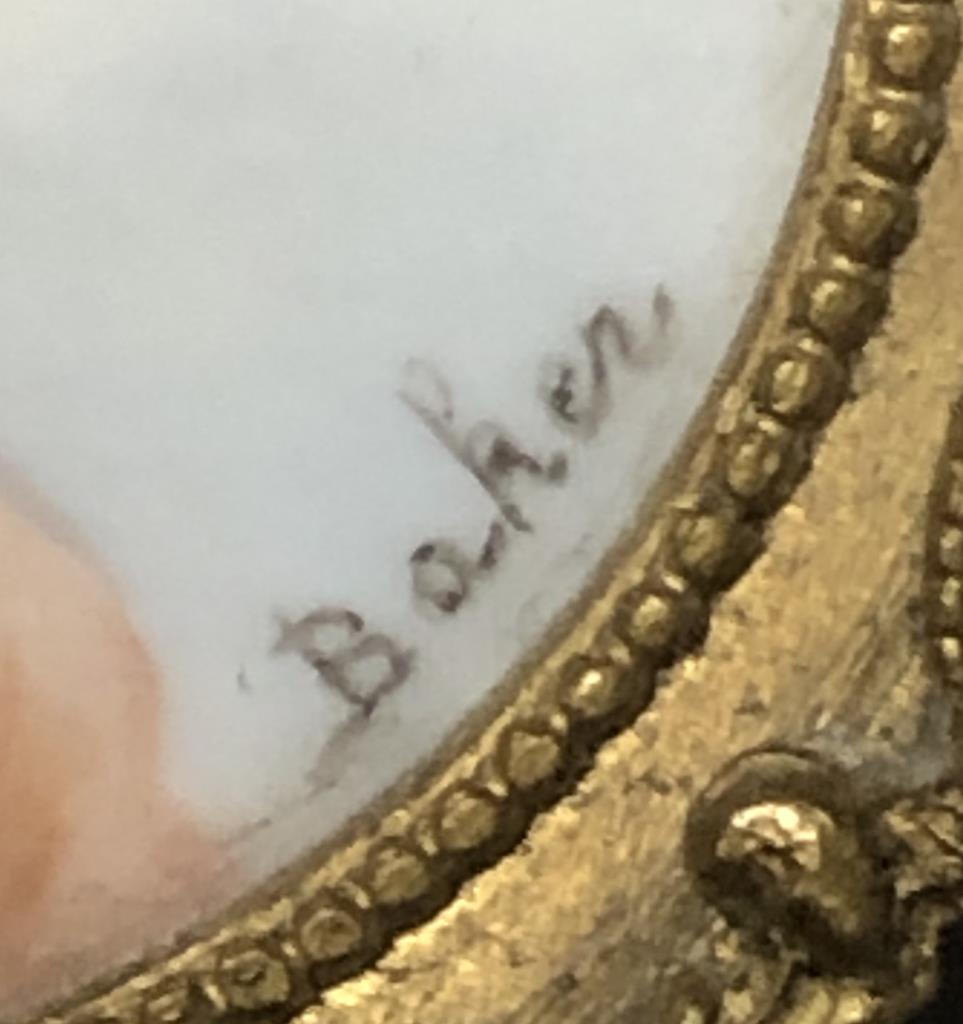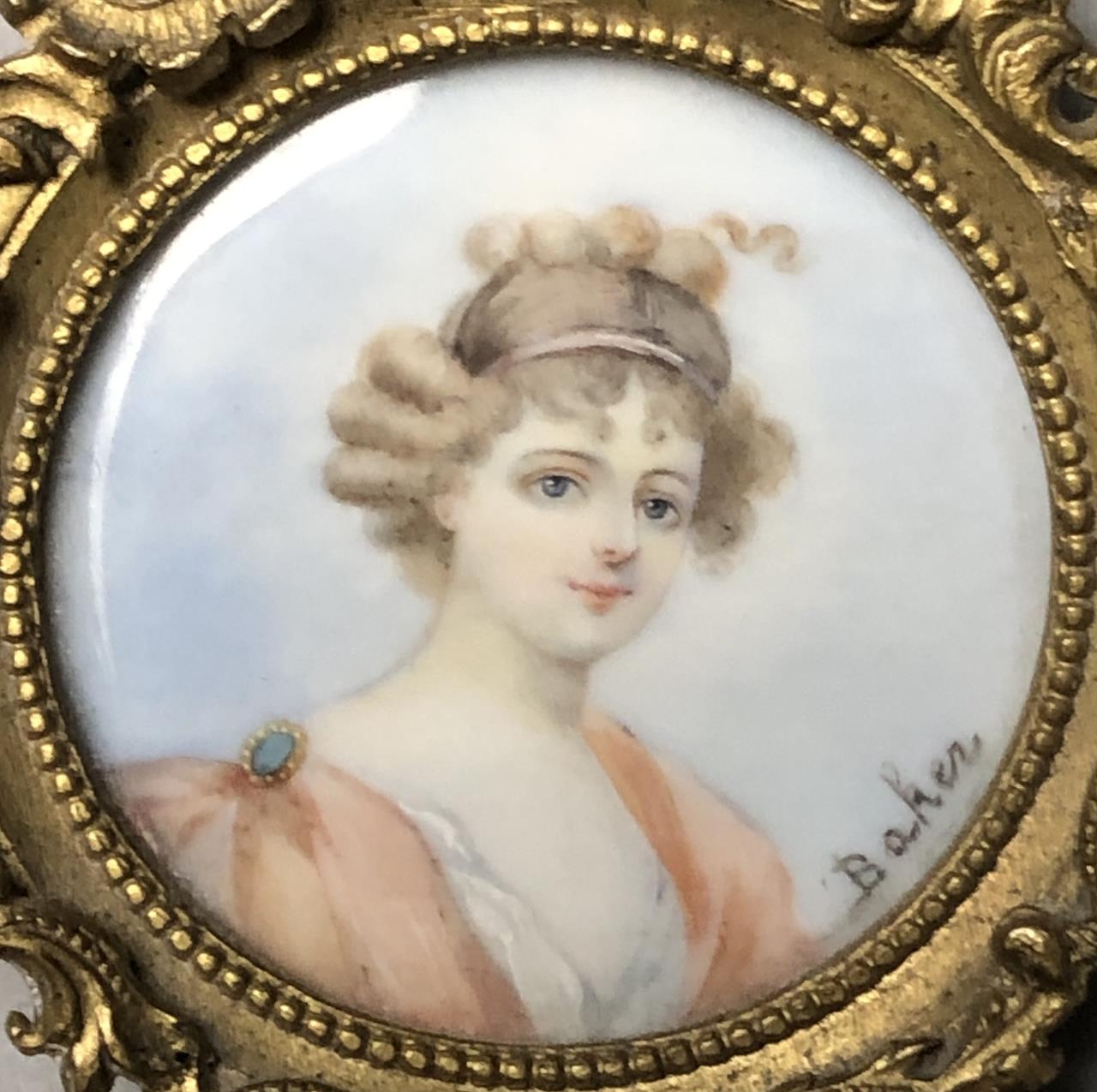 Antique miniature portrait painting, signed “Baker” lower right, in a gilt metal frame with an easel back, circa late 19th / early 20th Century, approximately 2-1/16″ in height. CONDITION: Not inspected out of frame. SHIPPING: In-House Shipping Available. Please read our Shipping Policies and Terms and Conditions