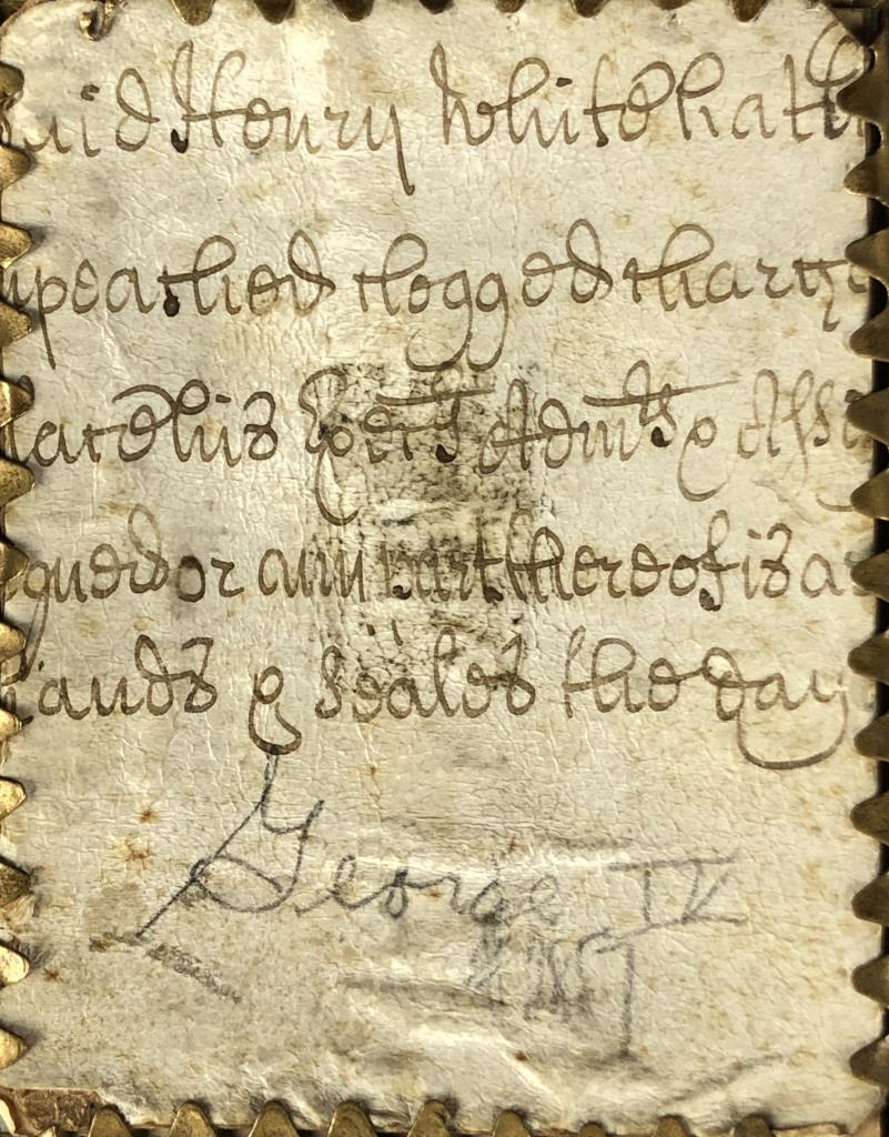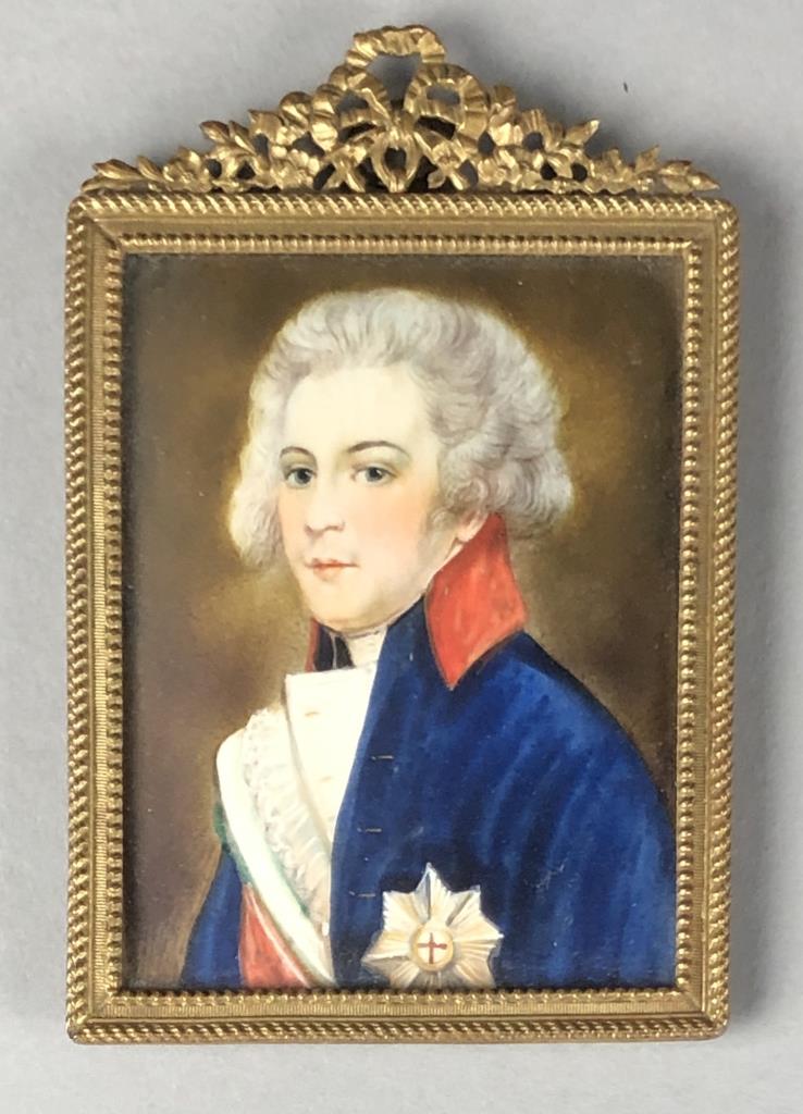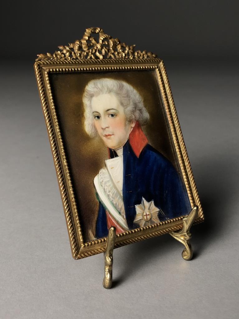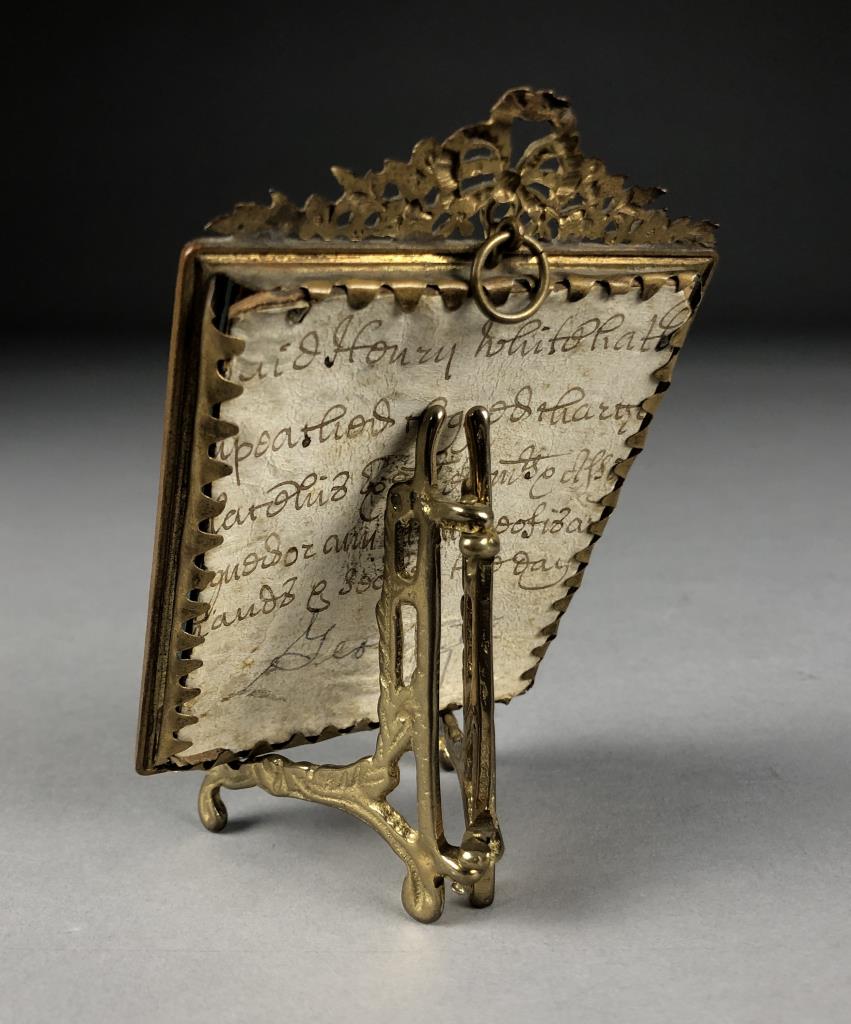 Antique miniature portrait painting, most likely of George IV (British, 1762 – 1830), King of the United Kingdom of Great Britain and Ireland and King of Hanover, handwritten information on reverse appears to be written on vellum, circa early 20th Century, in a gilt metal frame, approximately 4-7/16″ in height, includes separate folding brass easel stand. CONDITION: Not examined out of frame. SHIPPING: In-House Shipping Available. Please read our Shipping Policies and Terms and Conditions