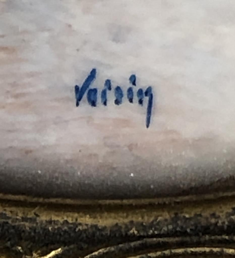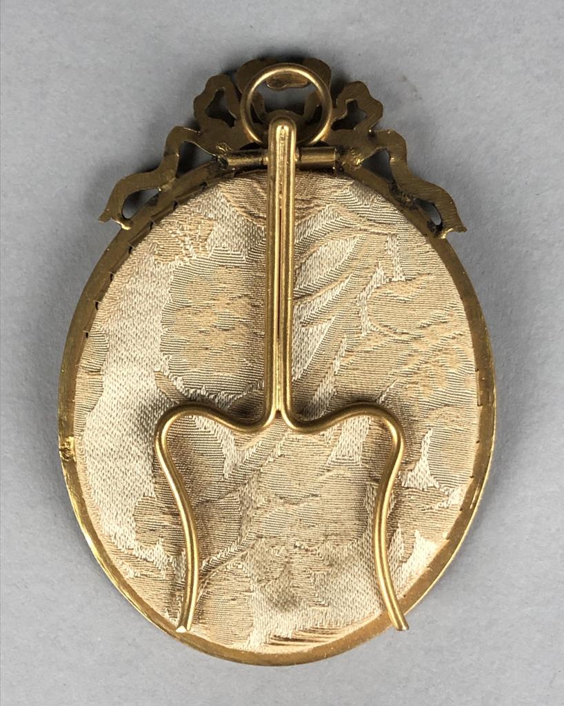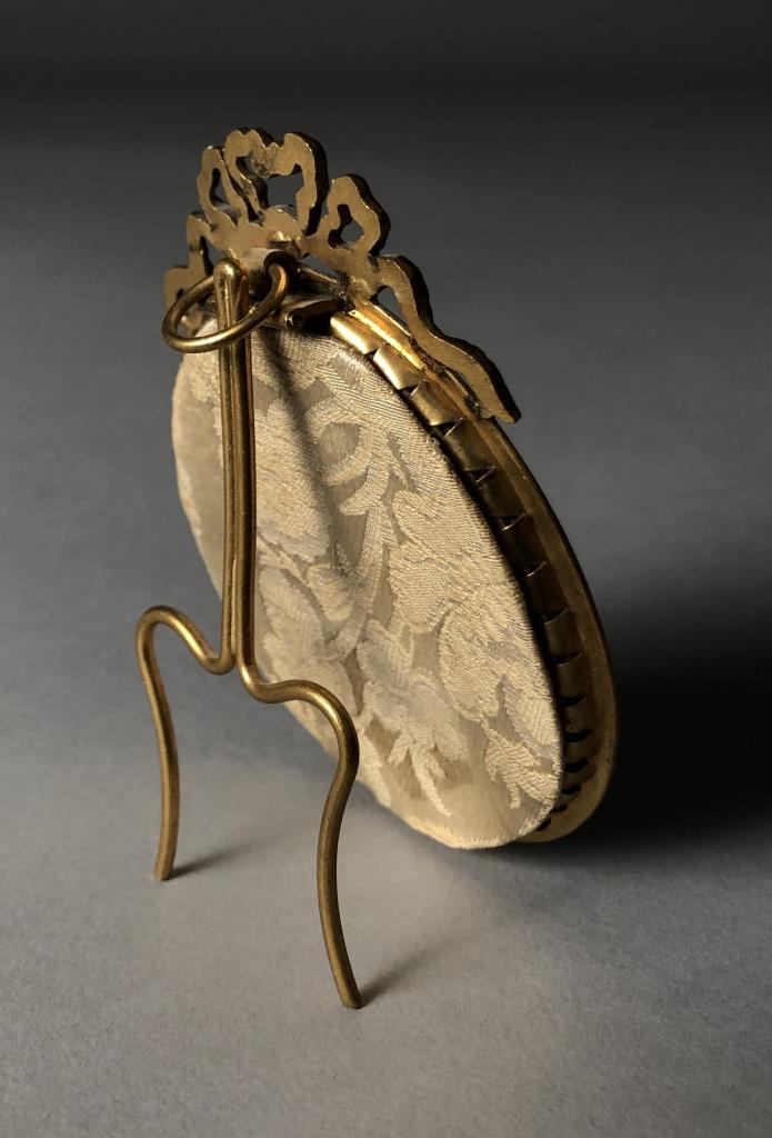 Antique miniature portrait painting, most likely of the Princess Elisabeth Philippe Marie Helene of France (1764 – 1794), also known simply as Madame Elisabeth, who was the youngest sibling of King Louis XVI, and who was executed during the French Revolution, signed lower right, circa early 20th Century, in a gilt metal frame with an easel back, approximately 4″ in height. CONDITION: Not examined out of frame. SHIPPING: In-House Shipping Available. Please read our Shipping Policies and Terms and Conditions