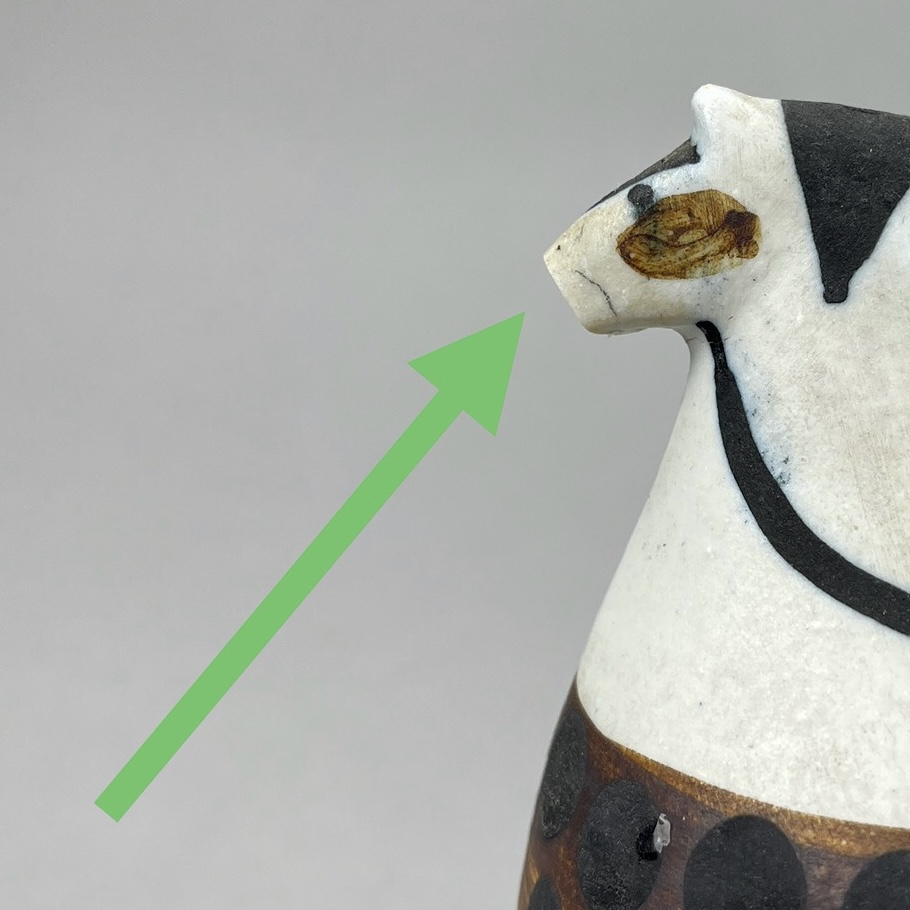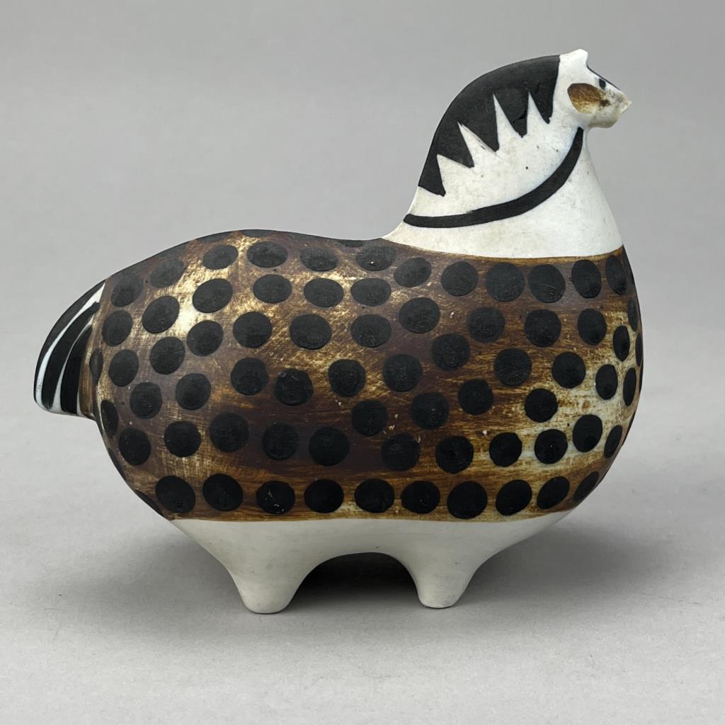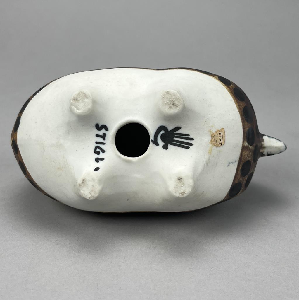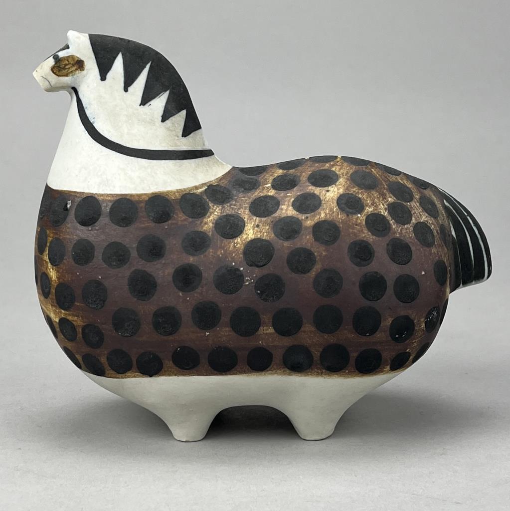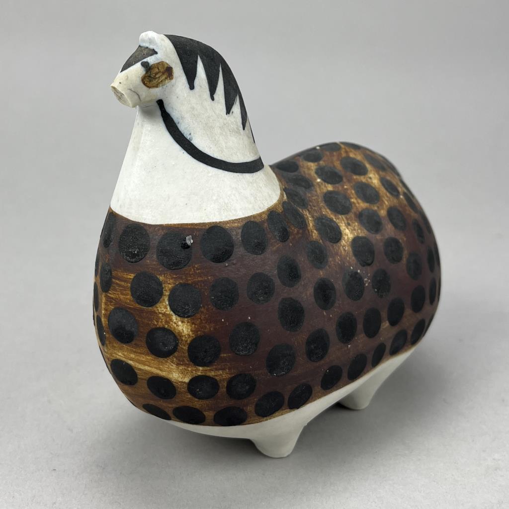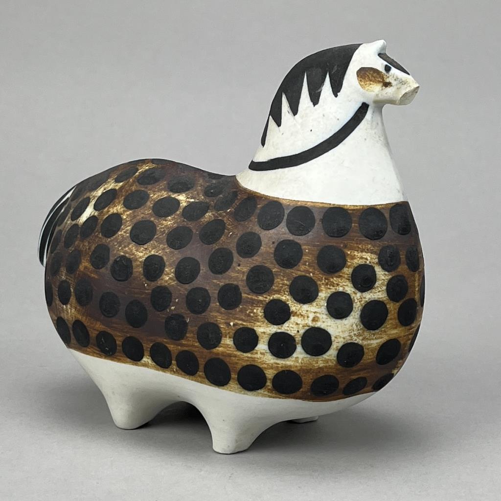 Stig Lindberg (Swedish, 1916-1982), for Gustavsberg, Springare Courser or chubby horse, circa 1956-1957, painted stoneware, singed on underside as well as partial paper label, approximately 5-1/4″ x 6-1/4″ x 2-3/4″. CONDITION: Part of the figure’s head has been broken and is missing, please see photos. SHIPPING: In-House Shipping Available. Please read our Shipping Policies and Terms and Conditions