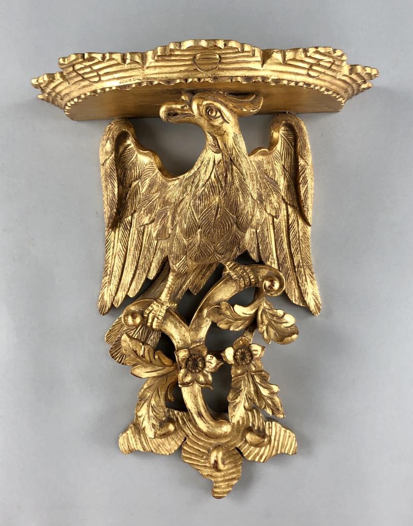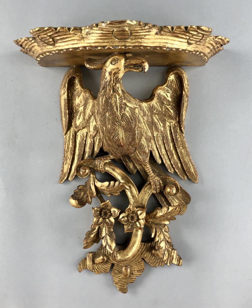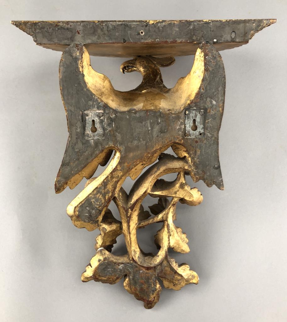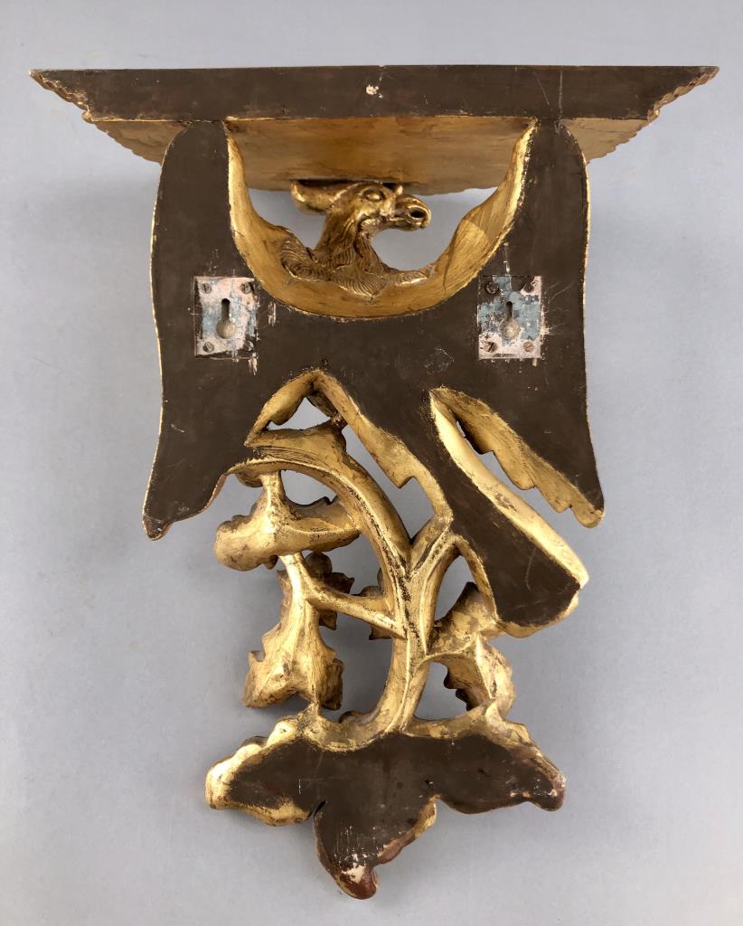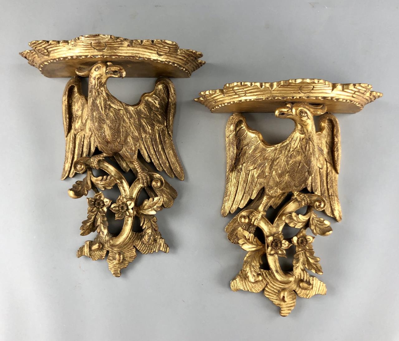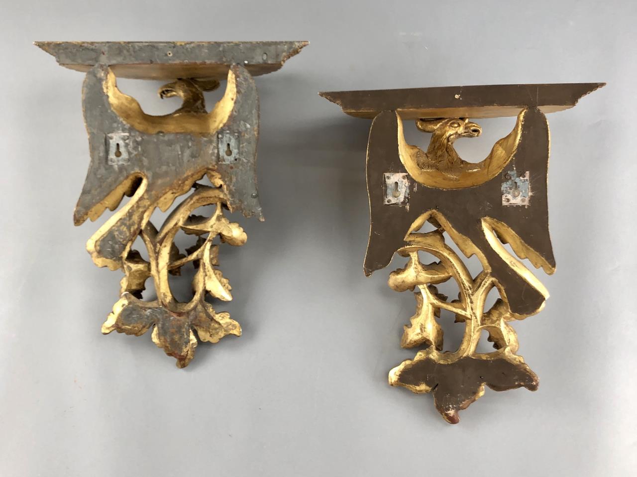 Pair of George II style carved and gilt wood brackets, approximately 16-5/8″ x 13-5/8″ x 7-3/8″. CONDITION: There has been a break and an older repair to the front edge of one of the shelves, please see photos. Also, the back of one of the brackets appears to have been painted at some point. SHIPPING: In-House Shipping Available. Please read our Shipping Policies and Terms and Conditions