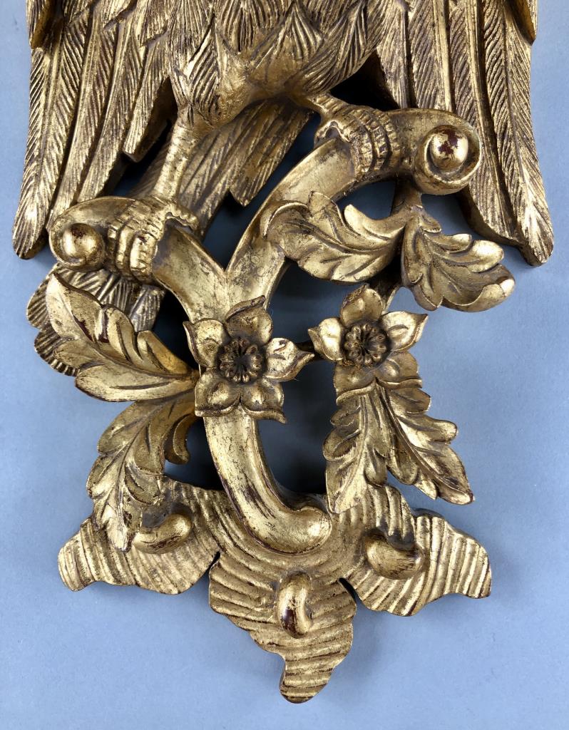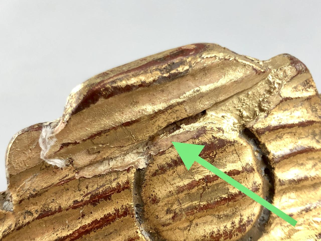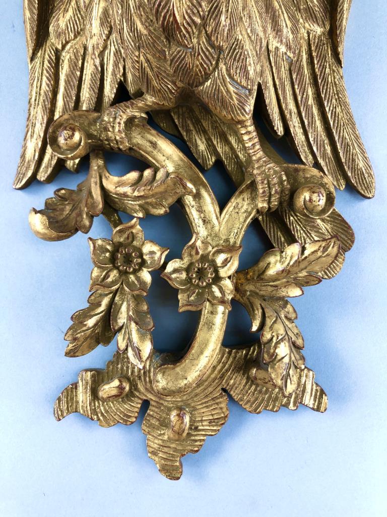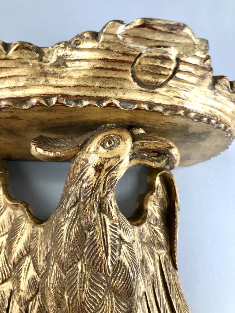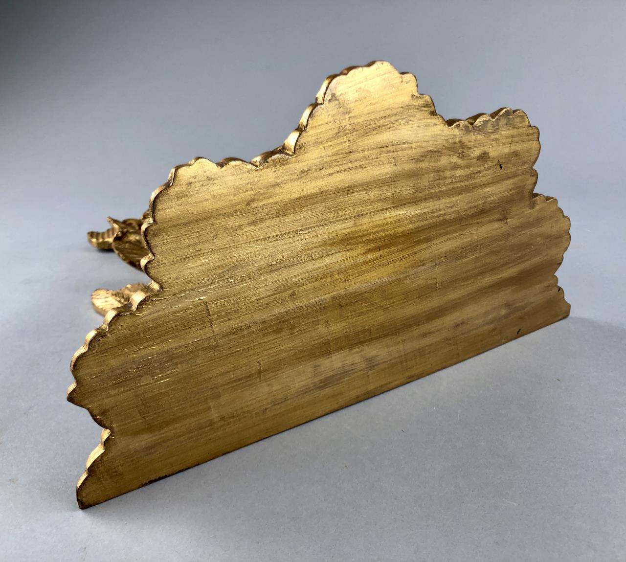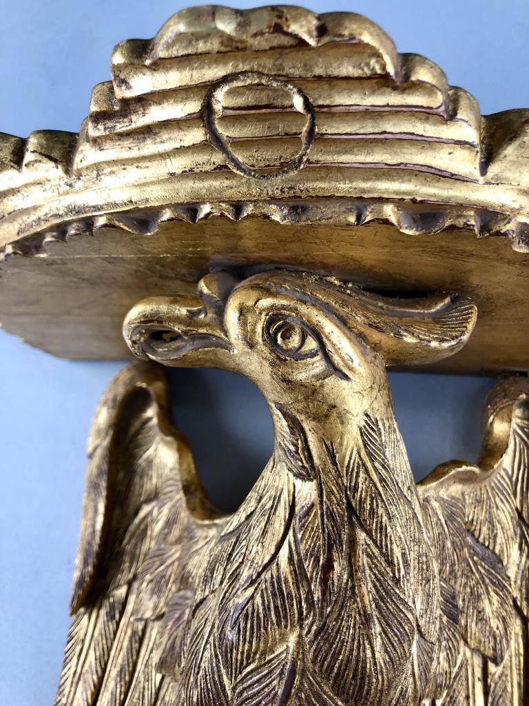 Pair of George II style carved and gilt wood brackets, approximately 16-5/8″ x 13-5/8″ x 7-3/8″. CONDITION: There has been a break and an older repair to the front edge of one of the shelves, please see photos. Also, the back of one of the brackets appears to have been painted at some point. SHIPPING: In-House Shipping Available. Please read our Shipping Policies and Terms and Conditions