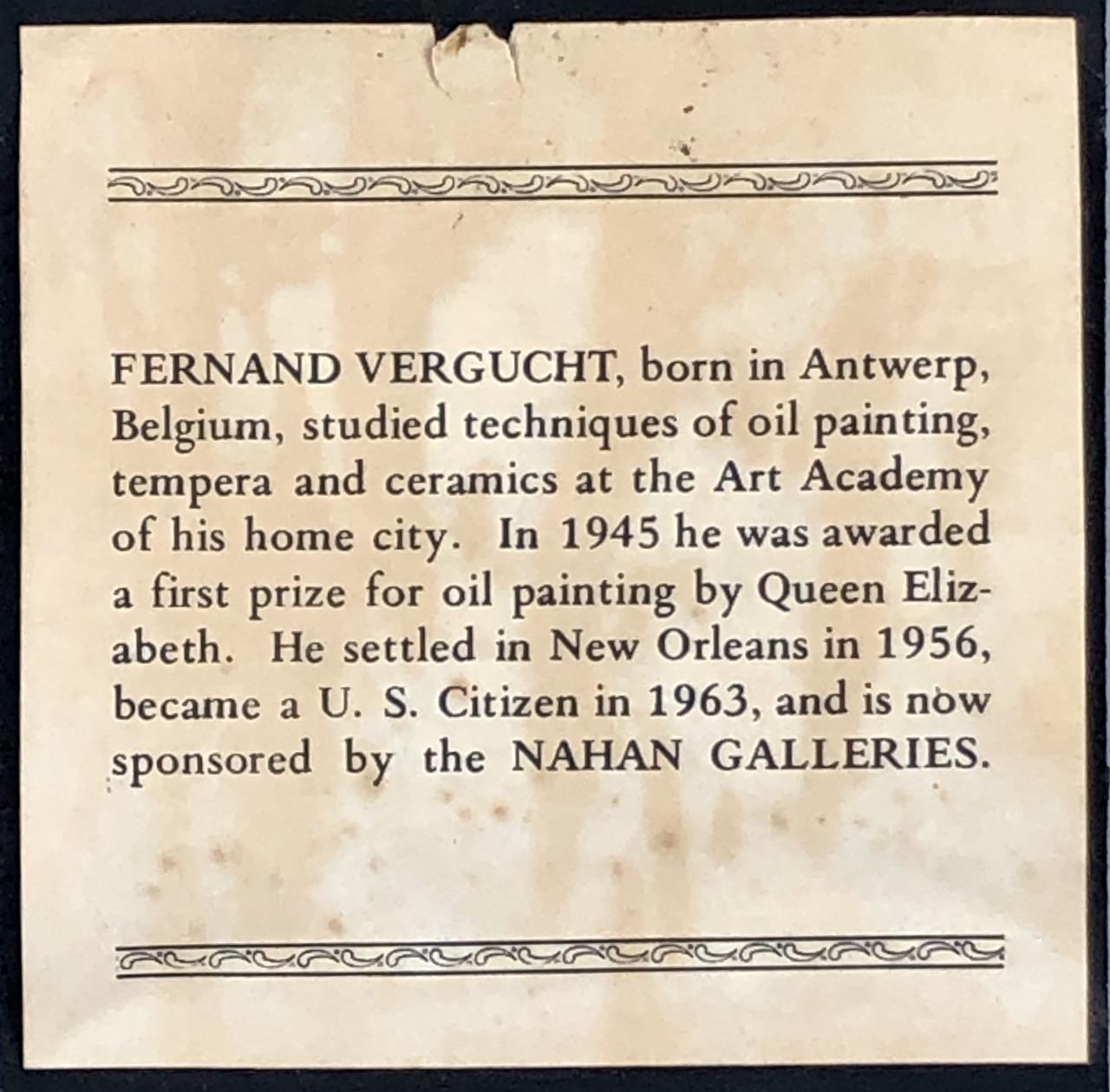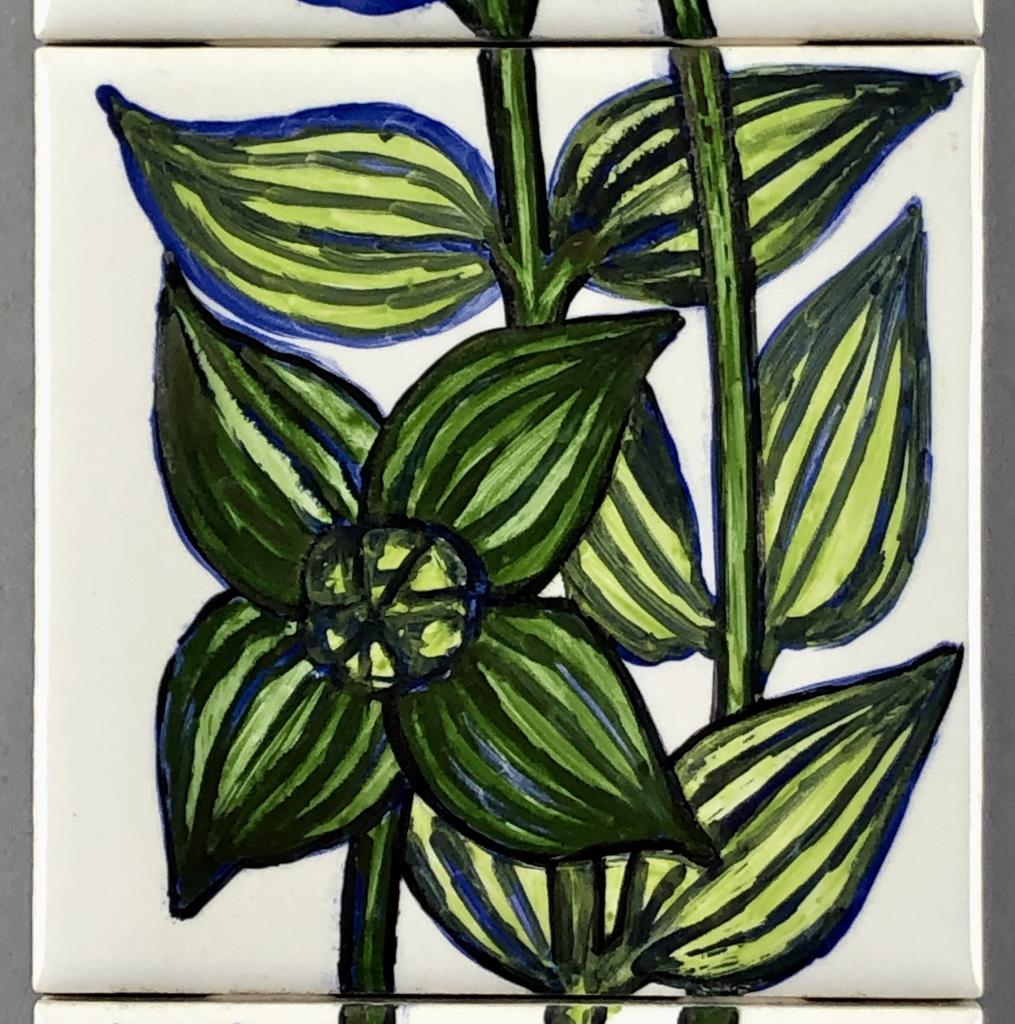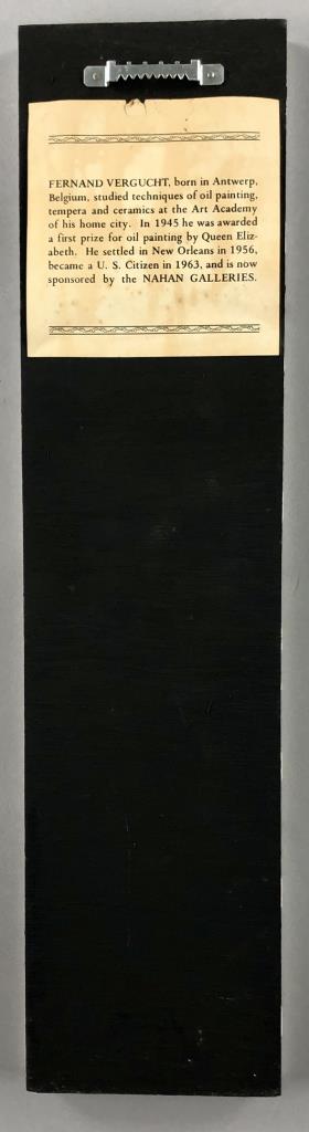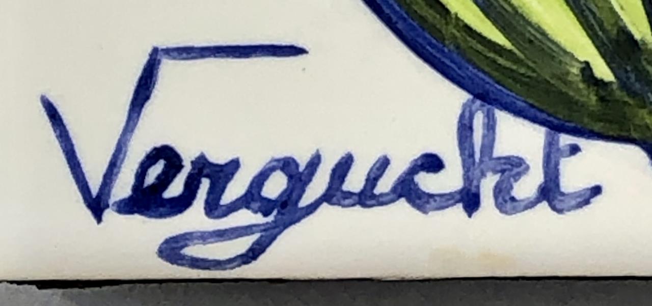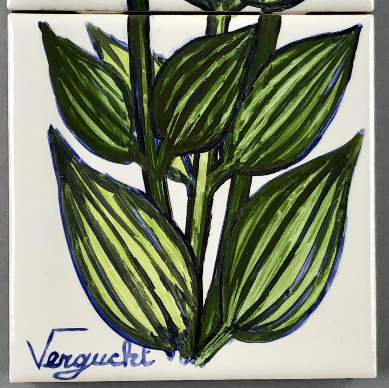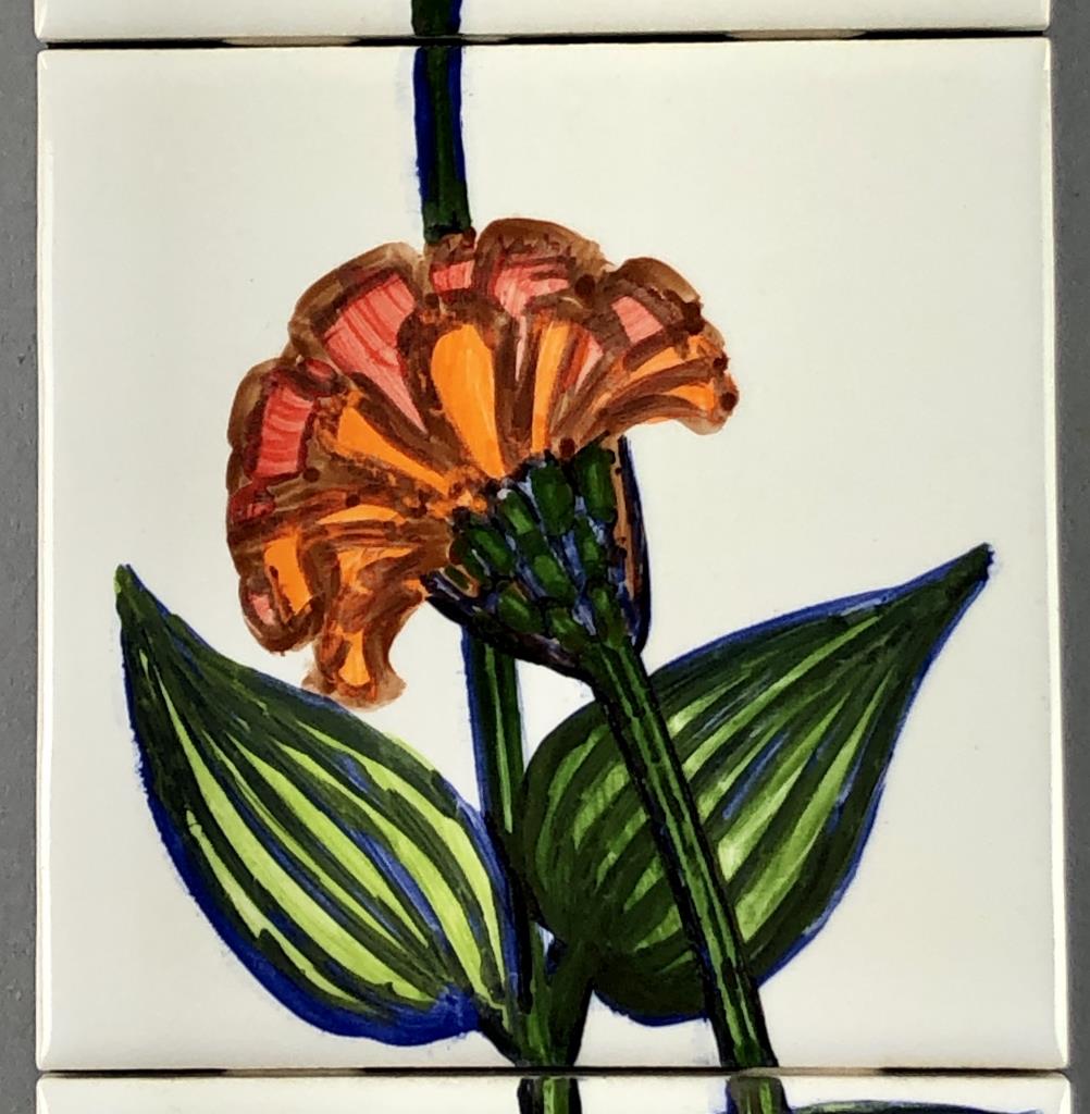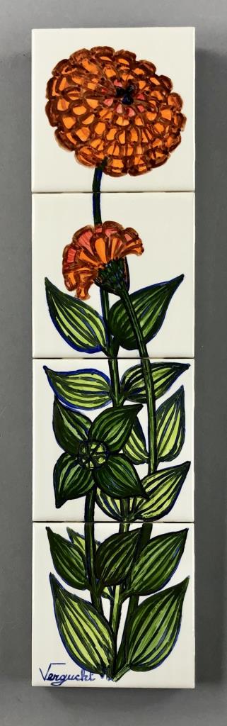 Fernand Jacobs Vergucht (Belgian/American, 1923 – 2003), oil paintings on ceramic tiles in four sections, depicting orange flowers in bloom, perhaps zinnias or dahlias, attached to a black painted wood panel, signed lower left, with a gallery tag from Nahan Galleries in New Orleans, Louisiana, circa 1970s, 17-3/16″ x 4-1/4″. CONDITION: SHIPPING: In-House Shipping Available. Please read our Shipping Policies and Terms and Conditions