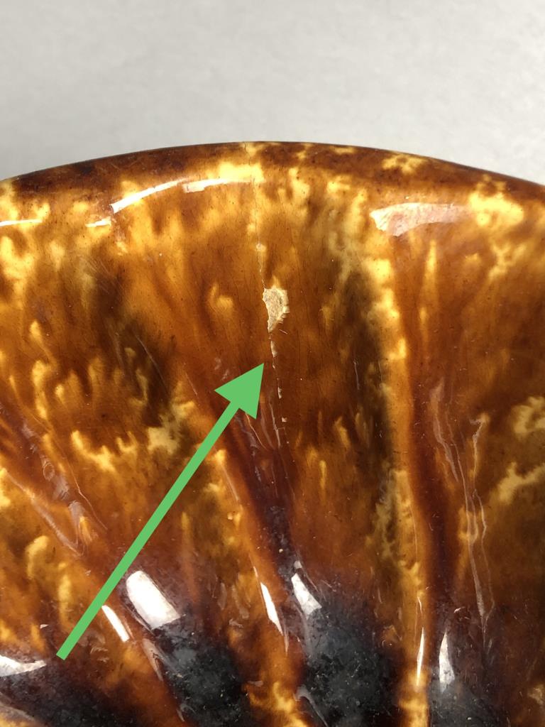 Rockingham ware, or yellow ware, spiral mold, unmarked, circa mid to late 19th Century, 8″ x 3-1/2″. CONDITION: Cracked in two places, one going all the way through and the other not. SHIPPING: In-House Shipping Available. Please read our Shipping Policies and Terms and Conditions