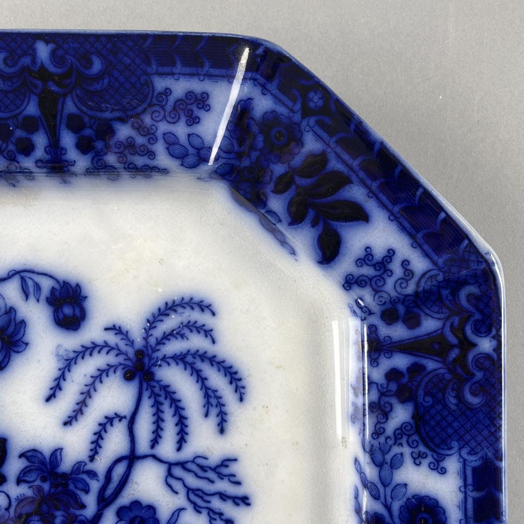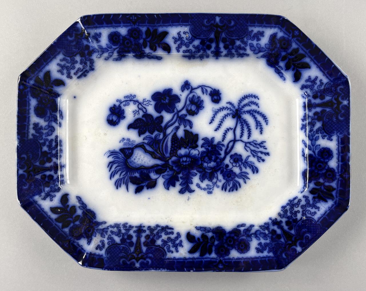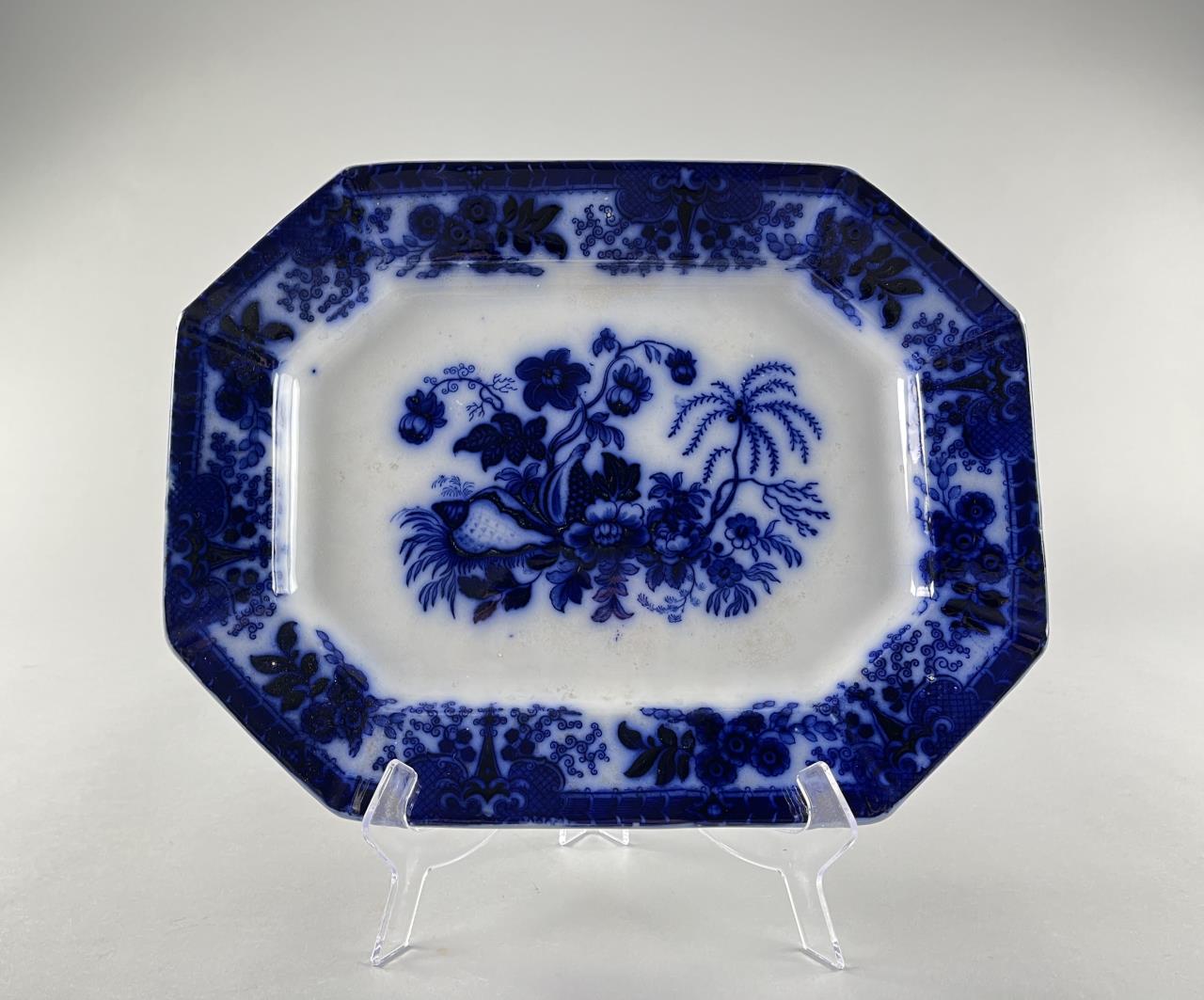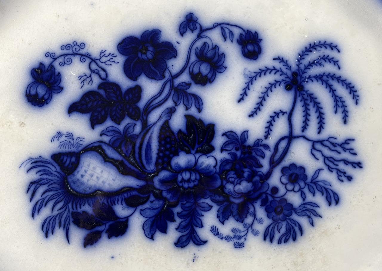 Antique flow blue serving platter, with a seashell and floral motif, unsigned but attributed to Edward Challinor & Co. (Stoke-on-Trent, England), circa 1860s, measures approximately 15-7/8″ x 12-3/8″. CONDITION: SHIPPING: In-House Shipping Available. Please read our Shipping Policies and Terms and Conditions