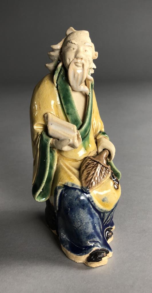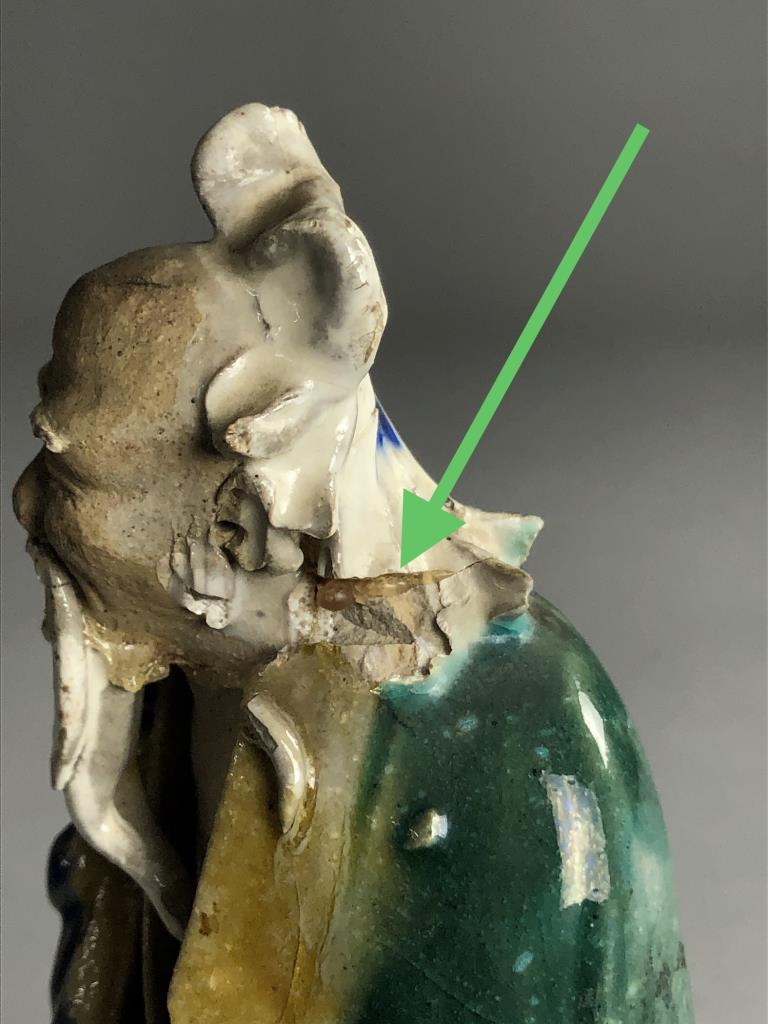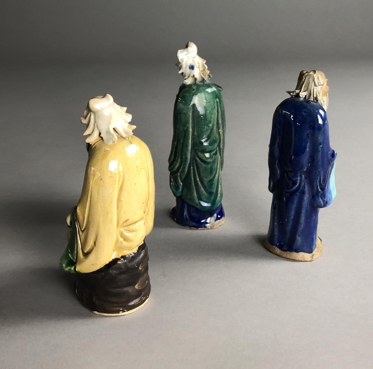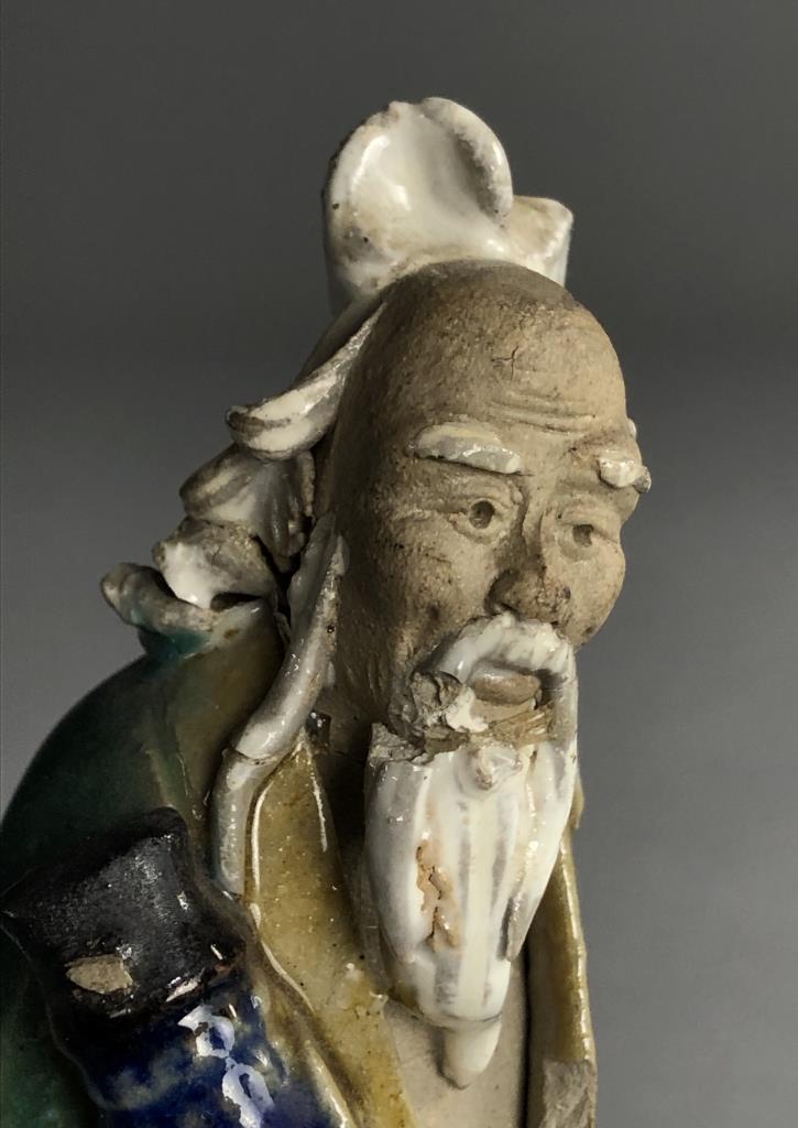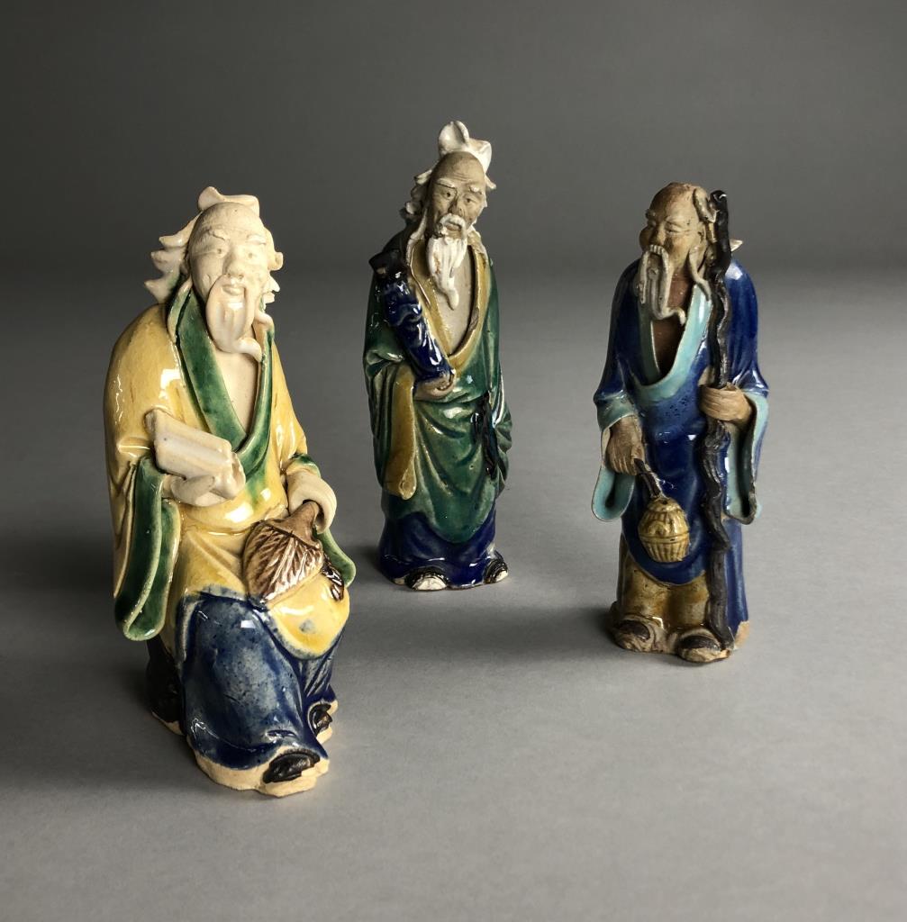 Three Chinese mud men figures, circa early 20th Century, each with impressed “China” on bottom, the largest is approximately 6-1/2″ tall. CONDITION: The head on the largest one has been broken and repaired, there is also a chip on the edge of the collar of the robe, please see last three photos. SHIPPING: In-House Shipping Available. Please read our Shipping Policies and Terms and Conditions