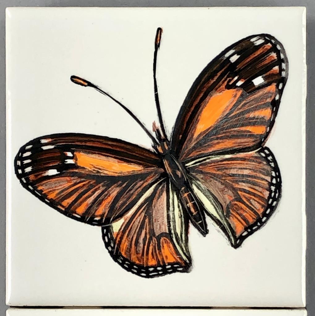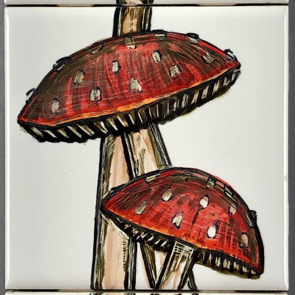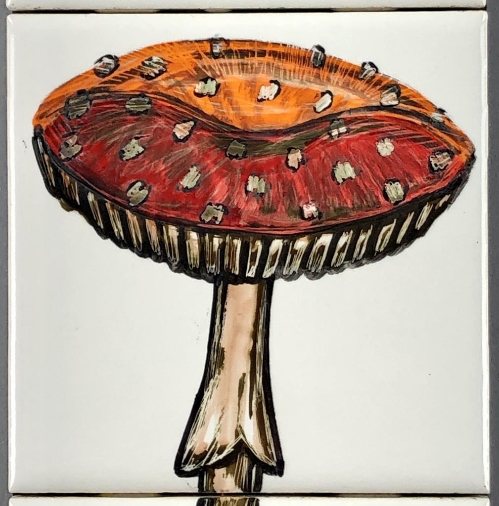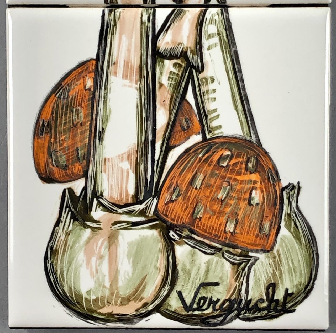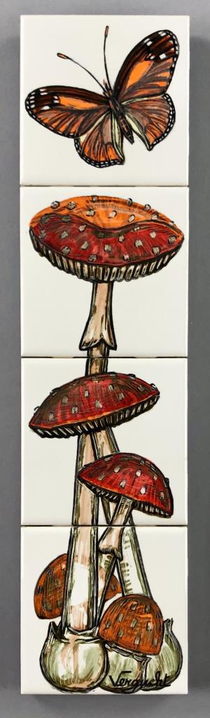 Fernand Jacobs Vergucht (Belgian/American, 1923 – 2003), oil paintings on ceramic tiles in four sections, depicting mushrooms and a butterfly, attached to a black painted wood panel, signed lower right, most likely from Nahan Galleries in New Orleans, Louisiana, circa 1970s, 17-3/16″ x 4-1/4″. CONDITION: SHIPPING: In-House Shipping Available. Please read our Shipping Policies and Terms and Conditions