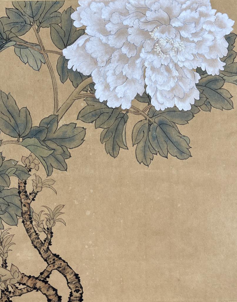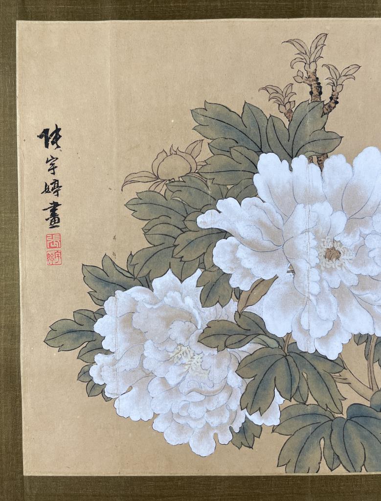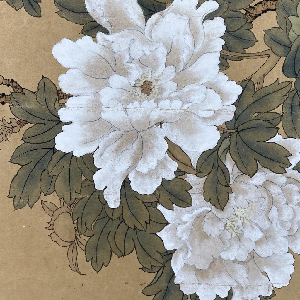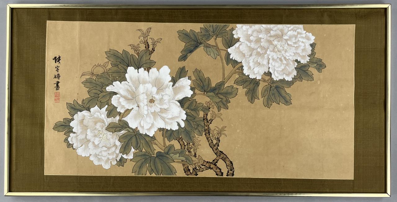 Chinese watercolor painting on paper, depicting white peony flowers on branches, calligraphy and chop marks center left, in a contemporary gold color metal frame measuring 32-1/4″ x 16-1/4″, without glass. CONDITION: Not examined out of frame. SHIPPING: Local pick-up or third party shipping only for this lot. Please see the Shipping Policy for information on suggested shippers. We recommend the Pak Mail Store of Battle Creek to assist you. Please contact the shipper of your choice for shipping estimates on this lot. Refer to the Shipping section in our full Terms and Conditions for all information on shipping.
