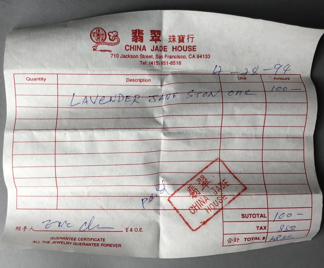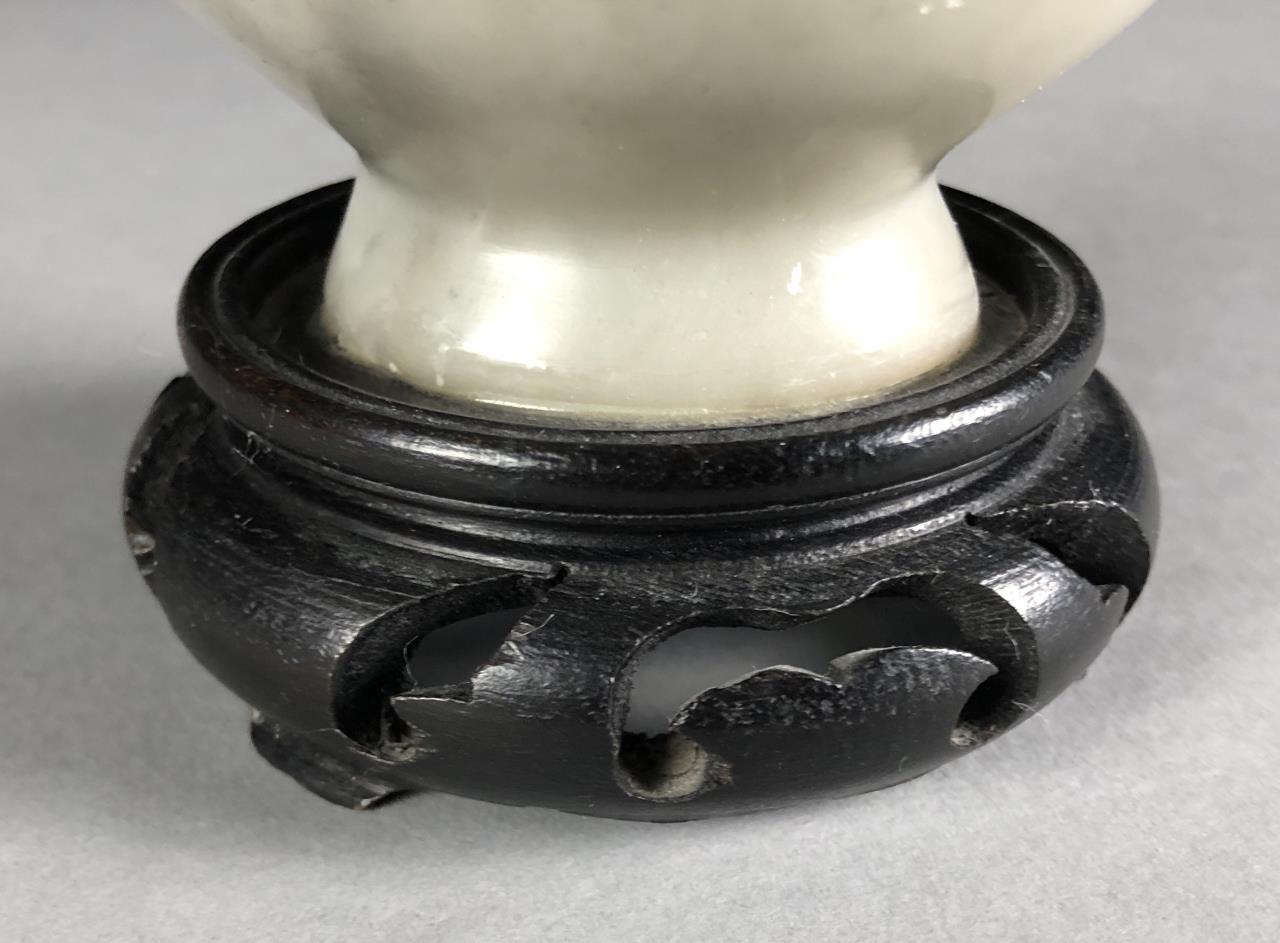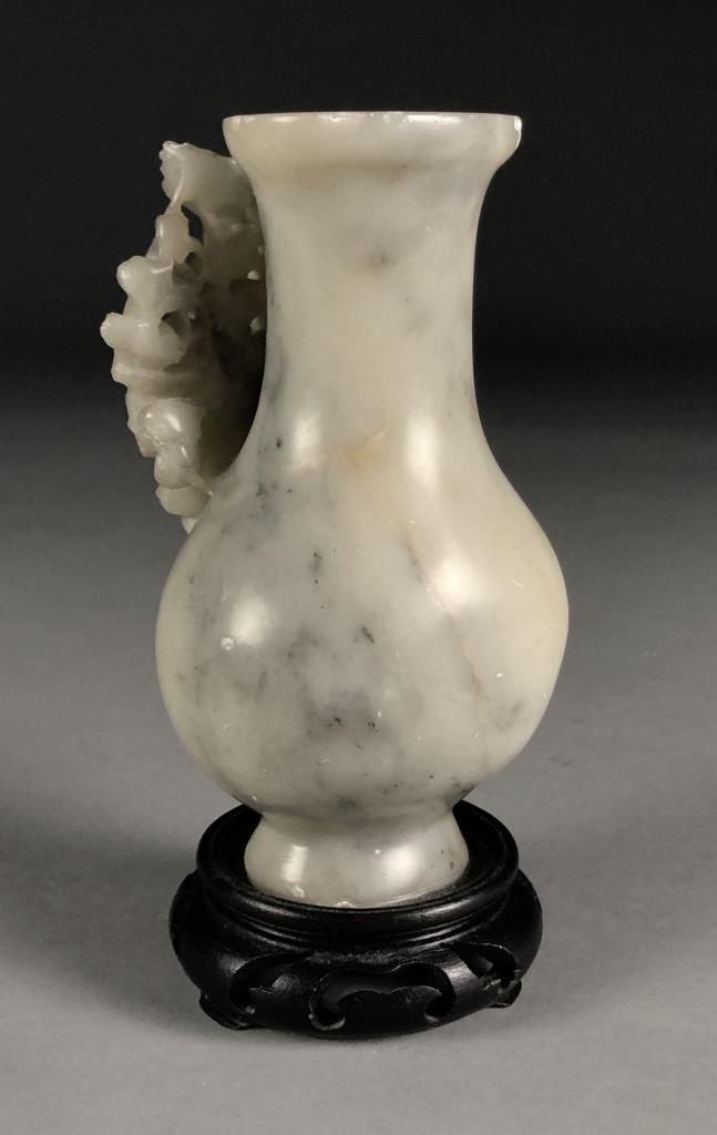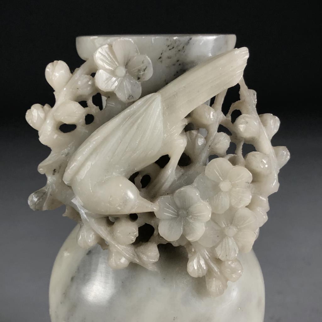 Chinese, hand carved lavender jade vase, featuring a bird amongst flowering foliage, attach to a carved wood base, circa late 20th Century. 7″ tall including base. CONDITION: Some minor chipping, especially on rim. SHIPPING: In-House Shipping Available. Please read our Shipping Policies and Terms and Conditions