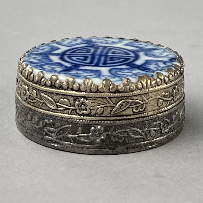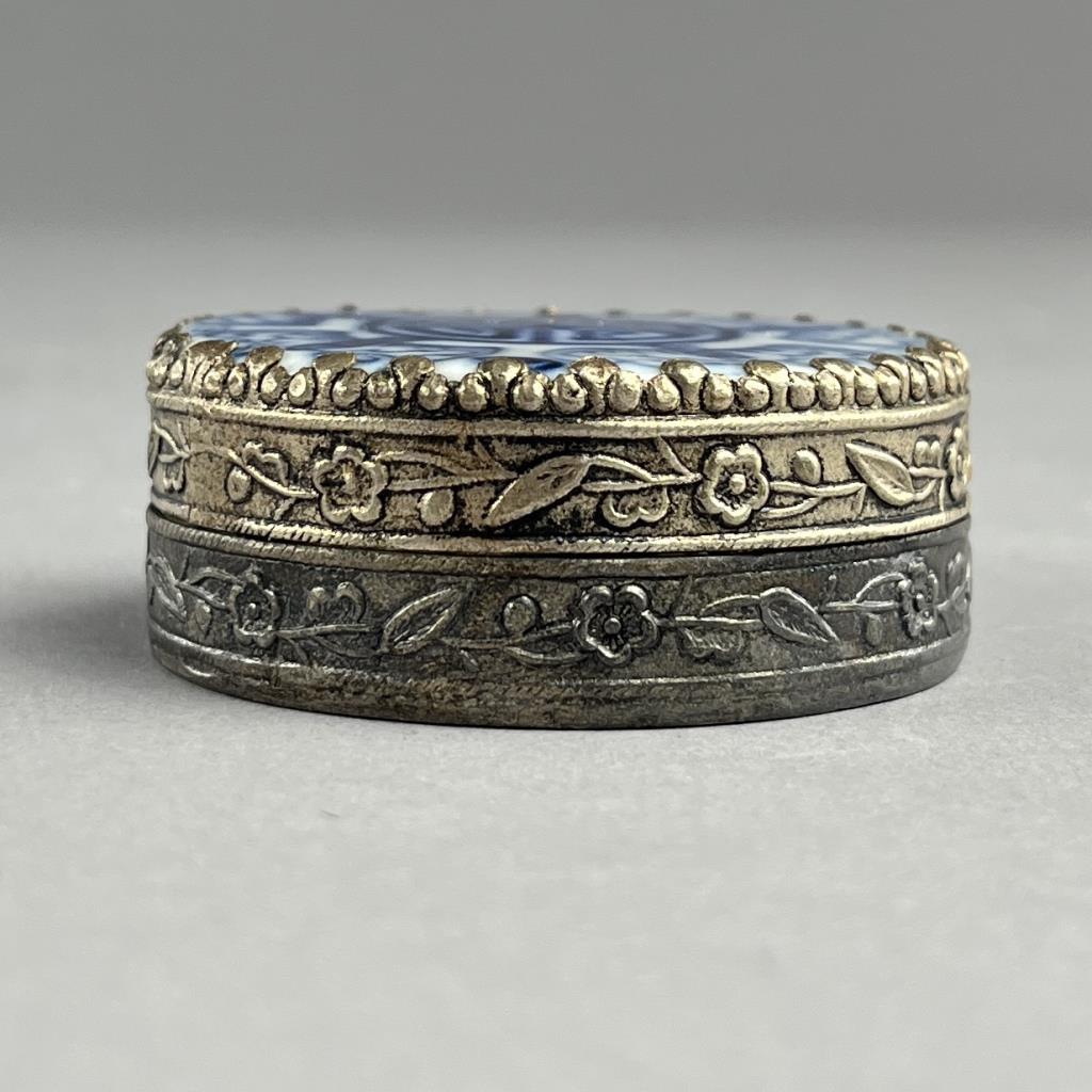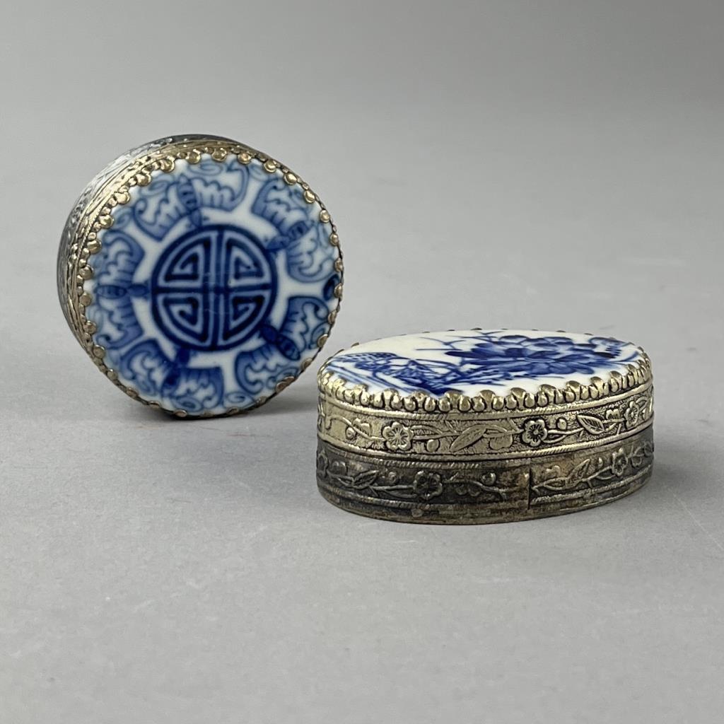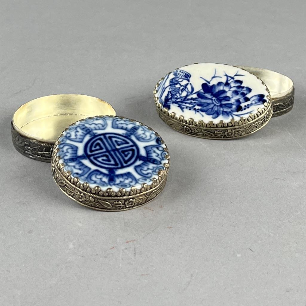 Two silverplated compacts, or trinket boxes, with fragments of either 18th or 19th Century Chinese blue and white porcelain, possibly brought up from one of the many shipwrecks that was discovered during 1980s, the larger one is approximately 2-9/16″ x 1-13/16″ x 7/8″. CONDITION: SHIPPING: In-House Shipping Available. Please read our Shipping Policies and Terms and Conditions