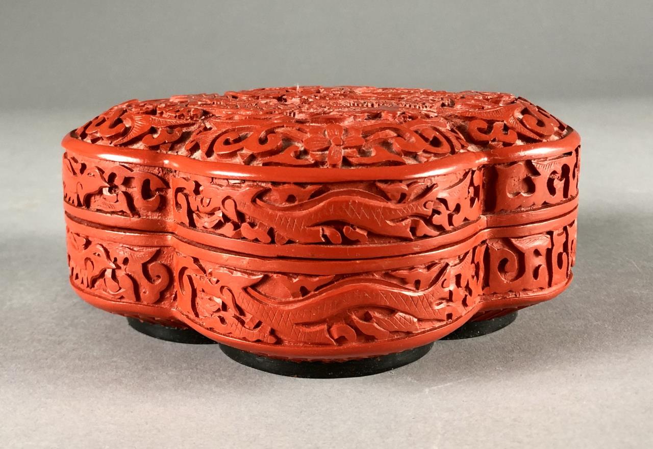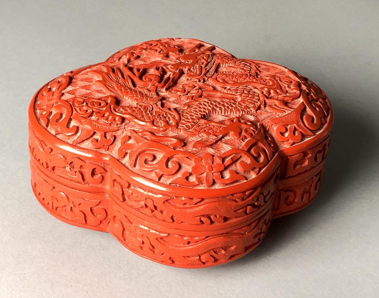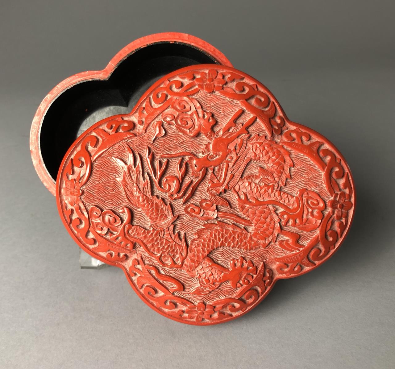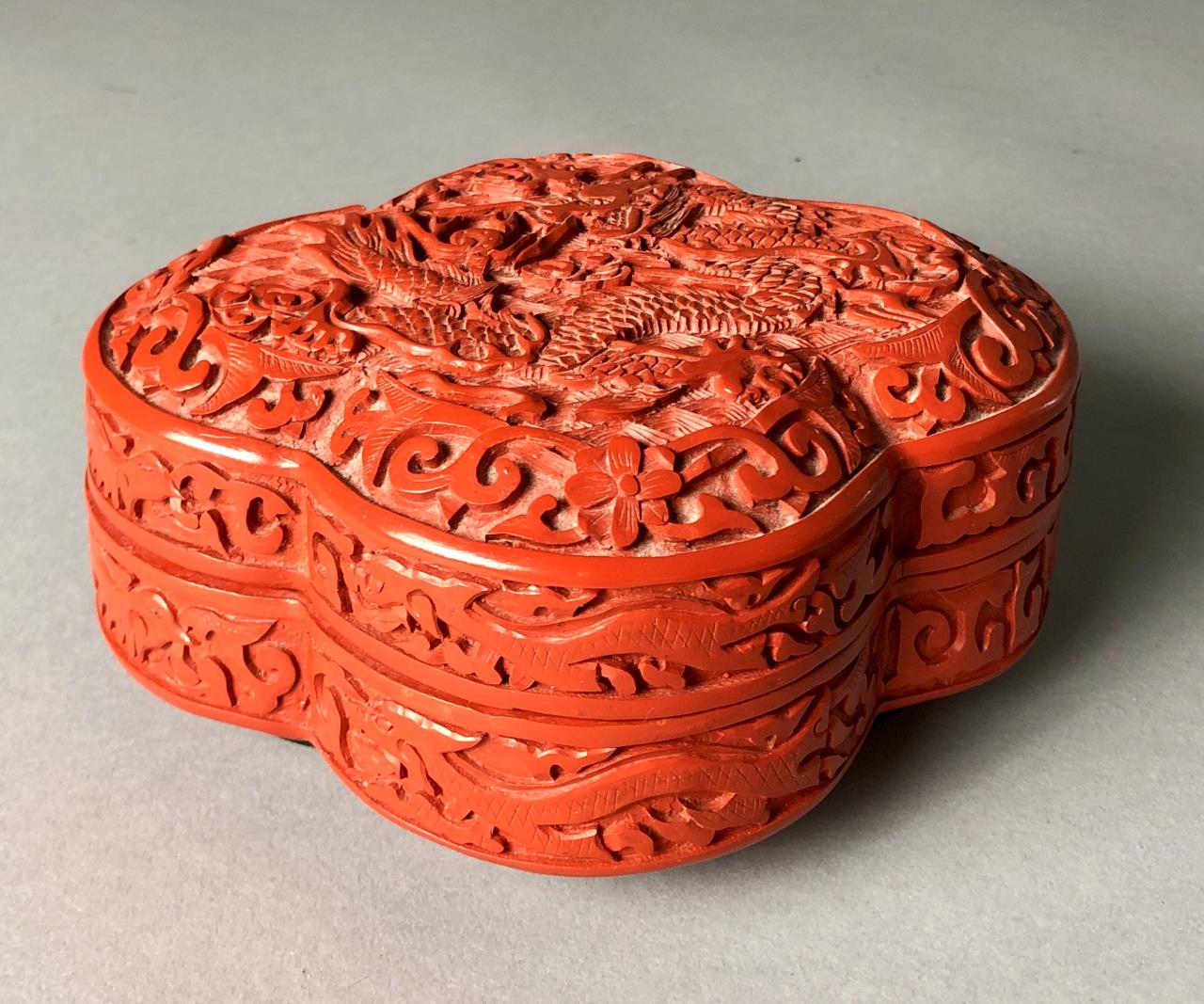 Chinese carved lacquered cinnabar box, depicting a five clawed dragon and the flaming pearl, mid to late 20th Century, approximately 6″ x 5-1/4″ x 2-1/2″. CONDITION: SHIPPING: In-House Shipping Available. Please read our Shipping Policies and Terms and Conditions
