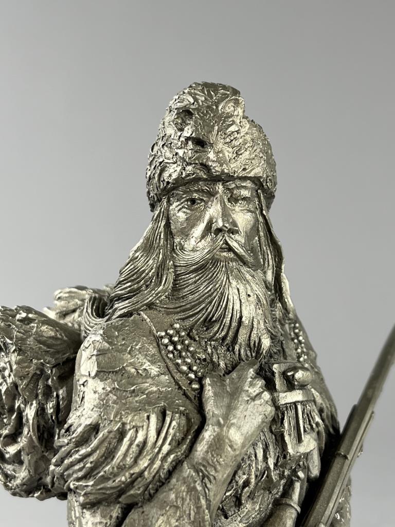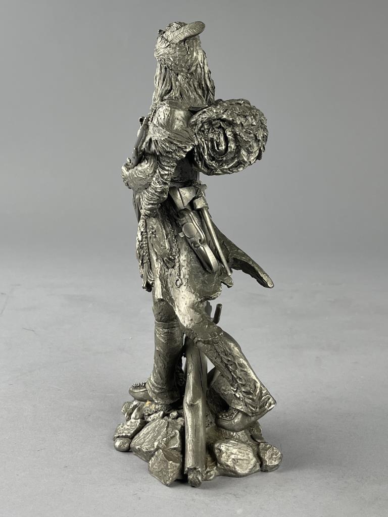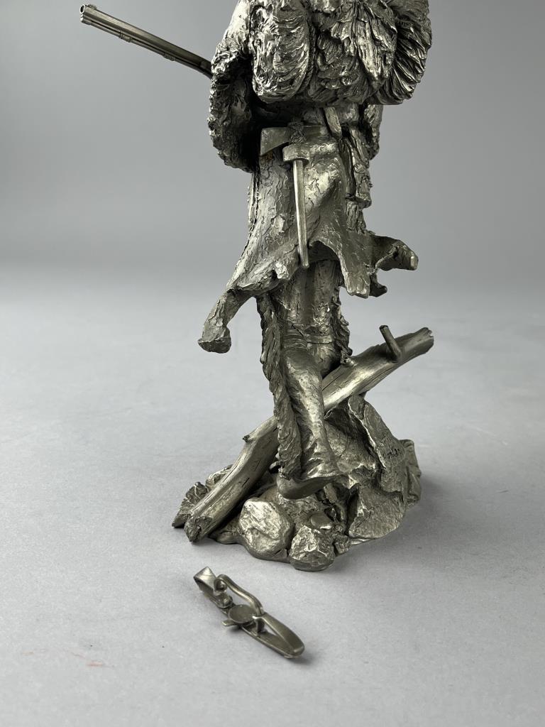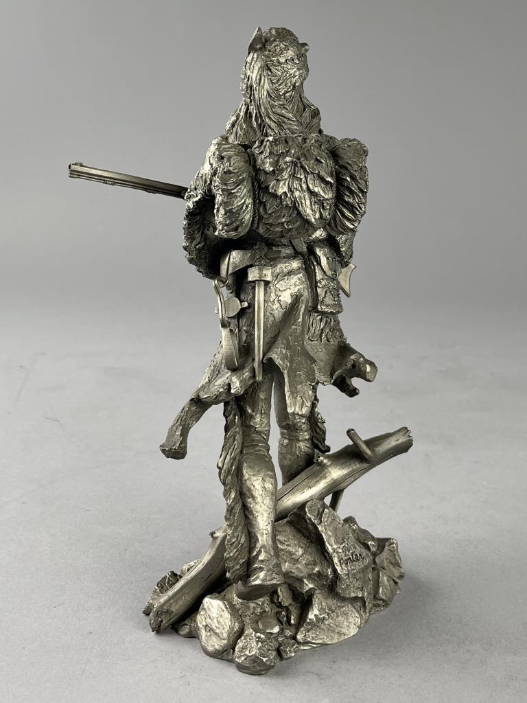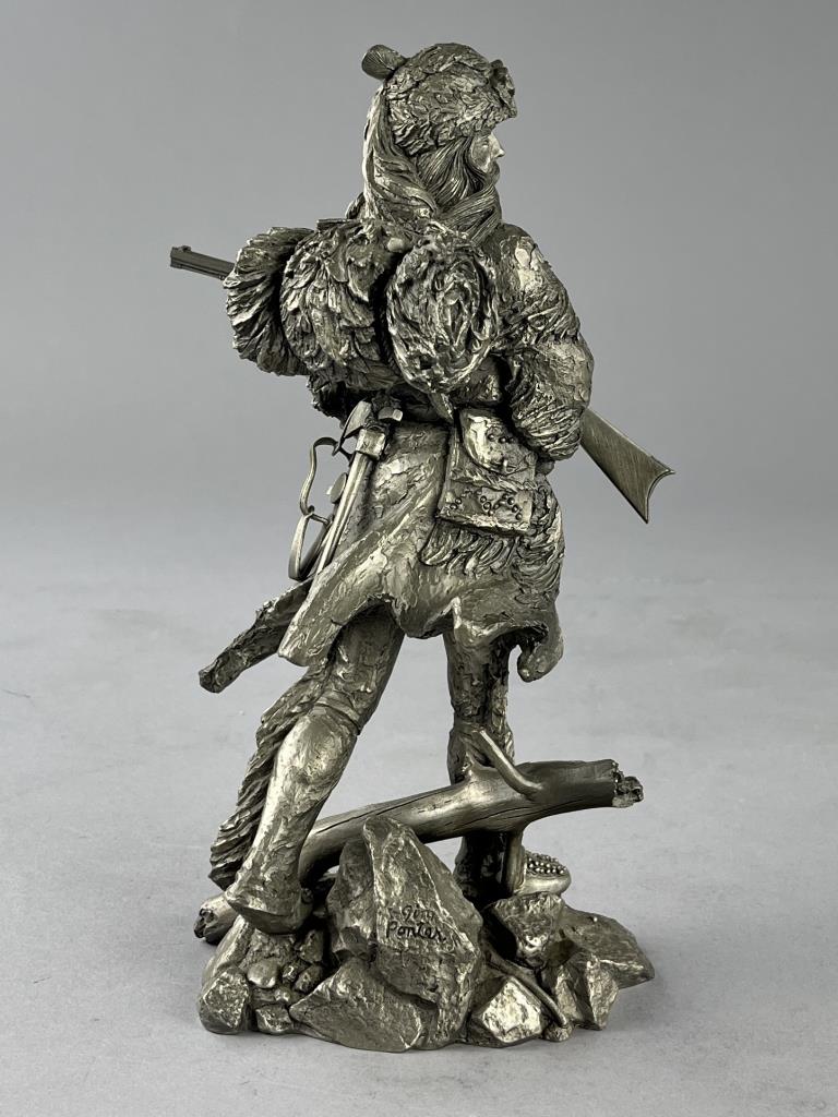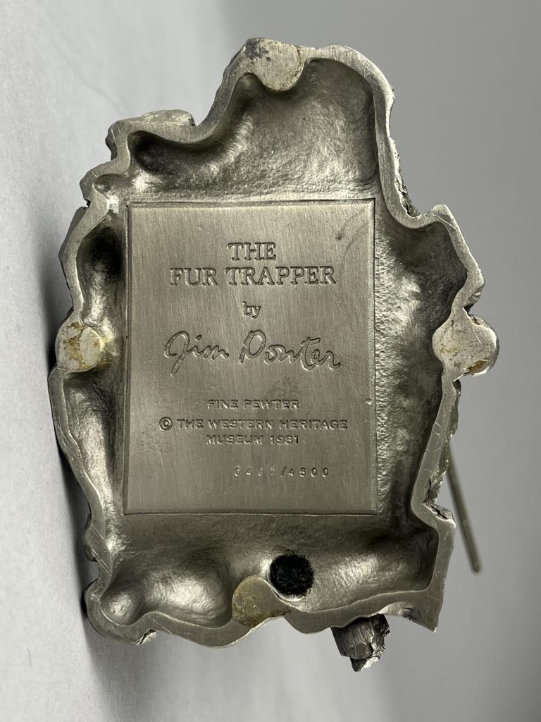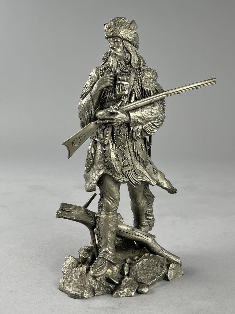 James John Ponter (American, 1923-2007), limited edition pewter figure, titled “The Fur Trapper”, depicting a Western frontier fur trader holding a rifle, circa 1981, #0407/4500, The Western Heritage Museum, marked on underside, approximately 9-3/4″ (H). CONDITION: The trap on the figures belt is loose and detached but present. SHIPPING: In-House Shipping Available. Please read our Shipping Policies and Terms and Conditions