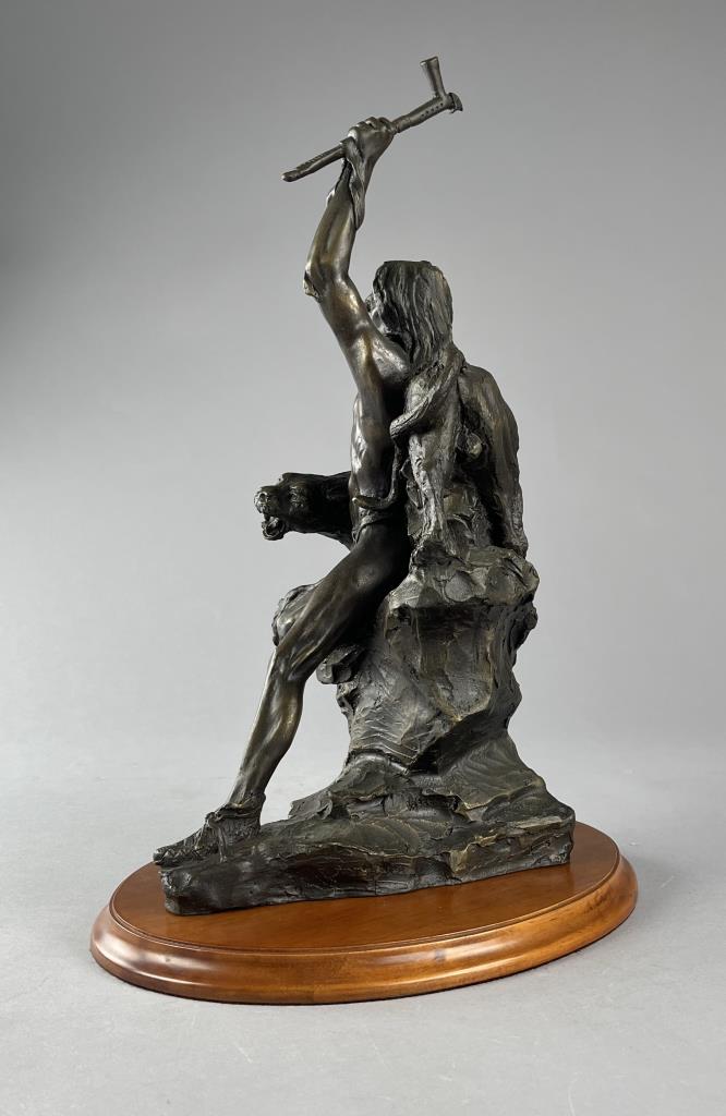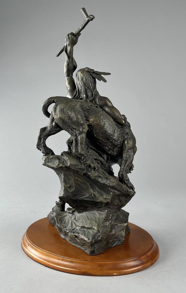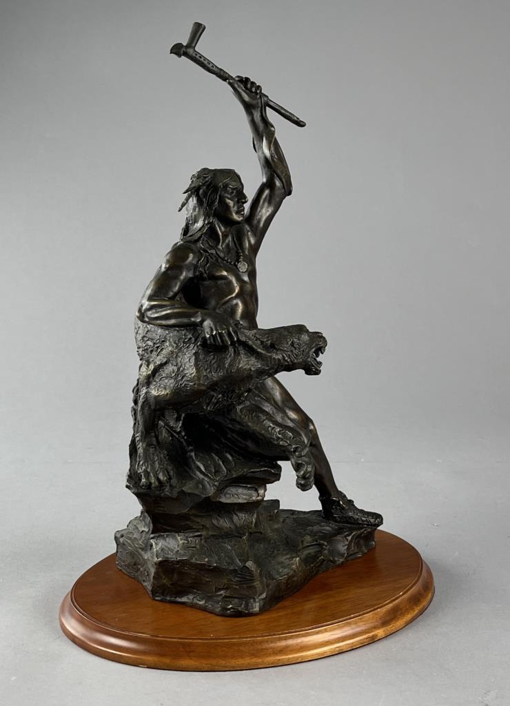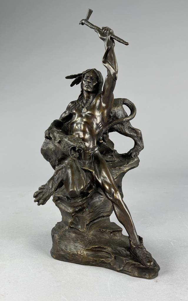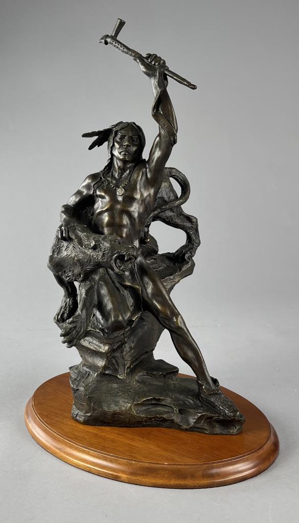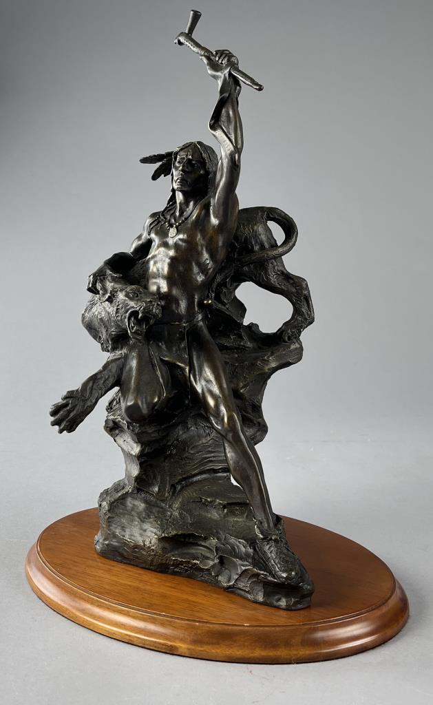 Buck McCain (American, b. 1943), bronze statue, titled “Spirit of War, Spirit of Peace”, depicting a Native American warrior alongside a mountain lion, marked at base on bronze “McCAIN © TFM,” on a detachable wood base, approximately 17-1/4″ (H) (including base). CONDITION: Local pick-up or third party shipping only for this lot. Please see the Shipping Policy for information on suggested shippers. We recommend the Pak Mail Store of Battle Creek to assist you. Please contact the shipper of your choice for shipping estimates on this lot. Refer to the Shipping section in our full Terms and Conditions for all information on shipping. SHIPPING: In-House Shipping Available. Please read our Shipping Policies and Terms and Conditions