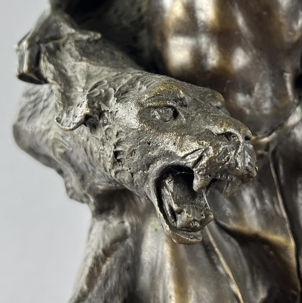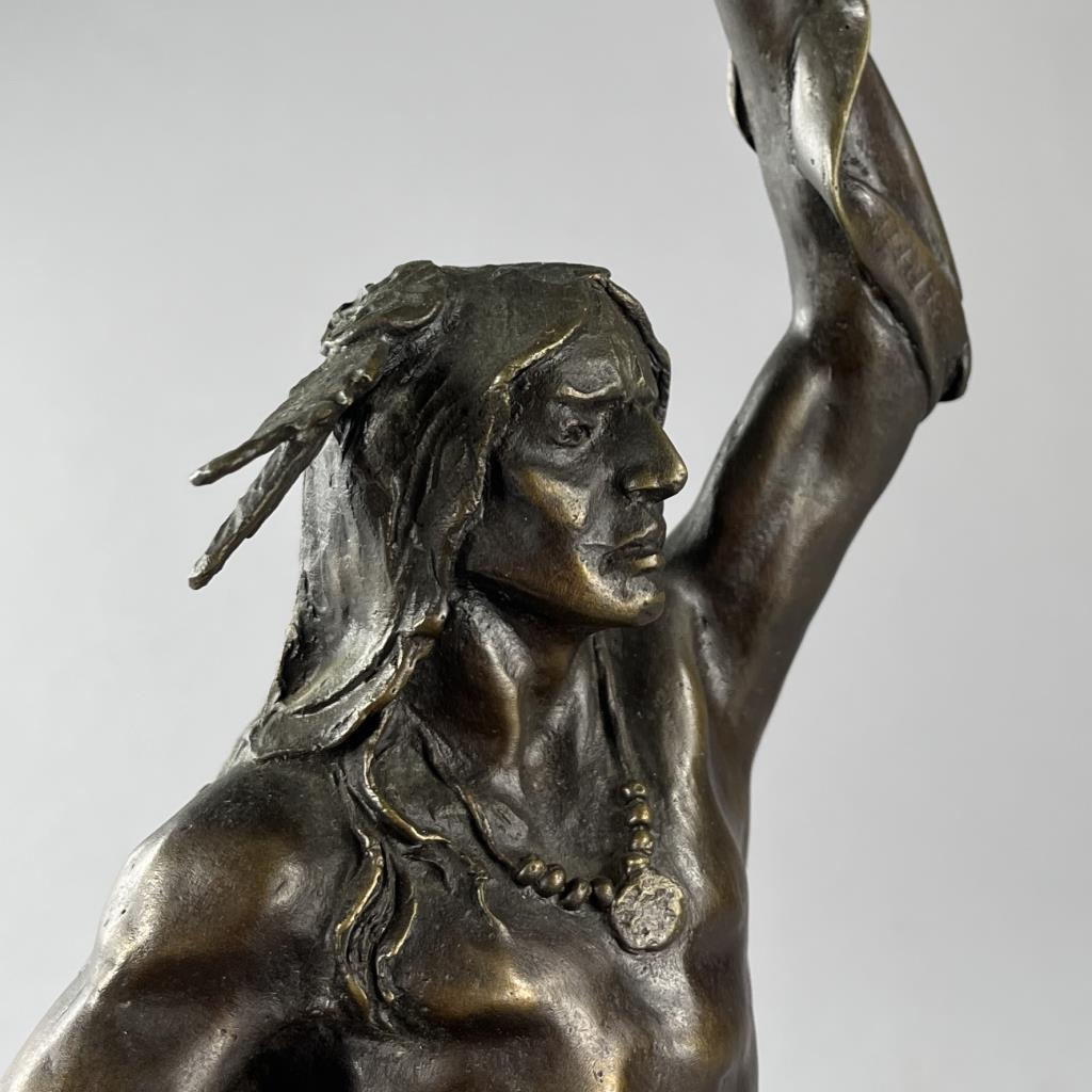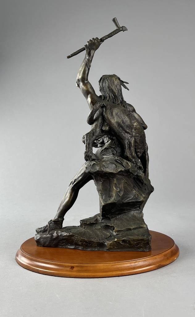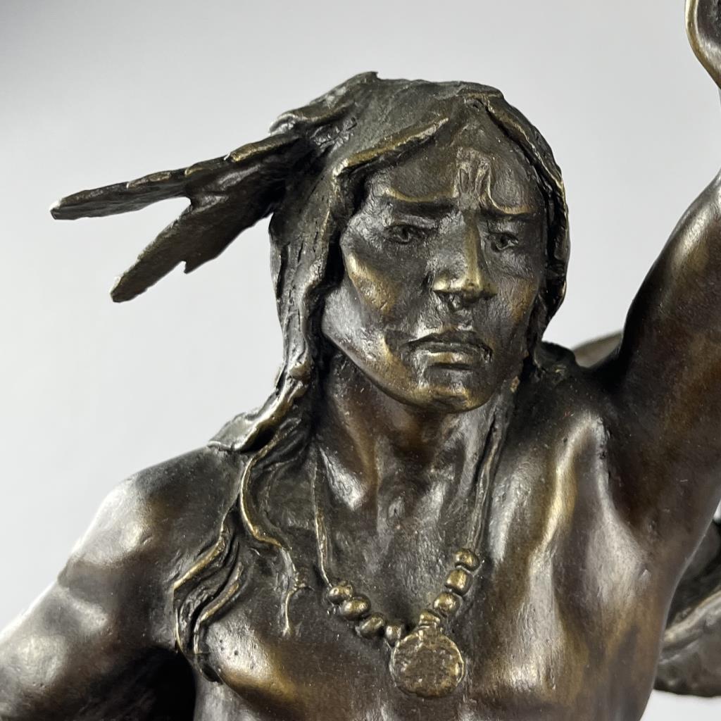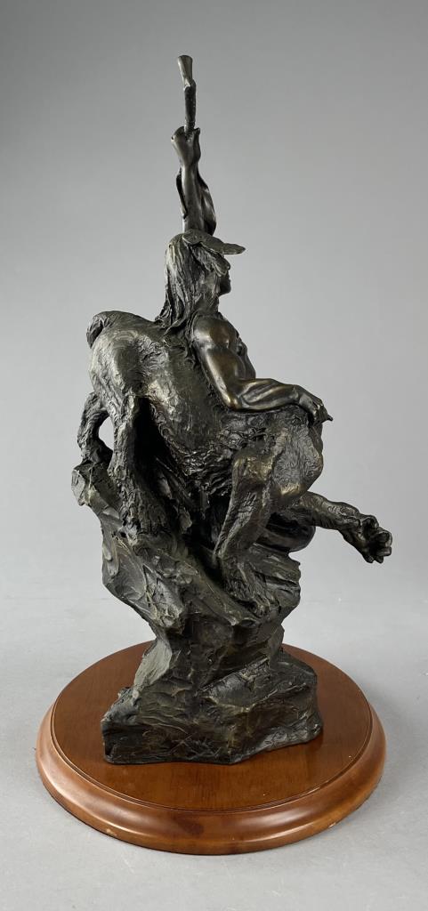 Buck McCain (American, b. 1943), bronze statue, titled “Spirit of War, Spirit of Peace”, depicting a Native American warrior alongside a mountain lion, marked at base on bronze “McCAIN © TFM,” on a detachable wood base, approximately 17-1/4″ (H) (including base). CONDITION: Local pick-up or third party shipping only for this lot. Please see the Shipping Policy for information on suggested shippers. We recommend the Pak Mail Store of Battle Creek to assist you. Please contact the shipper of your choice for shipping estimates on this lot. Refer to the Shipping section in our full Terms and Conditions for all information on shipping. SHIPPING: In-House Shipping Available. Please read our Shipping Policies and Terms and Conditions