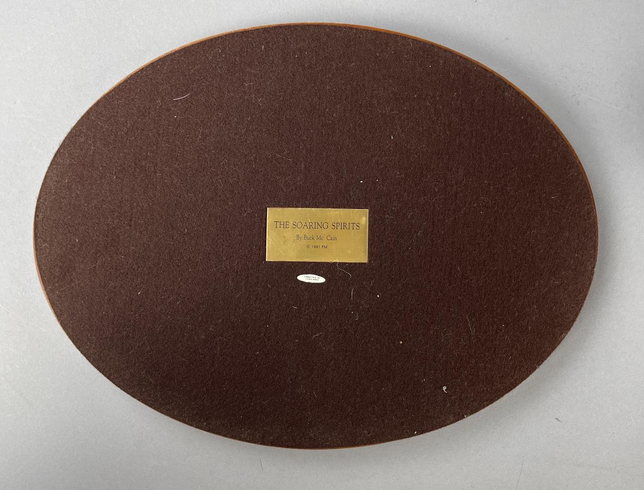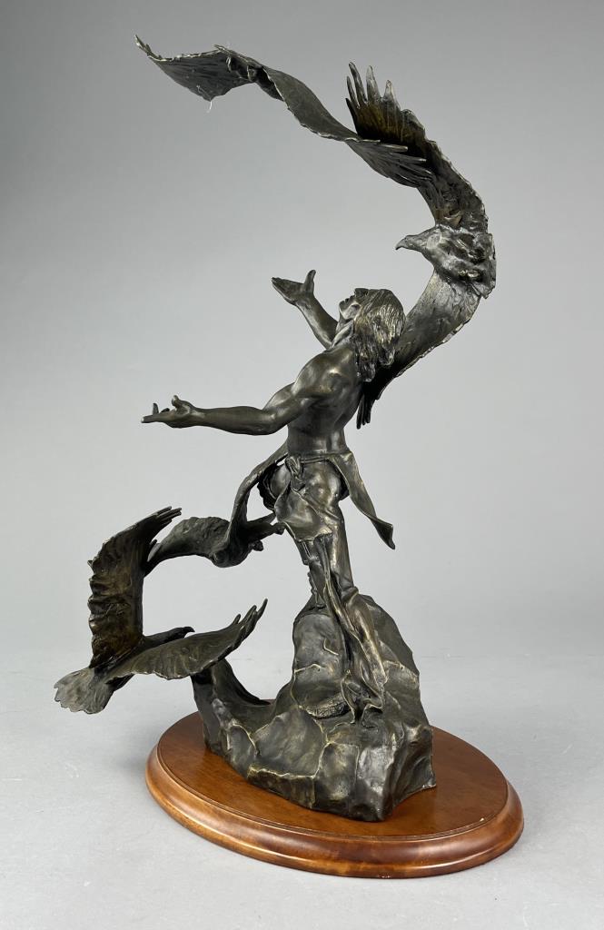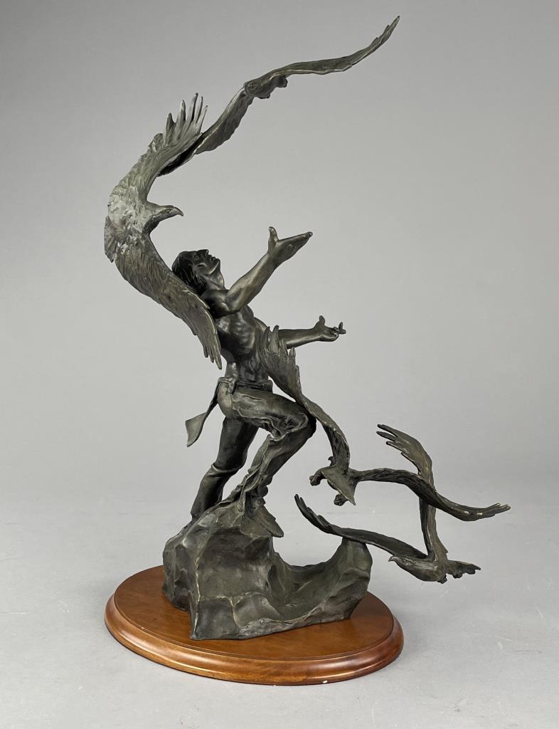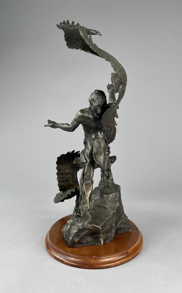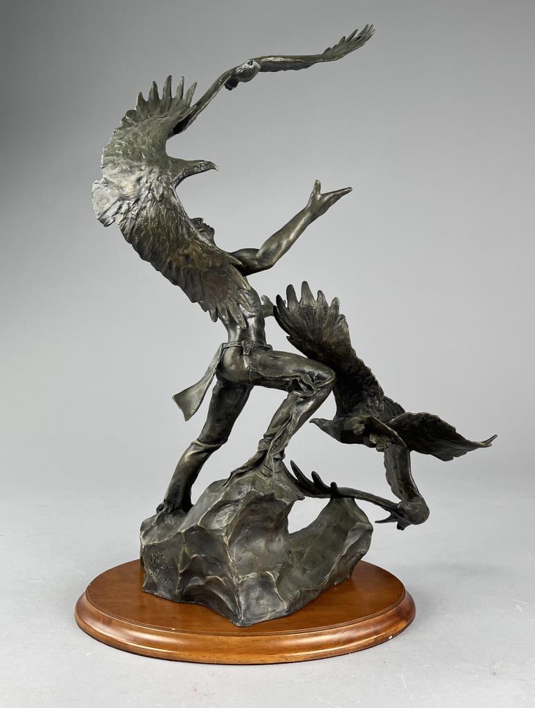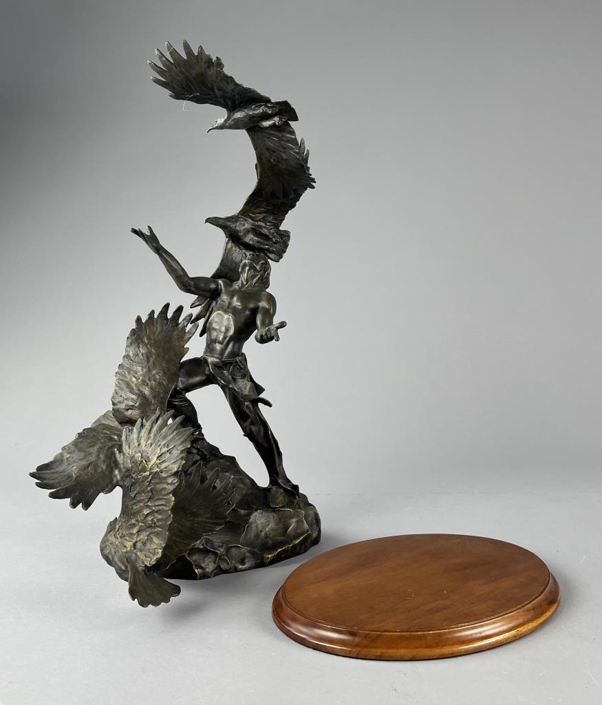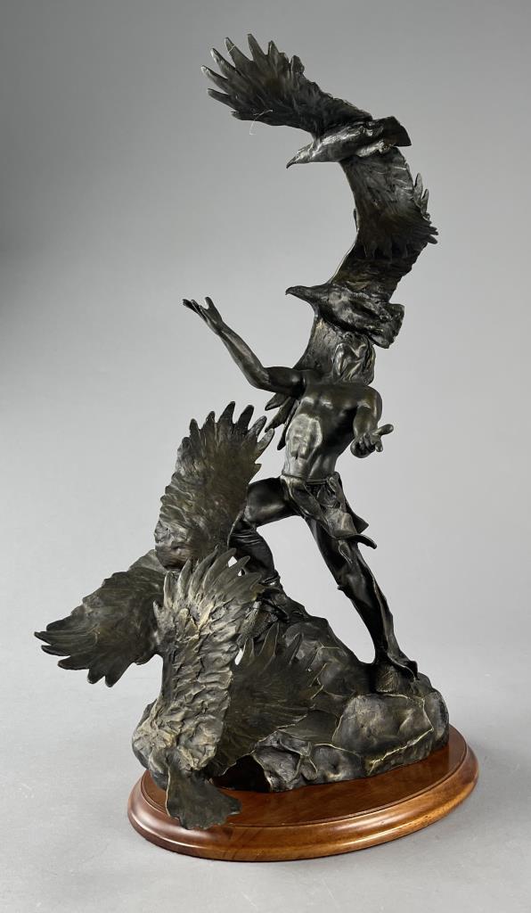 Buck McCain (American, b. 1943), bronze statue, titled “The Soaring Spirits,” depicting a Native American figure with scared eagles, marked at base on bronze “McCAIN © FM 91,” on a detachable wood base, approximately 21-1/2″ (H) (including base). CONDITION: SHIPPING: Local pick-up or third party shipping only for this lot. Please see the Shipping Policy for information on suggested shippers. We recommend the Pak Mail Store of Battle Creek to assist you. Please contact the shipper of your choice for shipping estimates on this lot. Refer to the Shipping section in our full Terms and Conditions for all information on shipping.