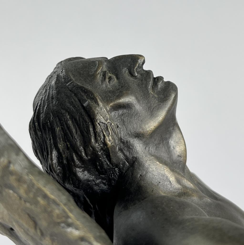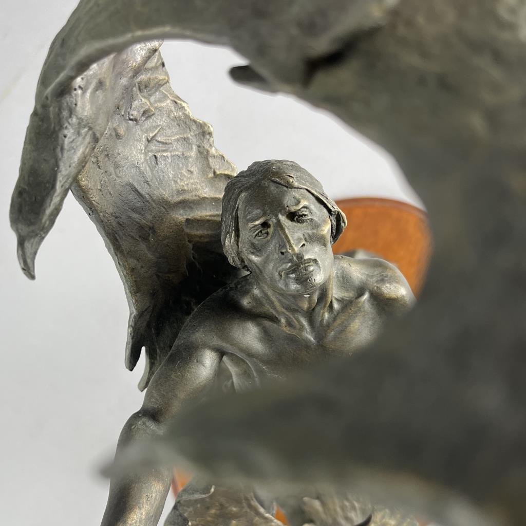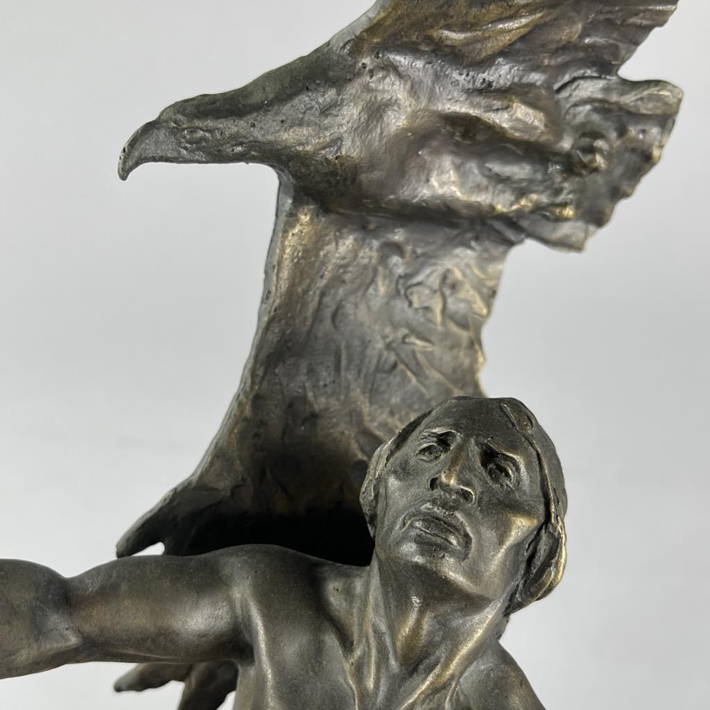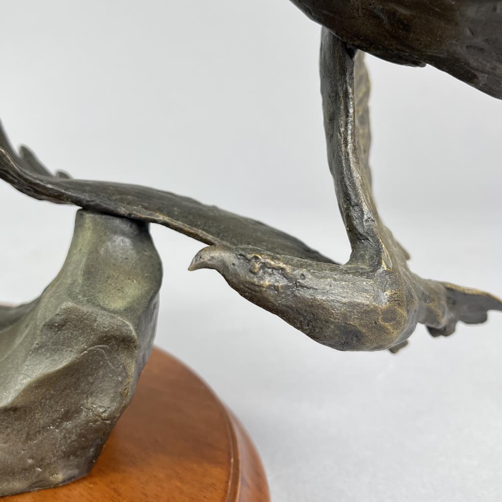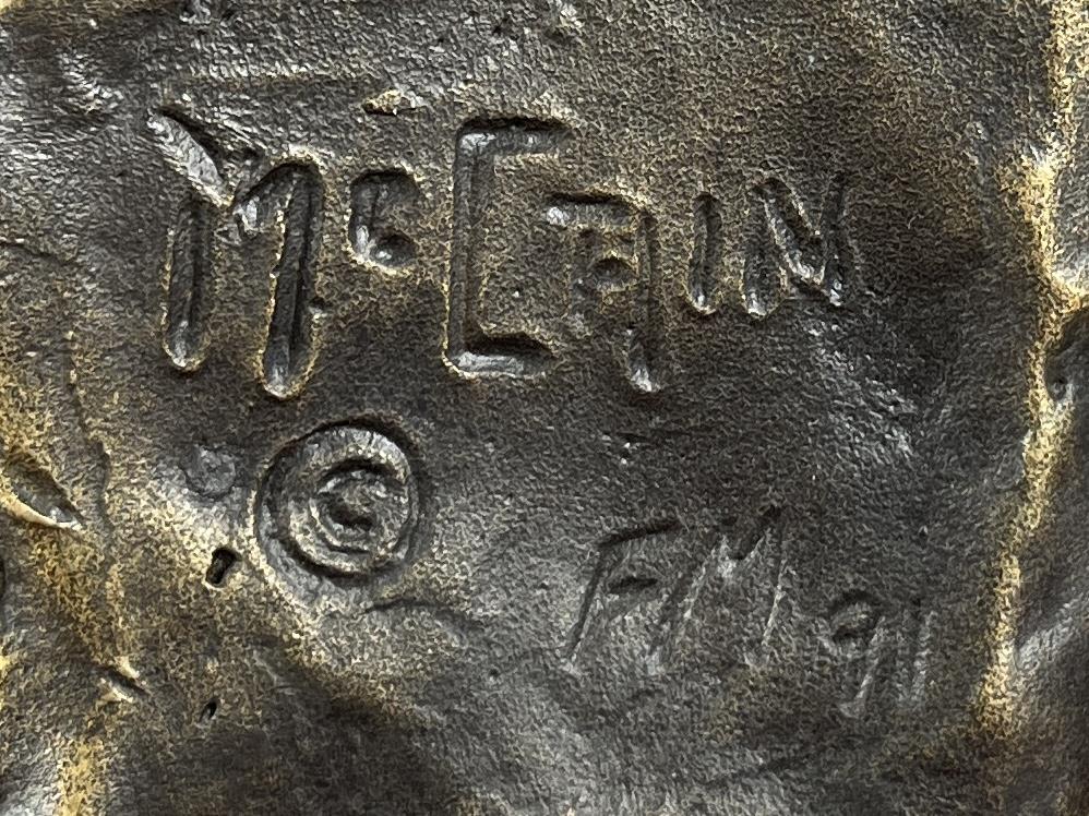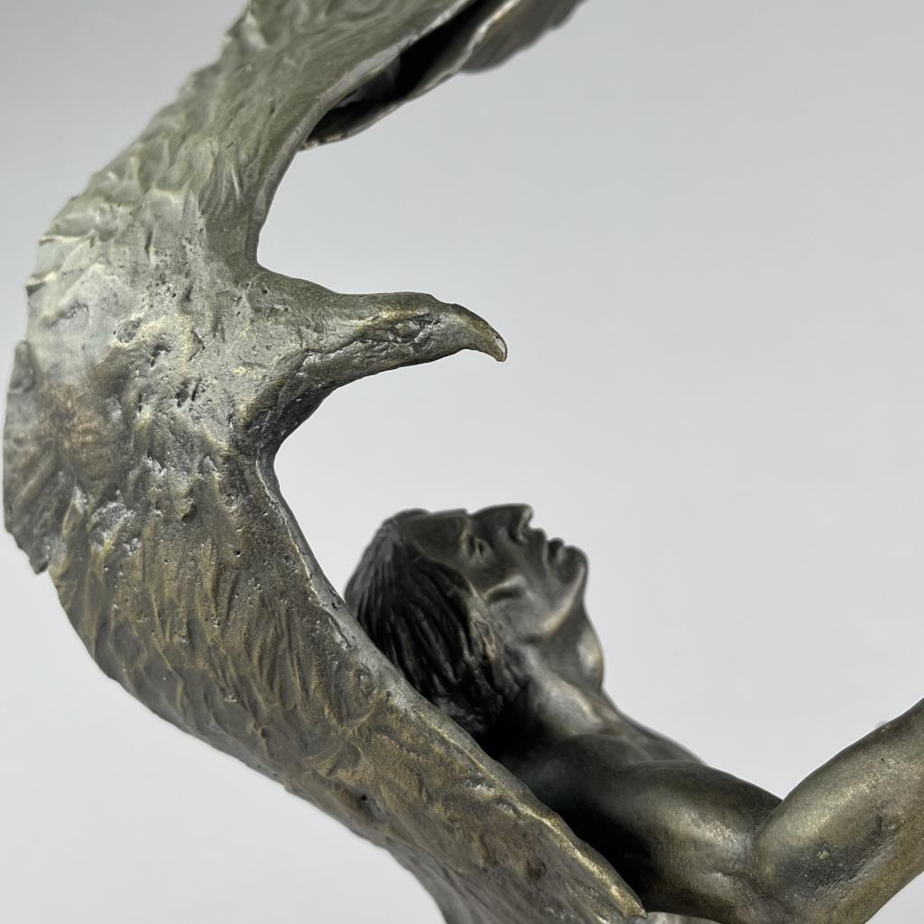 Buck McCain (American, b. 1943), bronze statue, titled “The Soaring Spirits,” depicting a Native American figure with scared eagles, marked at base on bronze “McCAIN © FM 91,” on a detachable wood base, approximately 21-1/2″ (H) (including base). CONDITION: SHIPPING: Local pick-up or third party shipping only for this lot. Please see the Shipping Policy for information on suggested shippers. We recommend the Pak Mail Store of Battle Creek to assist you. Please contact the shipper of your choice for shipping estimates on this lot. Refer to the Shipping section in our full Terms and Conditions for all information on shipping.