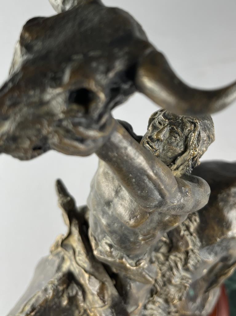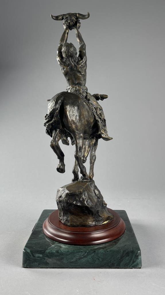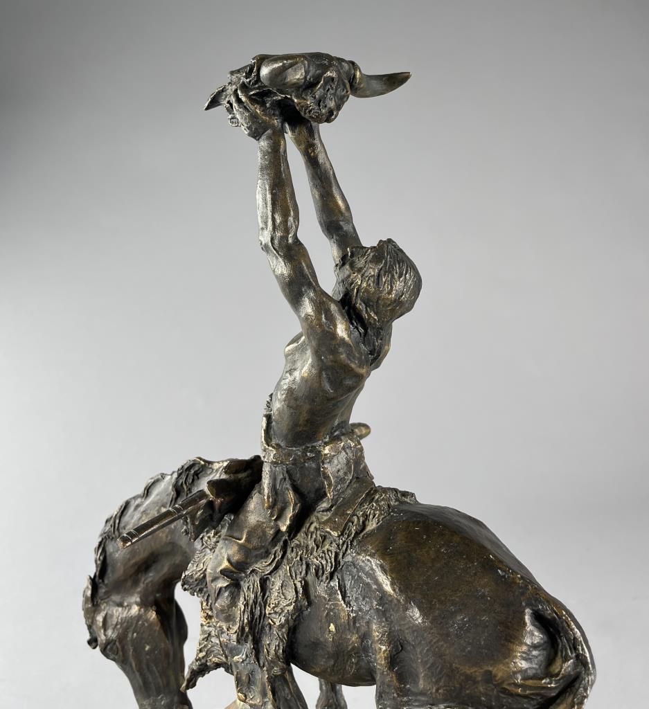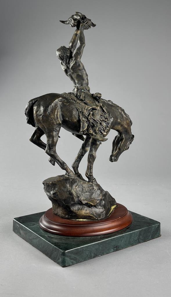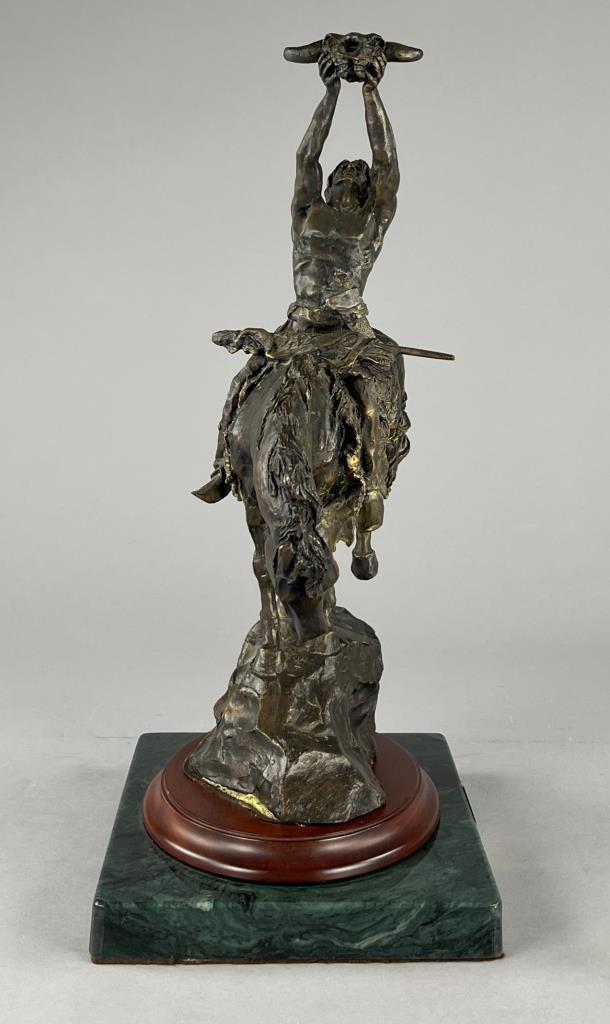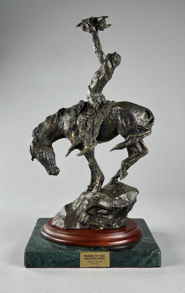 Buck McCain (American, b. 1943), bronze statue, titled “Prayer to the Healing Spirit,” depicting a Native American figure on horseback holding a buffalo skull towards the sky, marked on the backside of the bronze at the base “McCAIN © 88 FM,” on a double attached base, approximately 18-7/8″ (H) (including base). CONDITION: Some areas of visible adhesive at the backside of the base of the bronze where it was attached to the wood base. SHIPPING: Local pick-up or third party shipping only for this lot. Please see the Shipping Policy for information on suggested shippers. We recommend the Pak Mail Store of Battle Creek to assist you. Please contact the shipper of your choice for shipping estimates on this lot. Refer to the Shipping section in our full Terms and Conditions for all information on shipping.