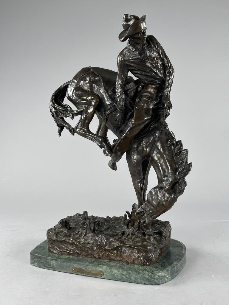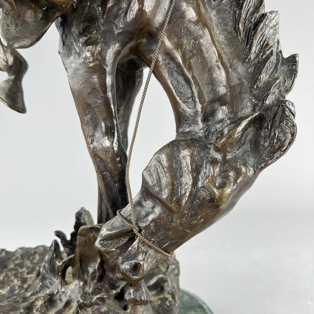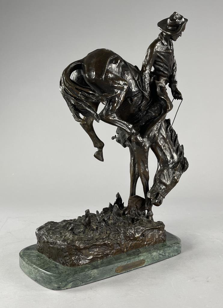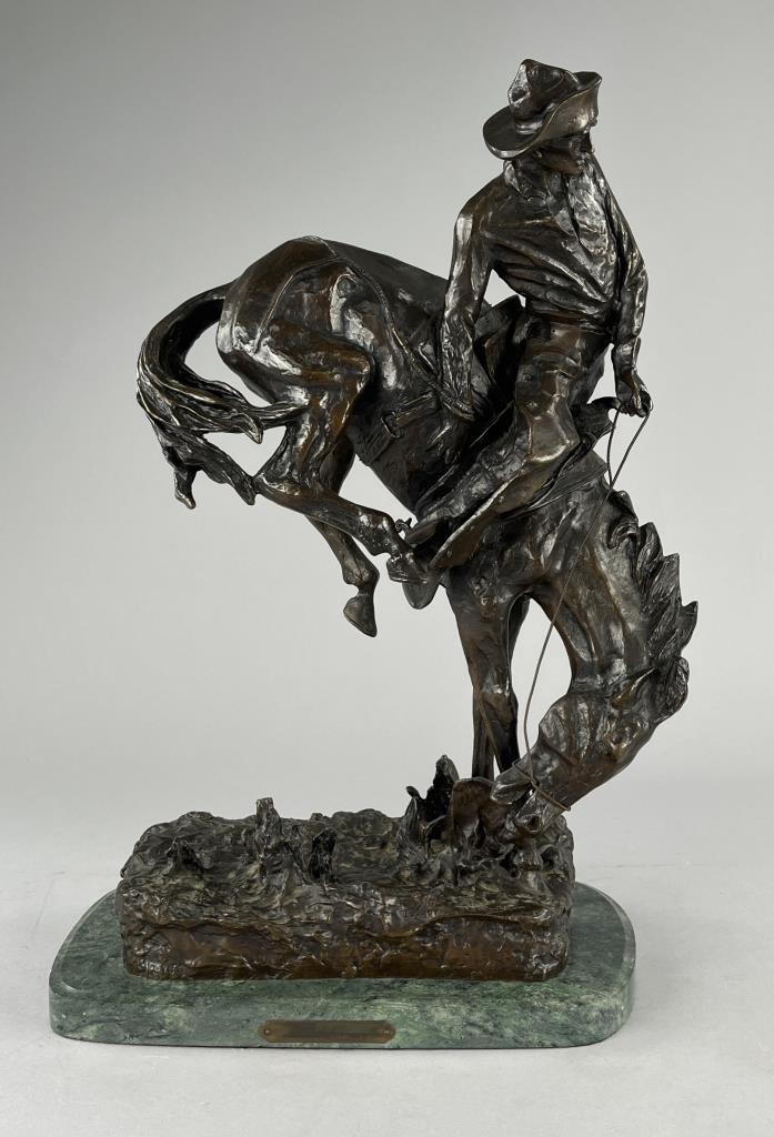 After Frederic Sackrider Remington (American, 1861-1909), bronze statue, titled “Outlaw,” portrays a cowboy in action breaking a wild, bucking horse, signed on backside, “Copyright Frederic Remington,” late 20th Century restrike of Remington’s first Western sculpture and one of his most famous, on an attached marble base, approximately 21-3/16″ (H) (including base). CONDITION: Local pick-up or third party shipping only for this lot. Please see the Shipping Policy for information on suggested shippers. We recommend the Pak Mail Store of Battle Creek to assist you. Please contact the shipper of your choice for shipping estimates on this lot. Refer to the Shipping section in our full Terms and Conditions for all information on shipping. SHIPPING: In-House Shipping Available. Please read our Shipping Policies and Terms and Conditions