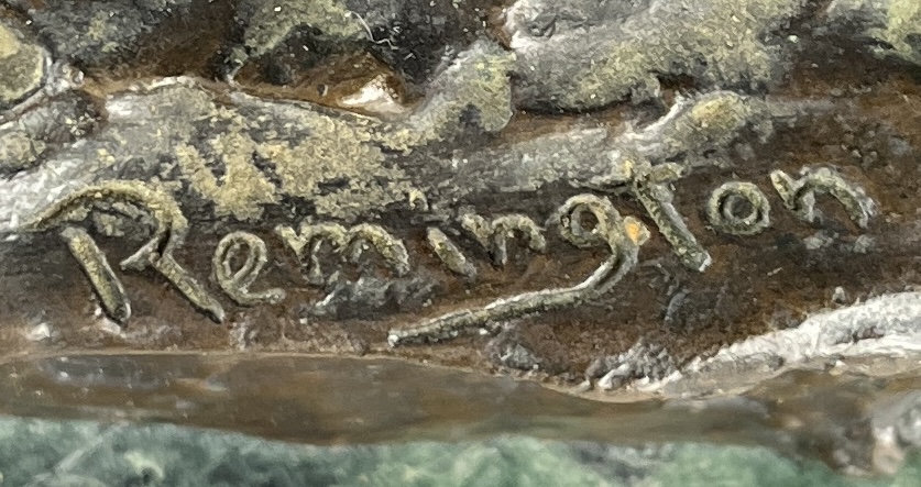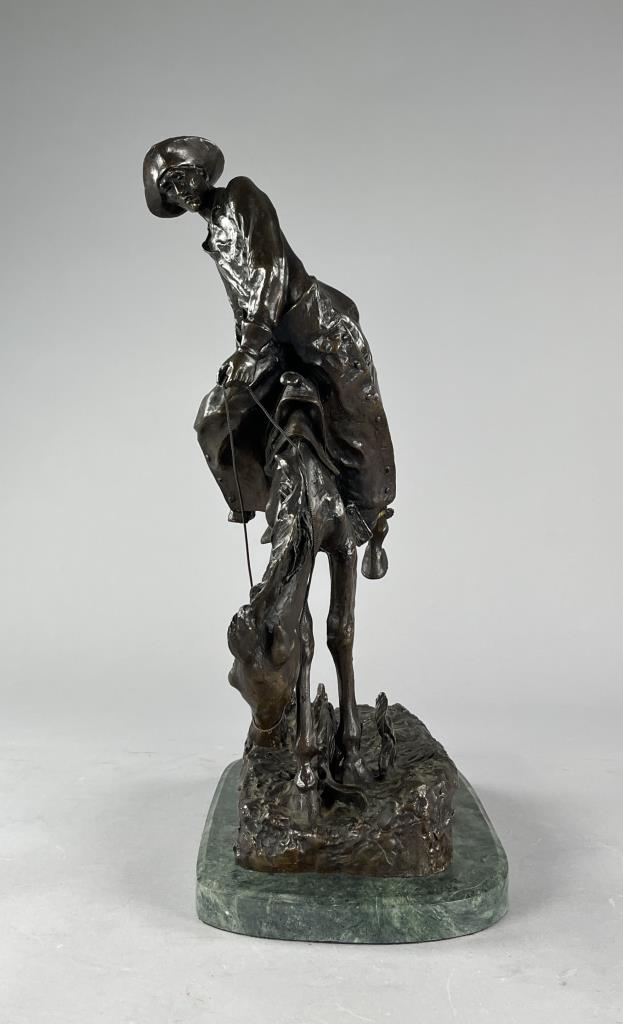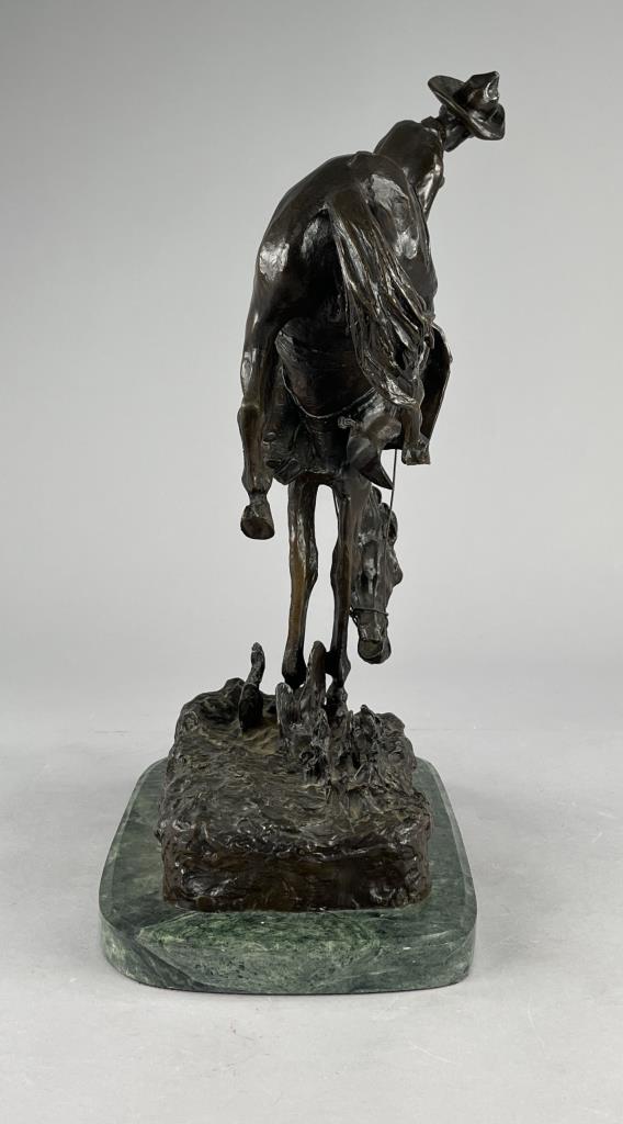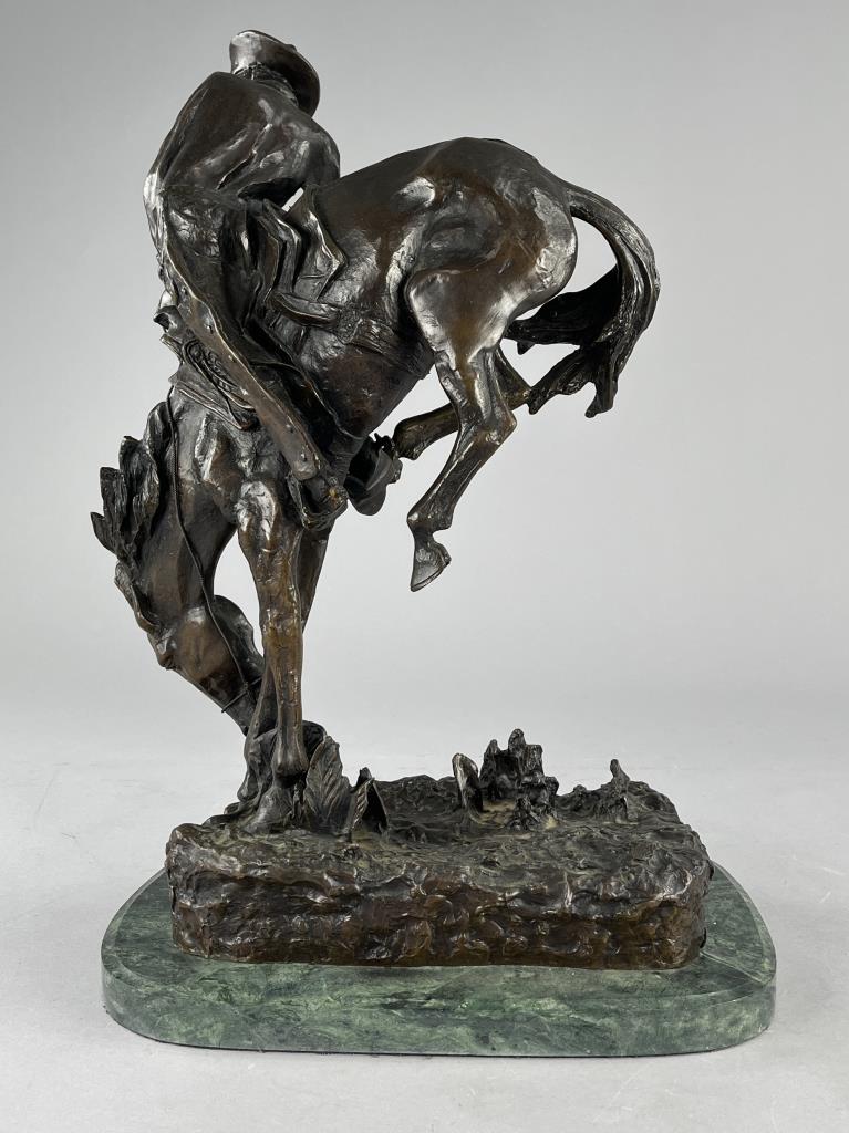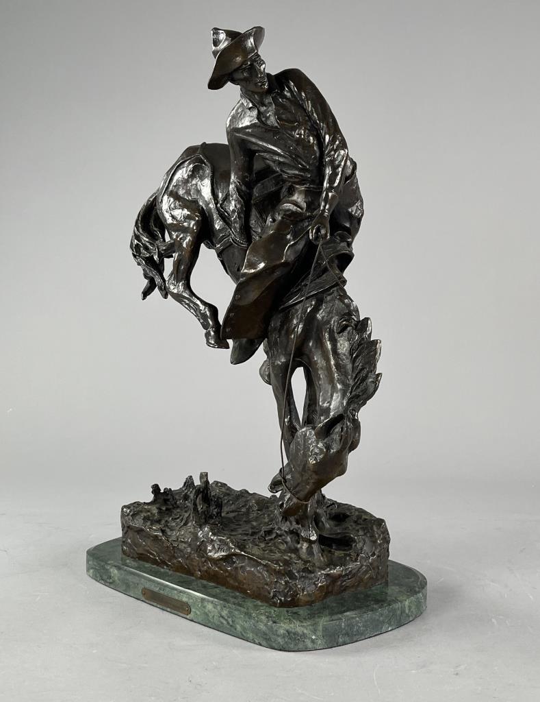 After Frederic Sackrider Remington (American, 1861-1909), bronze statue, titled “Outlaw,” portrays a cowboy in action breaking a wild, bucking horse, signed on backside, “Copyright Frederic Remington,” late 20th Century restrike of Remington’s first Western sculpture and one of his most famous, on an attached marble base, approximately 21-3/16″ (H) (including base). CONDITION: Local pick-up or third party shipping only for this lot. Please see the Shipping Policy for information on suggested shippers. We recommend the Pak Mail Store of Battle Creek to assist you. Please contact the shipper of your choice for shipping estimates on this lot. Refer to the Shipping section in our full Terms and Conditions for all information on shipping. SHIPPING: In-House Shipping Available. Please read our Shipping Policies and Terms and Conditions