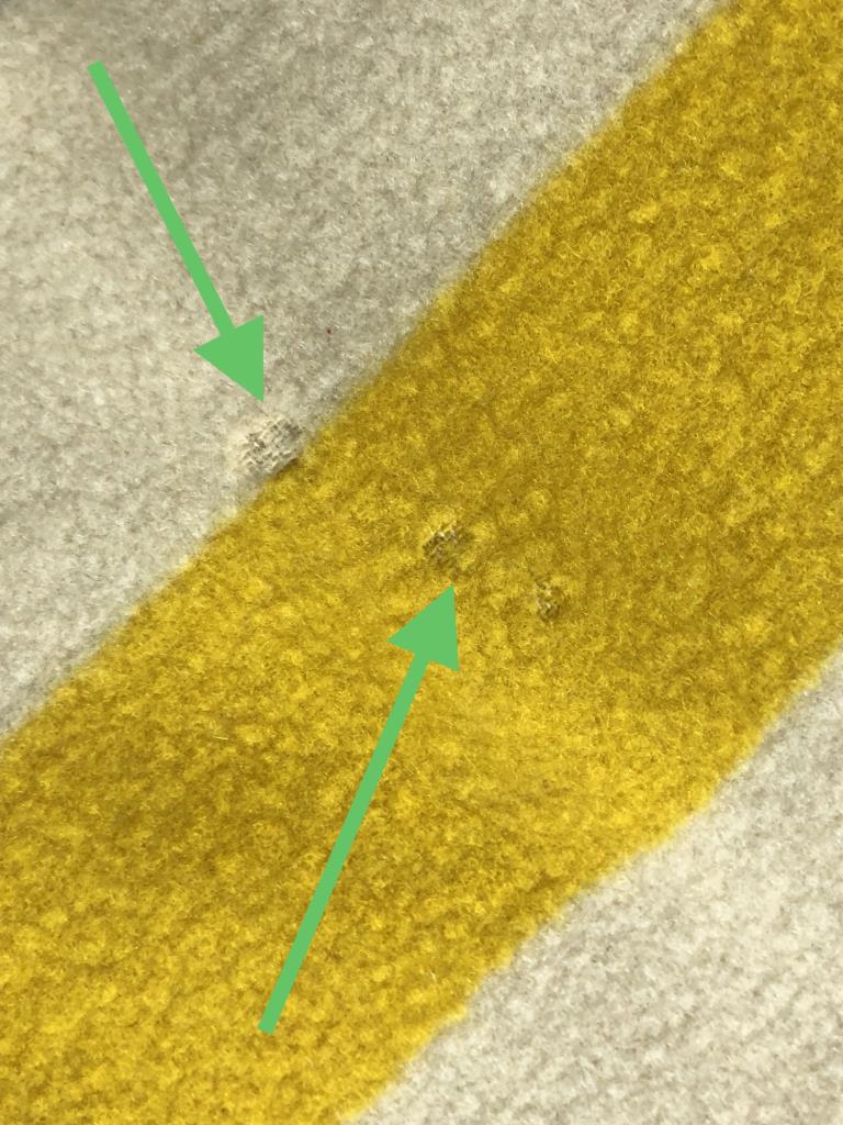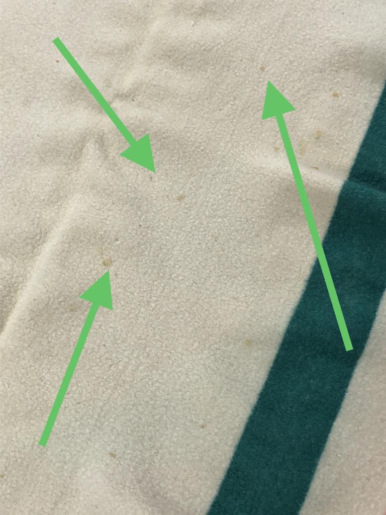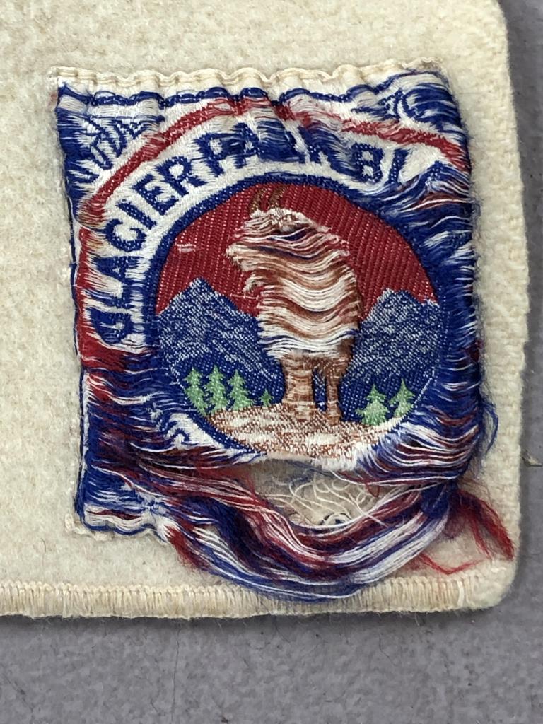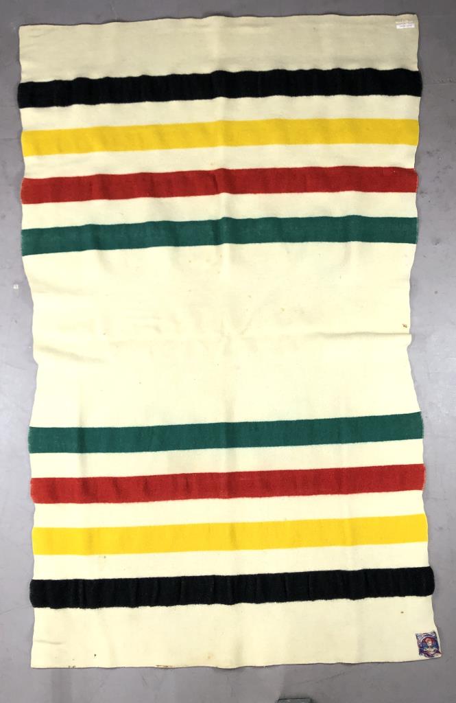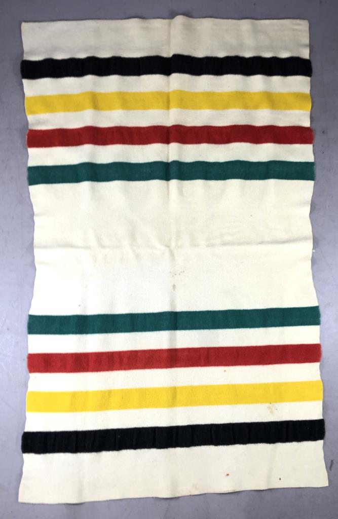 Pendleton (Portland, Oregon), Glacier Stripe National Park Blanket. These were first introduced in 1916, when the Great Northern Railway president, James J. Hill, commissioned Pendleton to create the now iconic blanket for Glacier National Park’s lodge. This example most likely dates from the early to mid 20th Century, partial label lower right corner, and measures approximately 73″ x 47″. CONDITION: Staining, burns, holes, and insect damage, please see photos. SHIPPING: In-House Shipping Available. Please read our Shipping Policies and Terms and Conditions