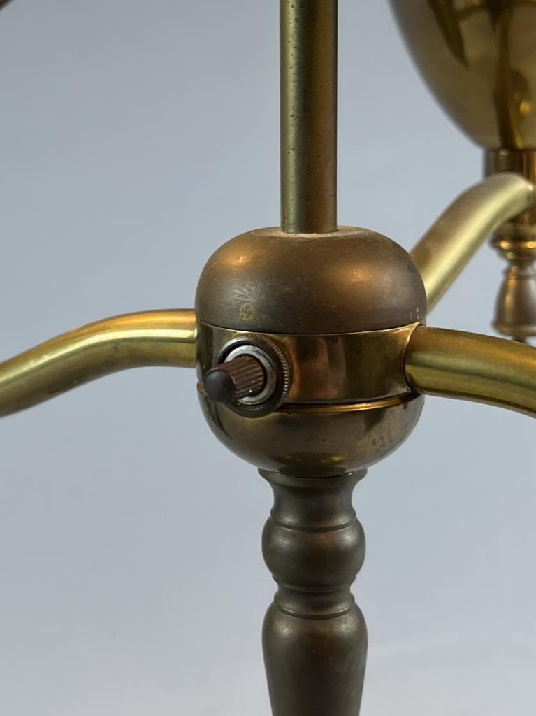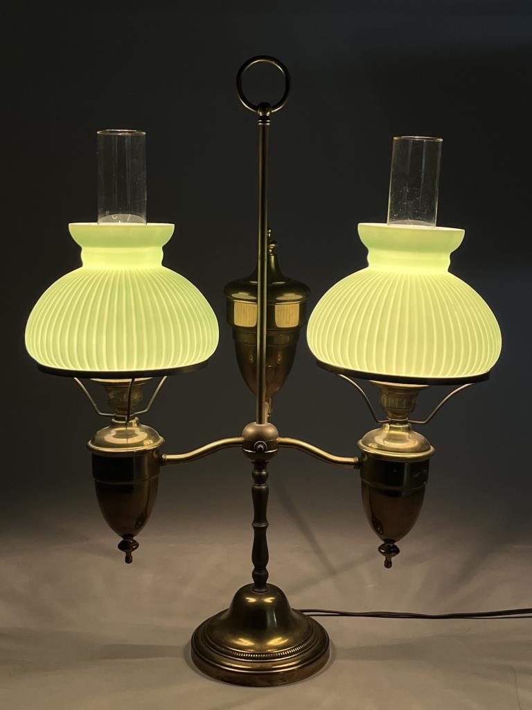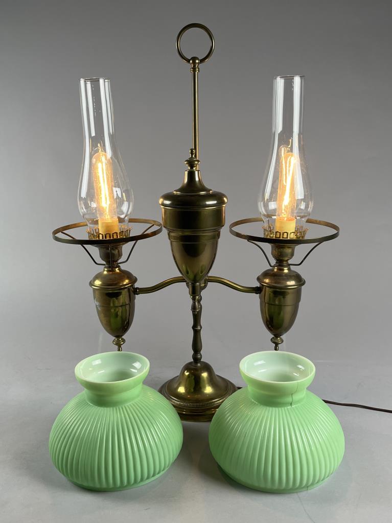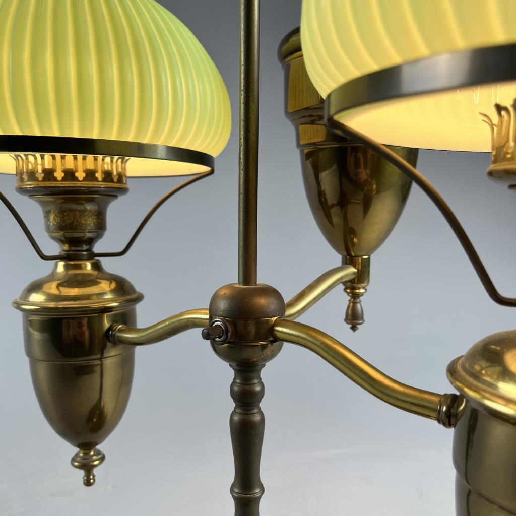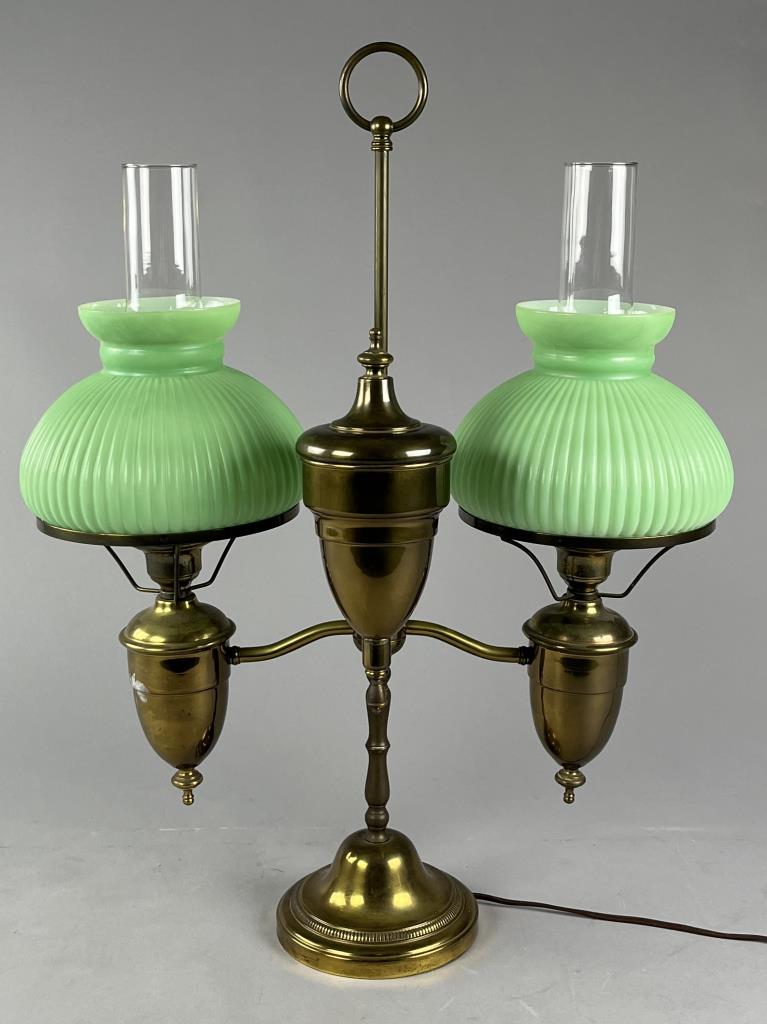 Double student style electric brass desk lamp, with ribbed green case glass shades, 25-2/2″ (H). CONDITION: SHIPPING: Local pick-up or third party shipping only for this lot. Please see the Shipping Policy for information on suggested shippers. We recommend the Pak Mail Store of Battle Creek to assist you. Please contact the shipper of your choice for shipping estimates on this lot. Refer to the Shipping section in our full Terms and Conditions for all information on shipping.