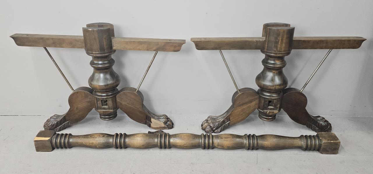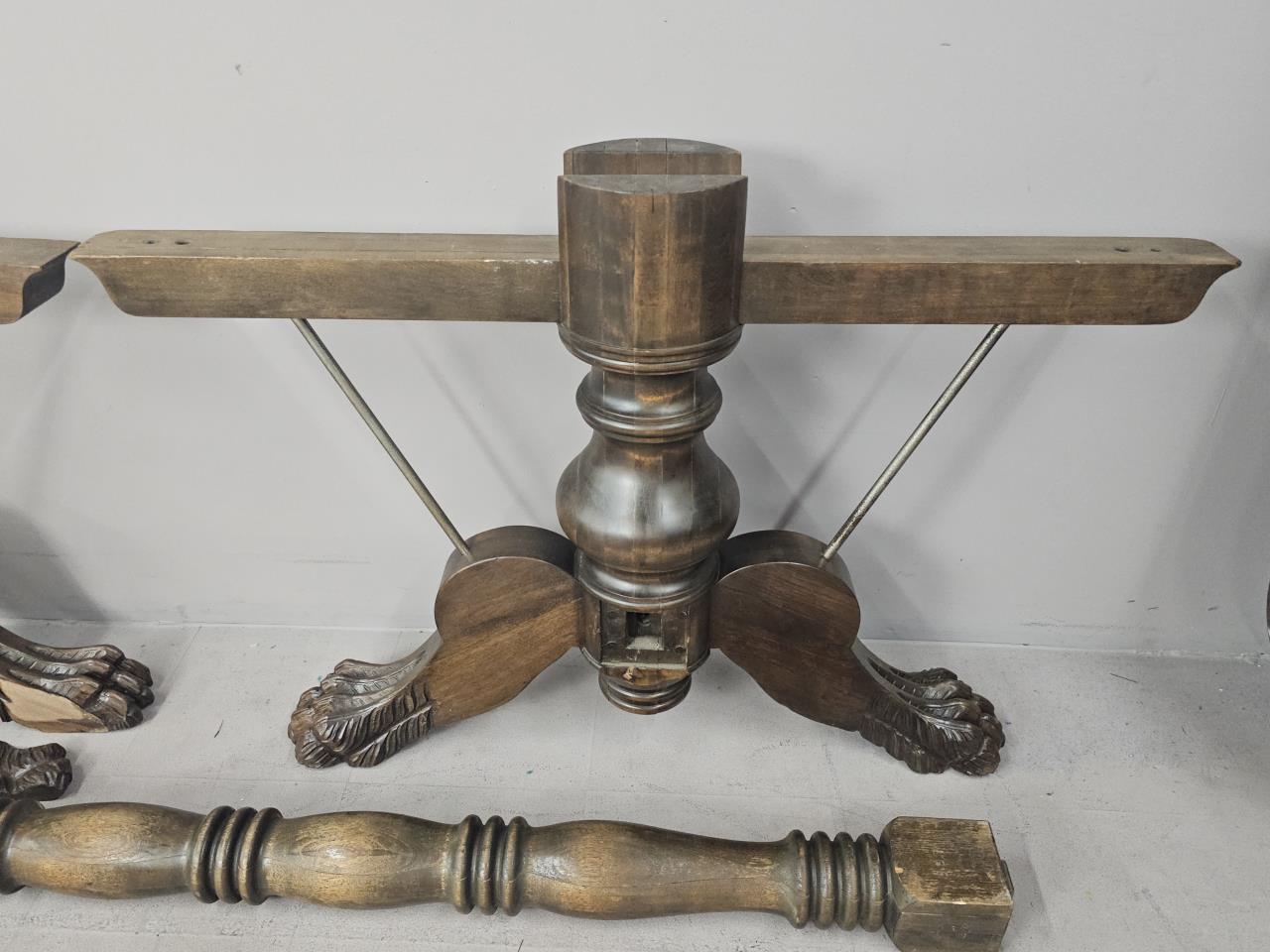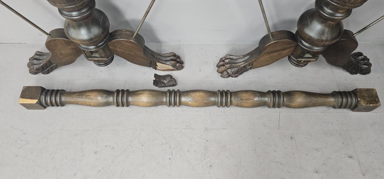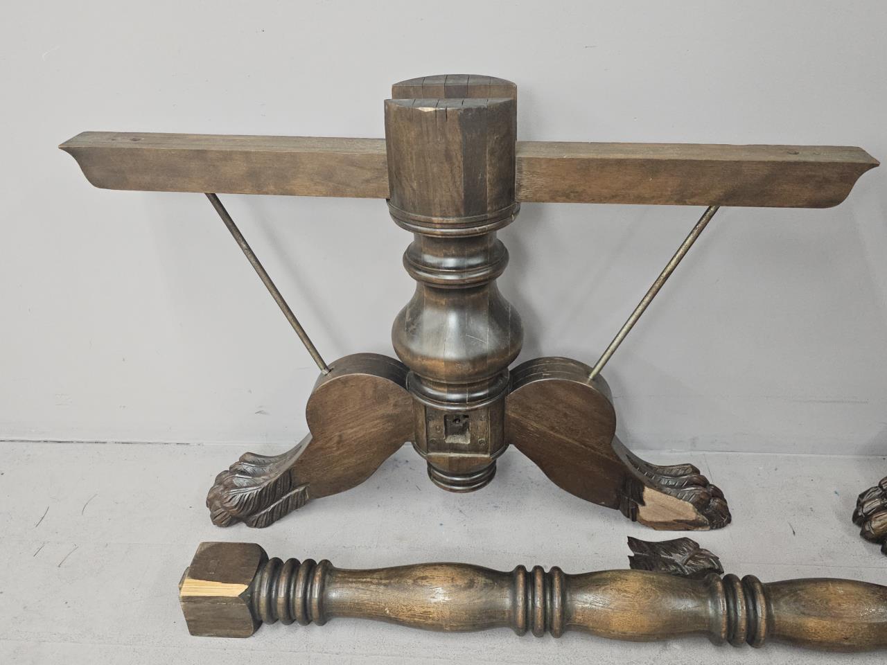 Antique roulette or faro table legs with matching cross piece. Legs and cross piece are marked number 997. CONDITION: Wear appropriate to age and use. The wood is scuffed and worn as shown. One foot piece needs to be reattached. SHIPPING: In-House Shipping Available. Please read our Shipping Policies and Terms and Conditions