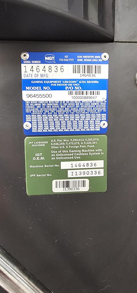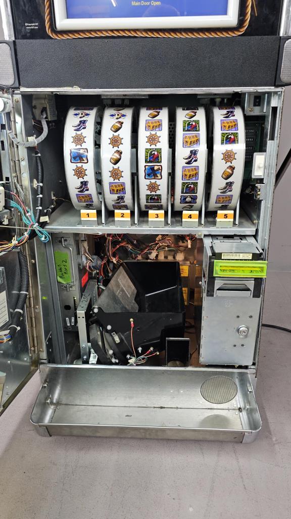 IGT S2000 “Buck$ Ahoy” 5-reel slot machine features the classic curved Vision top box with LCD bonus display. The pirate-themed graphics are vibrant and feature cartoon-styled artwork with game elements such as the “Pirate’s Table” and “Treasure Beach” bonus features. This model accepts bills and is equipped with the iconic side-mounted pull arm for manual play. It operates on 120/230V power at 6/3A and 50/60Hz frequency. According to the manufacturer’s tag, this machine was built in May 2005 and carries serial number 1464836 (Model No. 96455500). The machine comes with keys and includes two essential service chips: a CLEAR #97 chip and a KEY #17 chip, often used for resetting and configuration. Machine is in working condition at the time of listing. Requires a USB style keyboard to complete the startup cycle(not included). Includes keys.