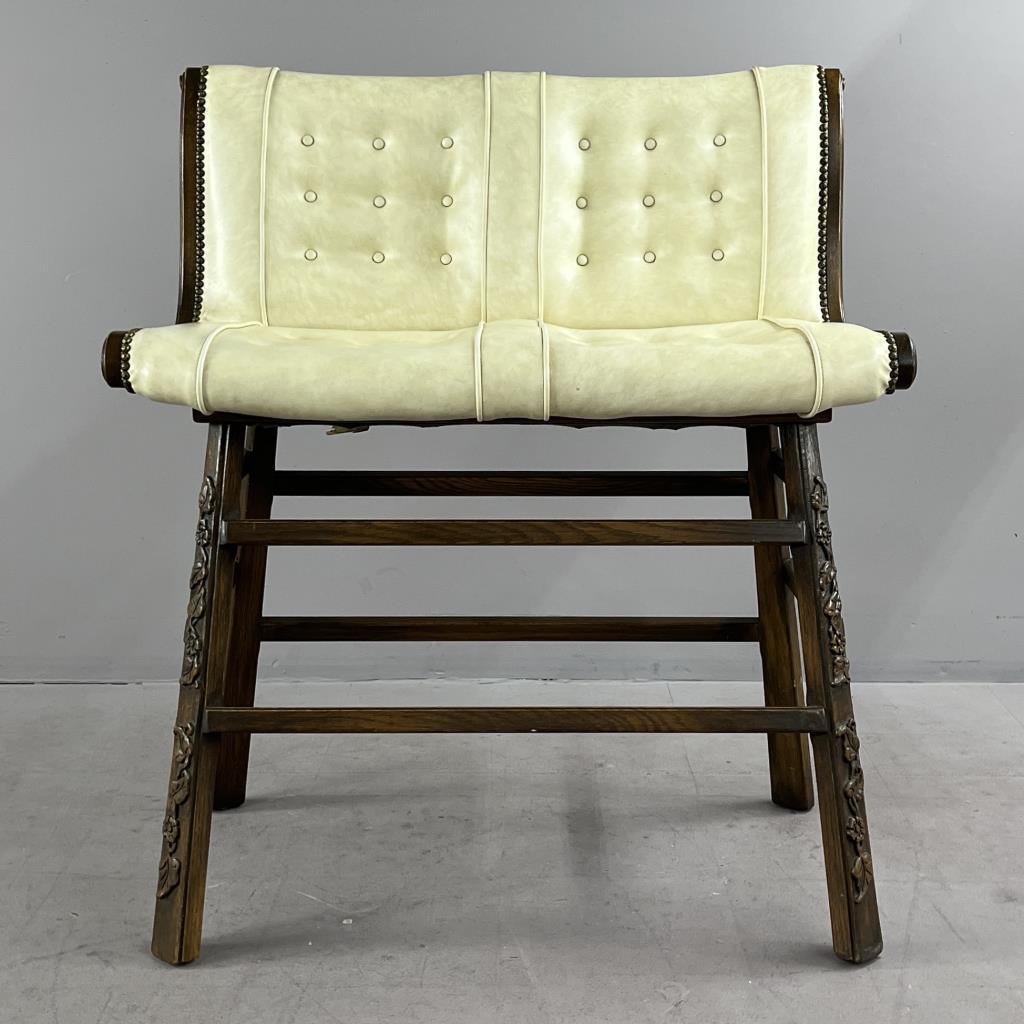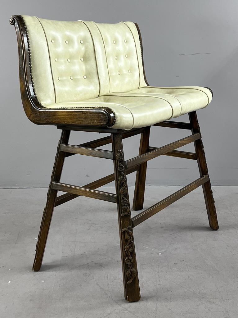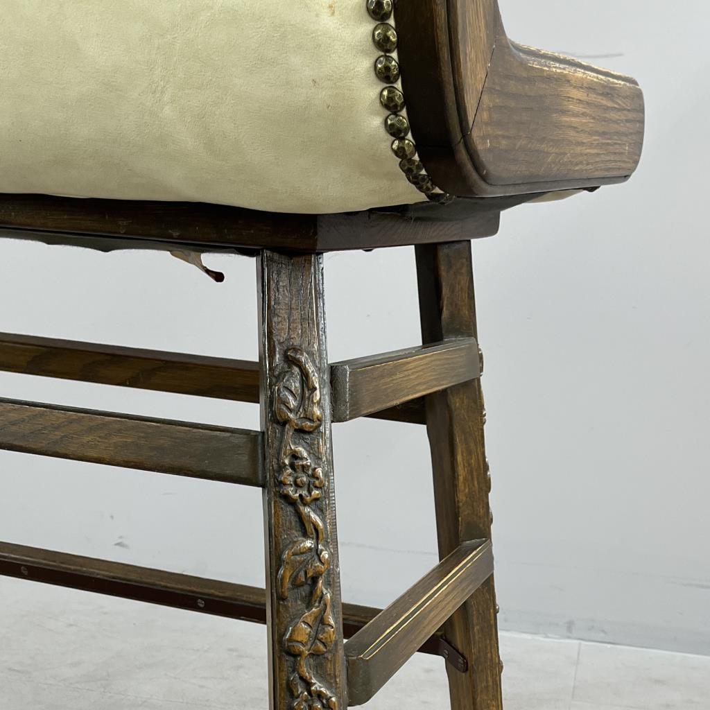 Romweber (Batesville, Indiana), double bar stool, from the “Viking Oak Collection” (introduced in 1935 and discontinued in 1987), carved oak and tufted white vinyl upholstery, paper label on underside dated 1971, approximately 38-7/16″ (W) x 21-3/4″ (D) 43-3/4″ (H) x 30-1/4″ (seat H). CONDITION: Scuff and tear to upholstery on back. SHIPPING: Local pick-up or third party shipping only for this lot. Please see the Shipping Policy for information on suggested shippers. We recommend the Pak Mail Store of Battle Creek to assist you. Please contact the shipper of your choice for shipping estimates on this lot. Refer to the Shipping section in our full Terms and Conditions for all information on shipping.