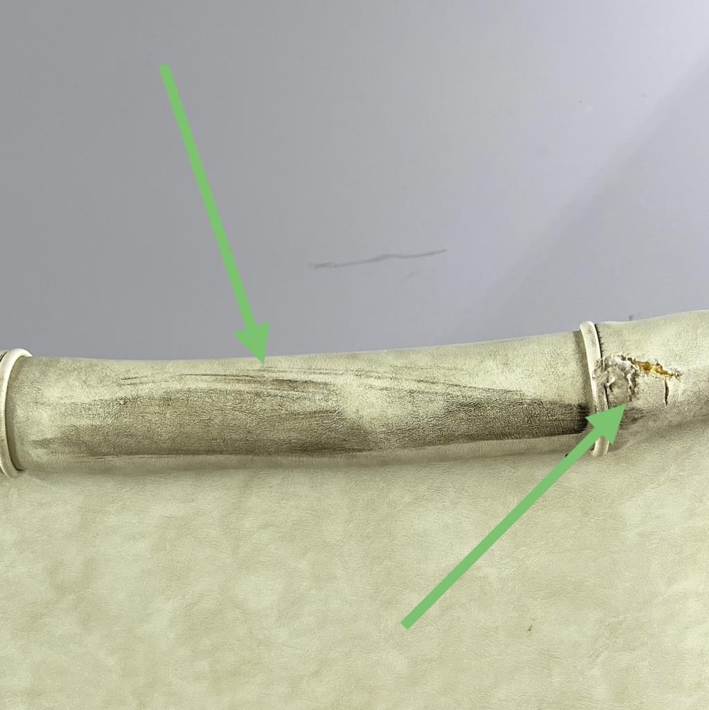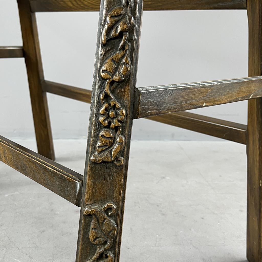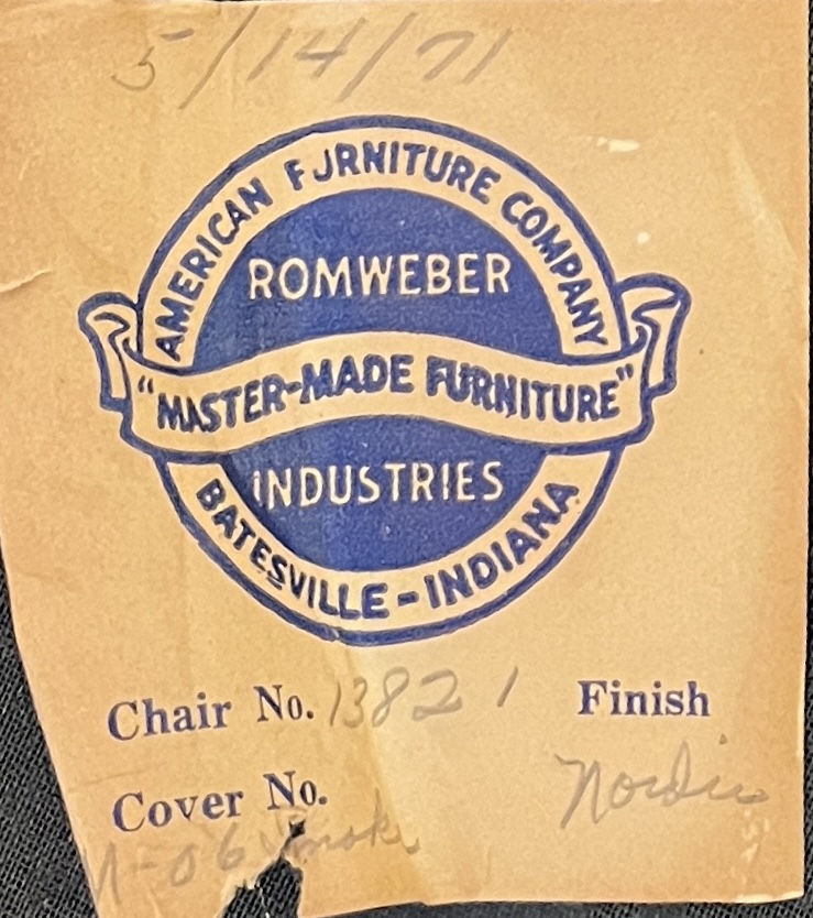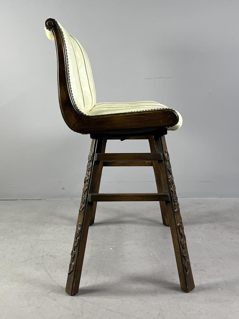 Romweber (Batesville, Indiana), double bar stool, from the “Viking Oak Collection” (introduced in 1935 and discontinued in 1987), carved oak and tufted white vinyl upholstery, paper label on underside dated 1971, approximately 38-7/16″ (W) x 21-3/4″ (D) 43-3/4″ (H) x 30-1/4″ (seat H). CONDITION: Scuff and tear to upholstery on back. SHIPPING: Local pick-up or third party shipping only for this lot. Please see the Shipping Policy for information on suggested shippers. We recommend the Pak Mail Store of Battle Creek to assist you. Please contact the shipper of your choice for shipping estimates on this lot. Refer to the Shipping section in our full Terms and Conditions for all information on shipping.