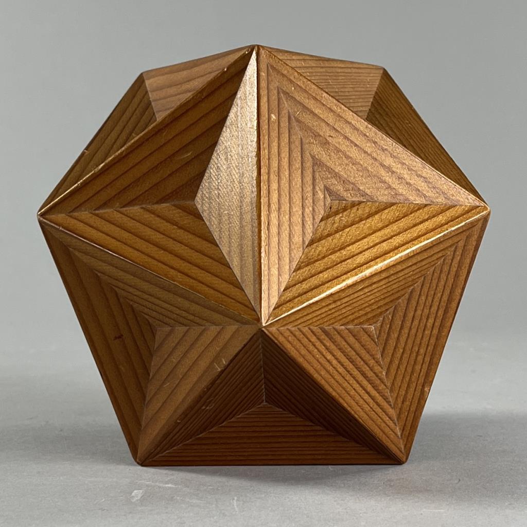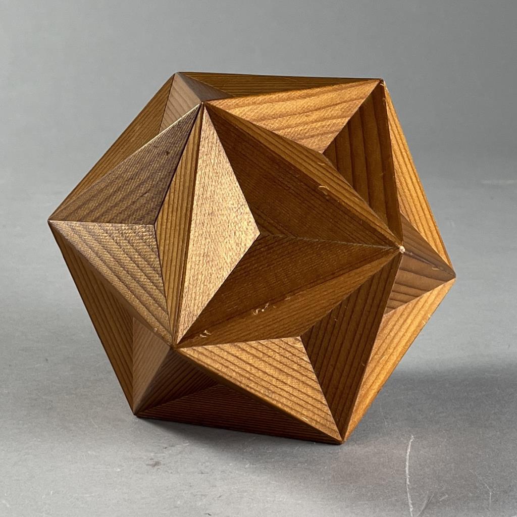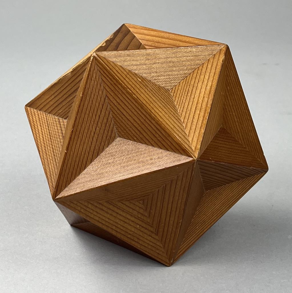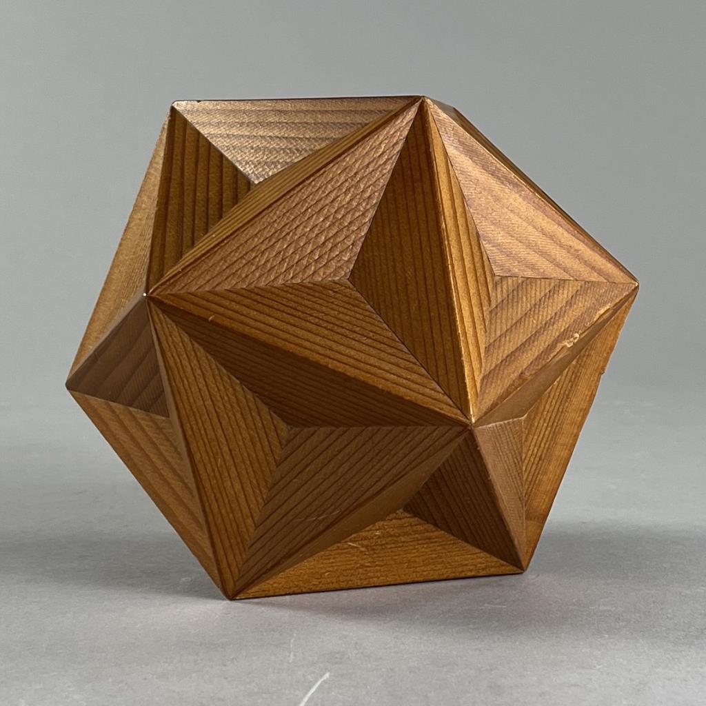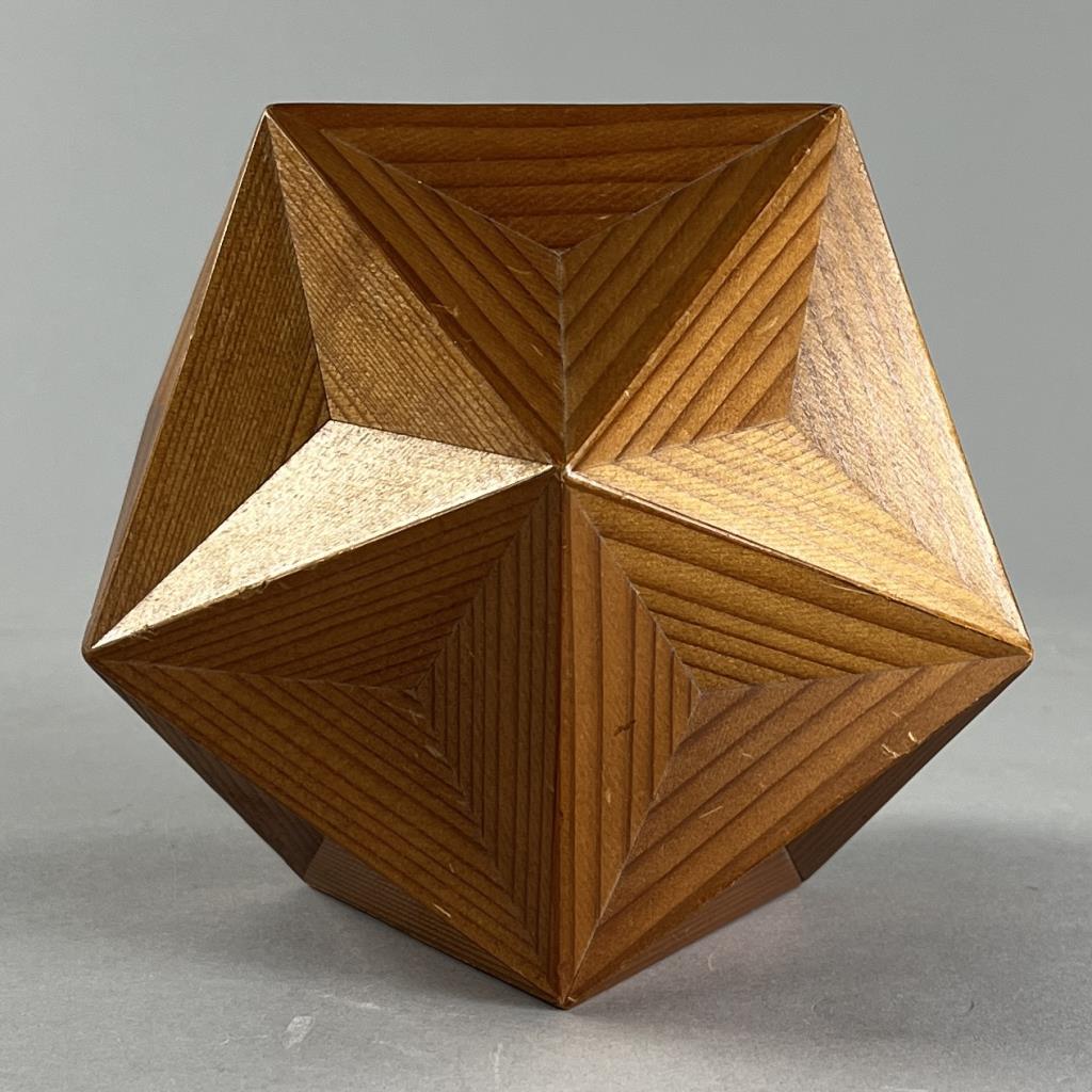 Handcrafted icosahedron, comprised of 20 faces each of which is an equilateral triangle, 12 vertices, and 30 edges, redwood, circa mid 20th Century, 5-1/2″. CONDITION: SHIPPING: In-House Shipping Available. Please read our Shipping Policies and Terms and Conditions