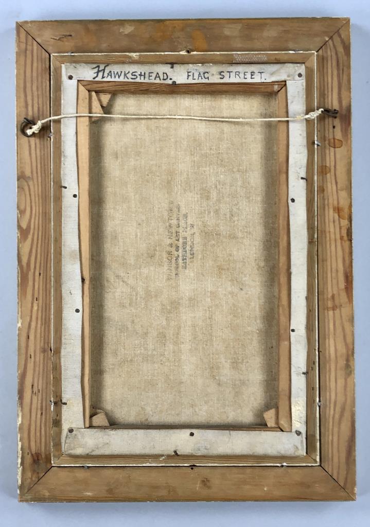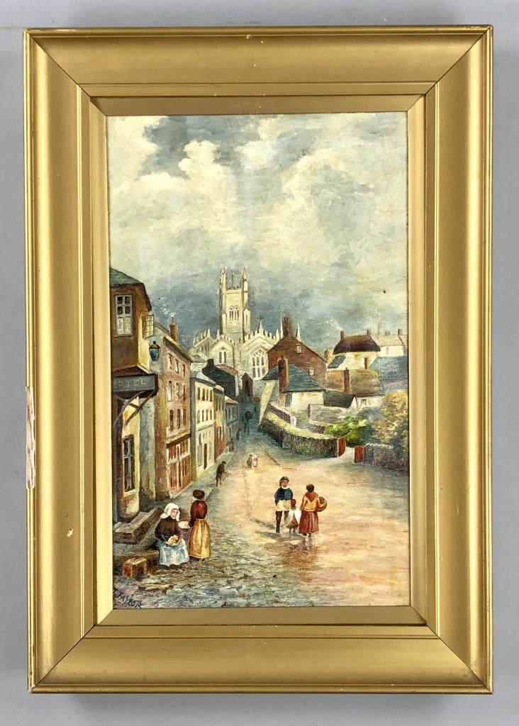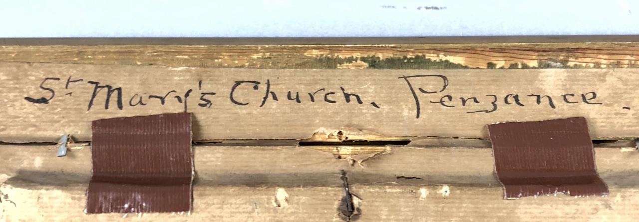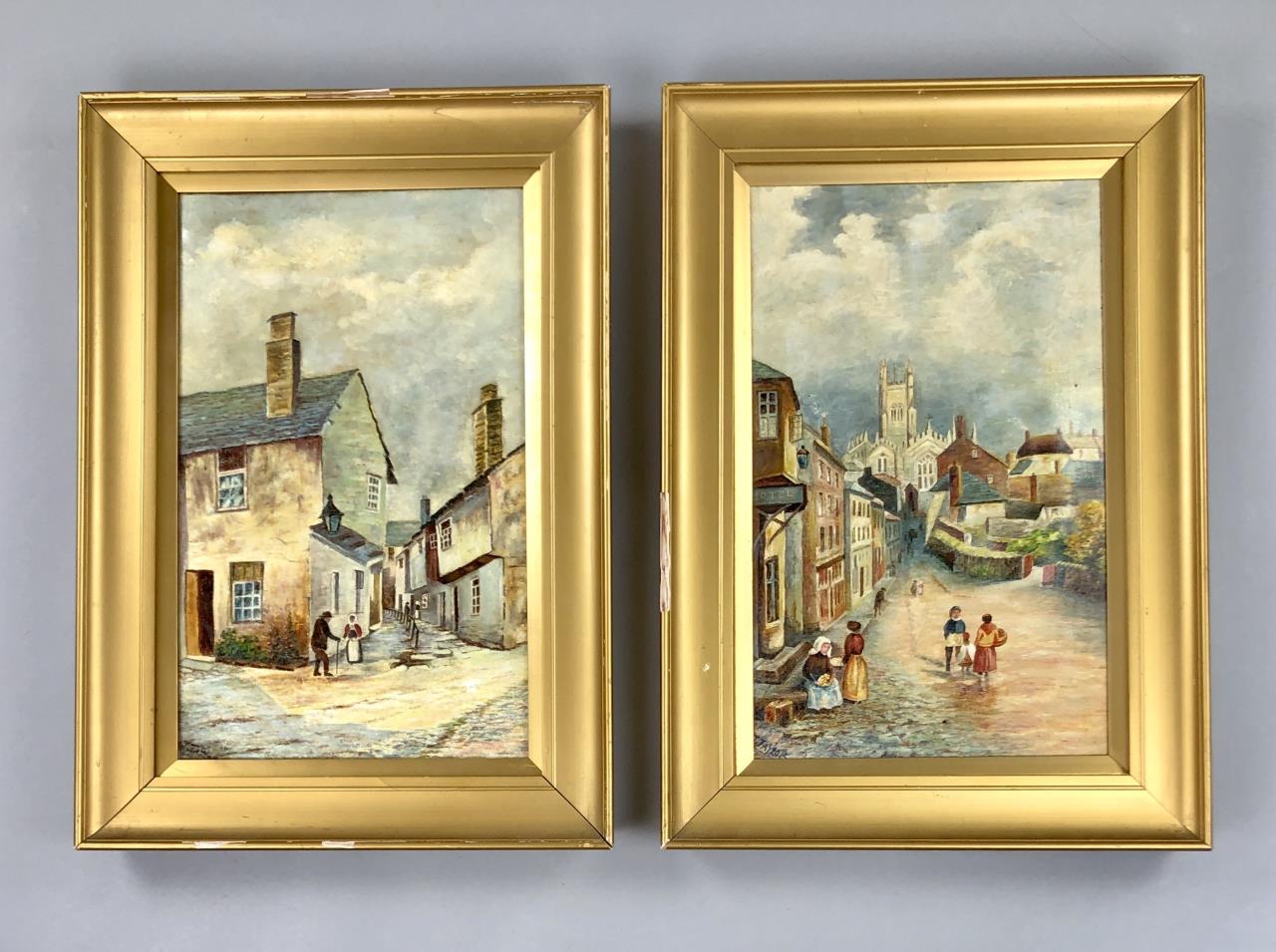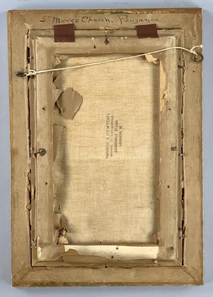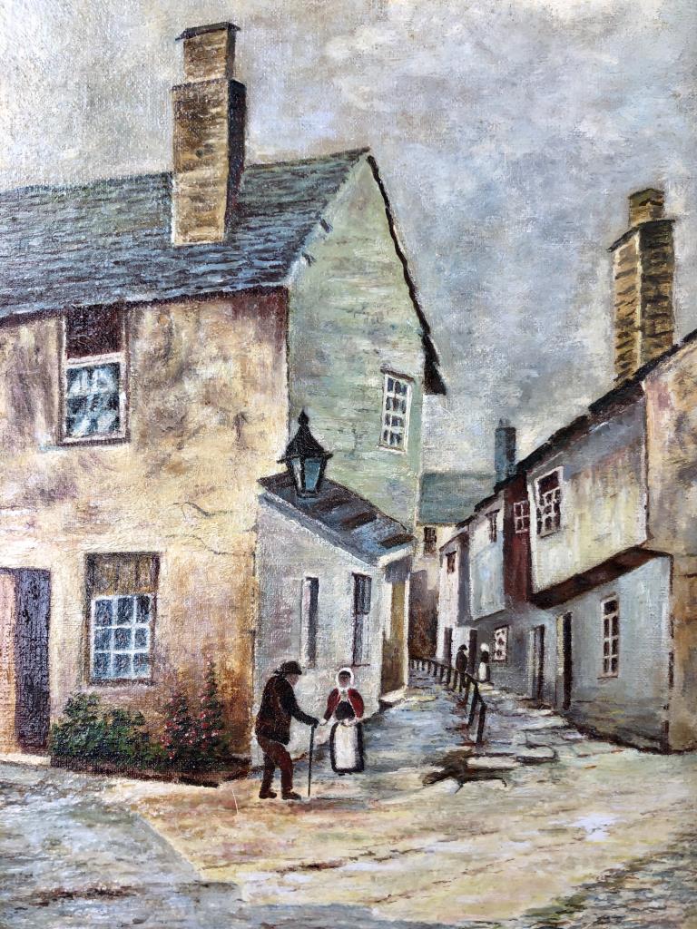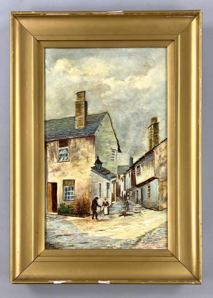 Pair of J. Taylor oil paintings on stretched canvas, depicting scenes in Cornwall (England), written on the back of one “Hawkshead Flag Street” and on the other “St. Mary’s Church Penzance,” circa late 19th Century, in matching period gilt gesso and wood frames measuring approximately 20-1/2″ x 14-7/16″. CONDITION: One canvas has a small puncture and may need to be restretched due to an area of protrusion from the back side. Both frames have some damage and loss to the gilt gesso. SHIPPING: In-House Shipping Available. Please read our Shipping Policies and Terms and Conditions