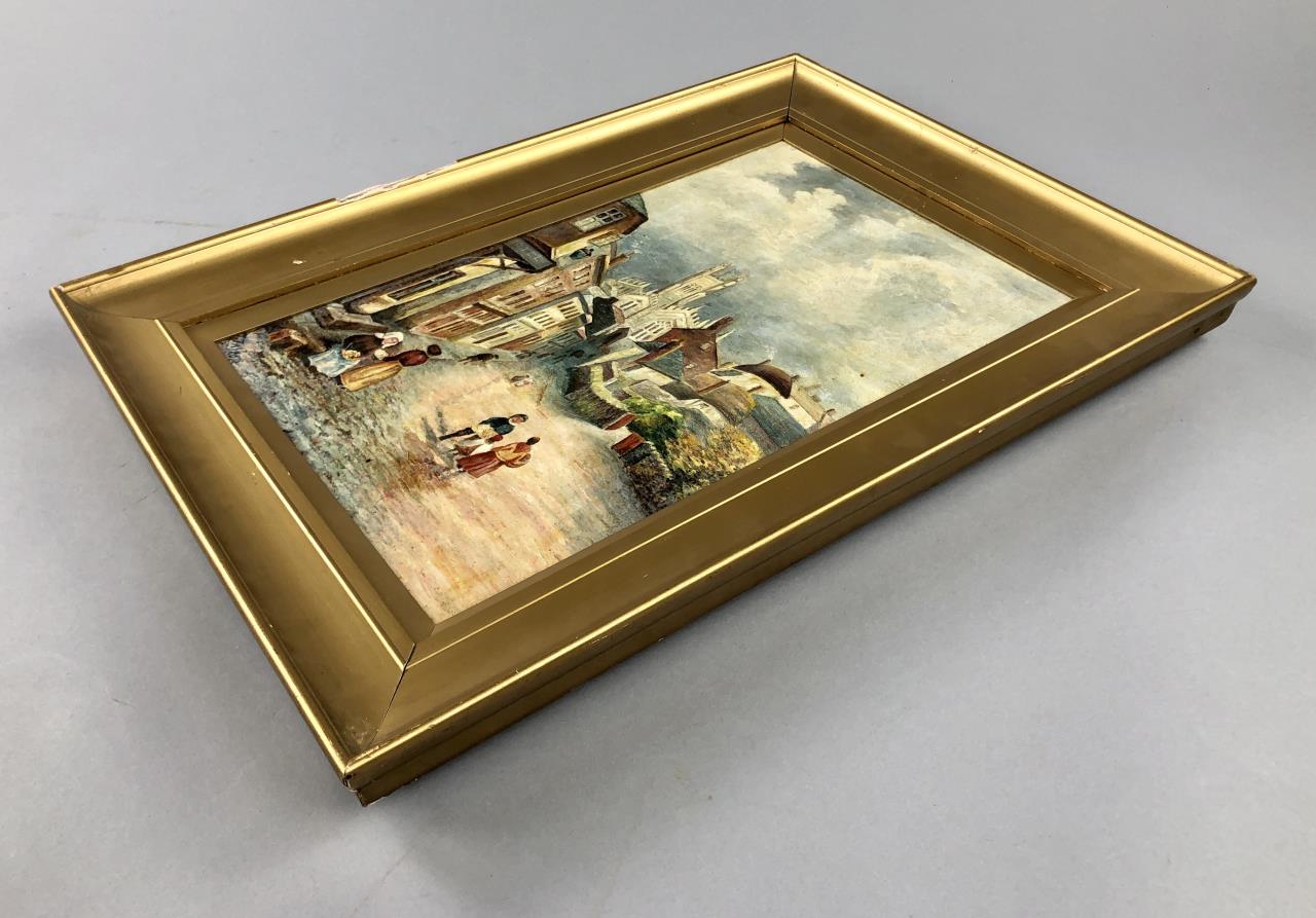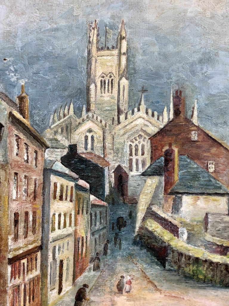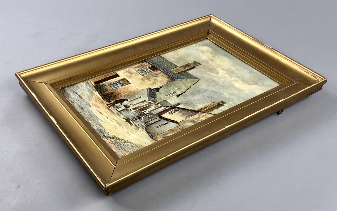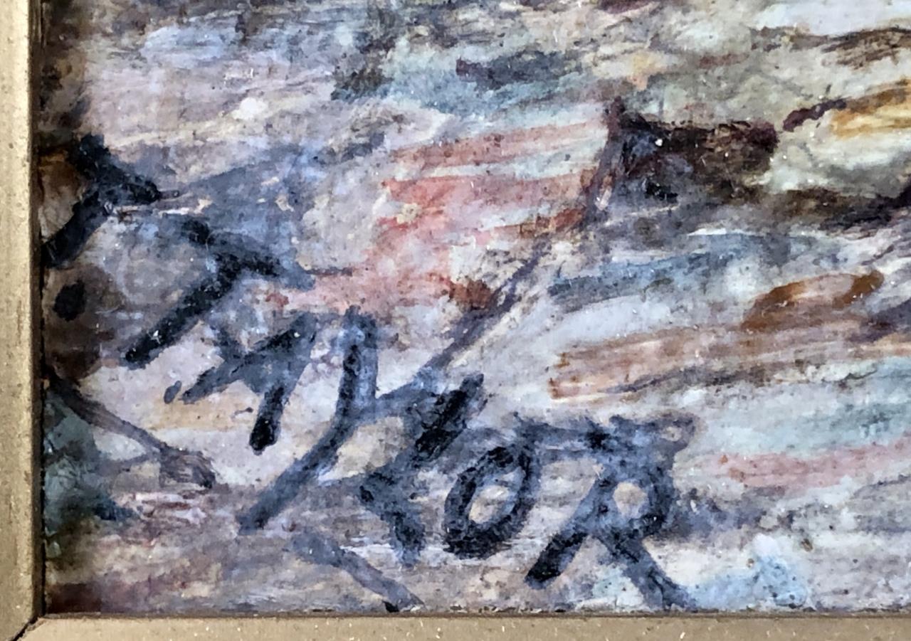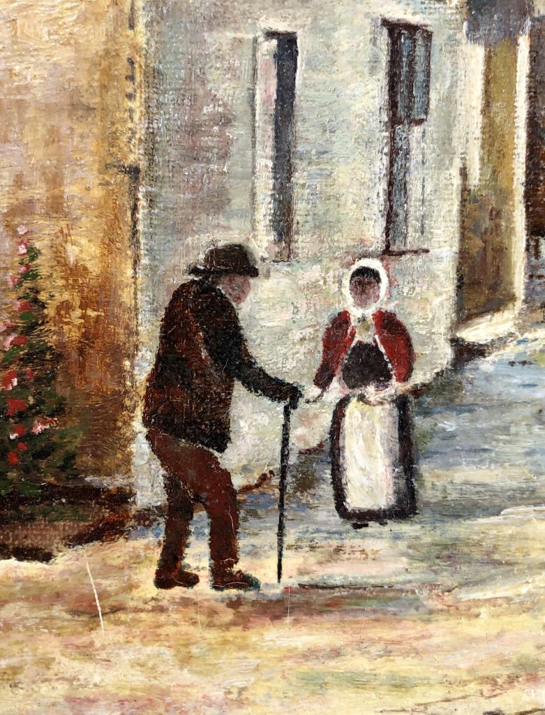 Pair of J. Taylor oil paintings on stretched canvas, depicting scenes in Cornwall (England), written on the back of one “Hawkshead Flag Street” and on the other “St. Mary’s Church Penzance,” circa late 19th Century, in matching period gilt gesso and wood frames measuring approximately 20-1/2″ x 14-7/16″. CONDITION: One canvas has a small puncture and may need to be restretched due to an area of protrusion from the back side. Both frames have some damage and loss to the gilt gesso. SHIPPING: In-House Shipping Available. Please read our Shipping Policies and Terms and Conditions